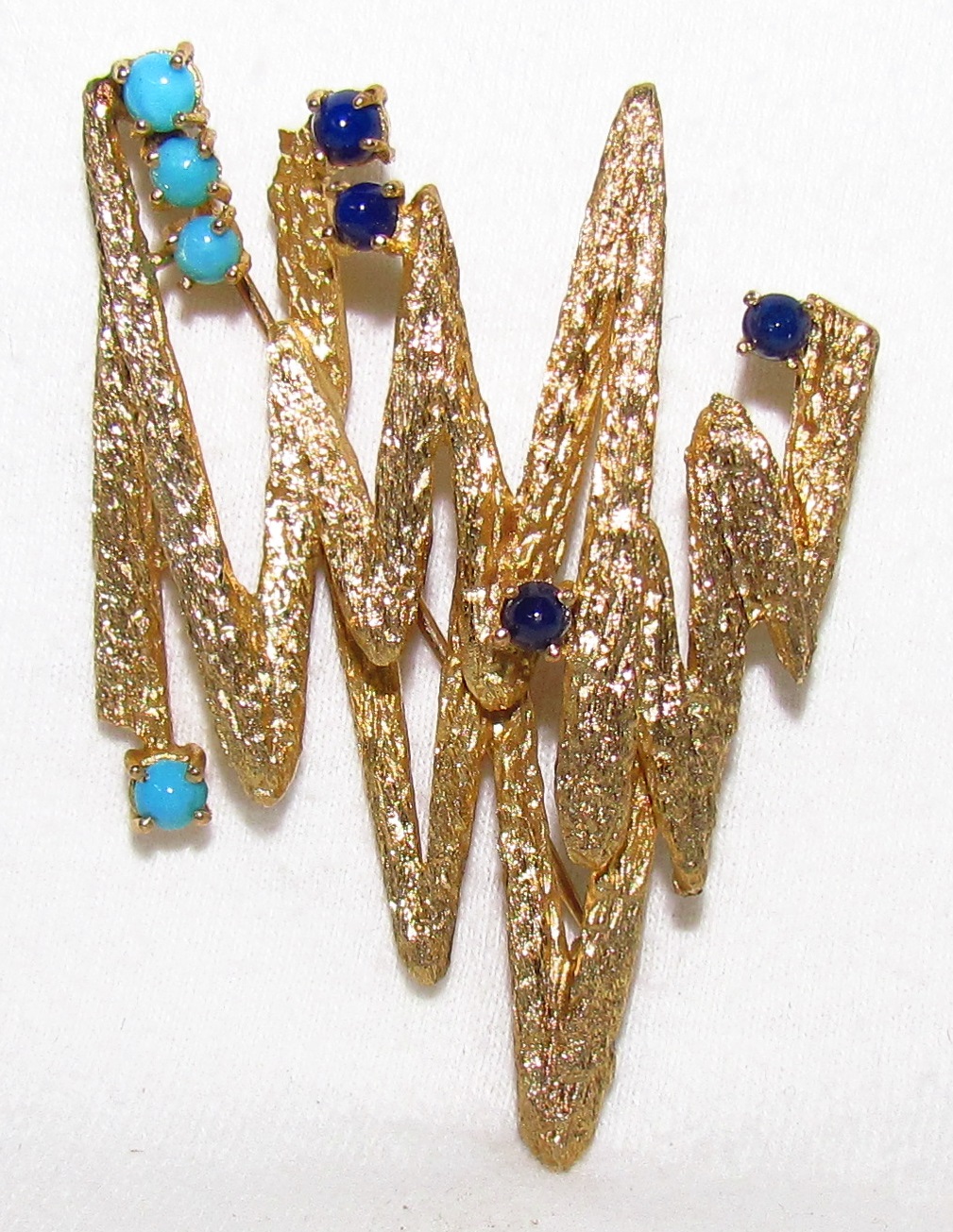 Here is a cast 14K gold mid-century modern brooch set with lapis and turquoise stones and hand chased.