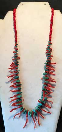 The coral was purchased from Thunderbird Supply in Gallup, NM. It was sold as natural red coral, drilled and slightly polished.
