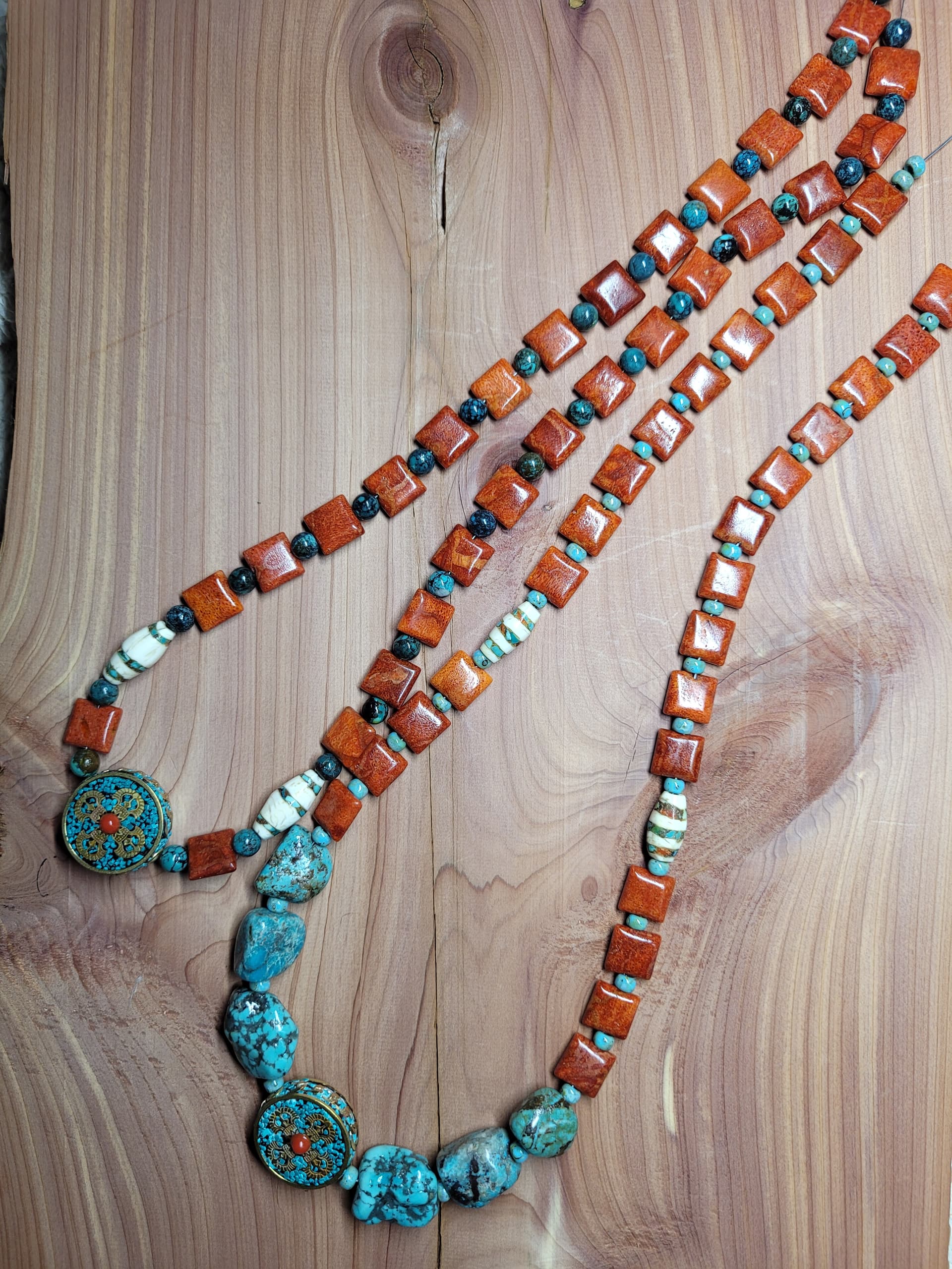 and exspensive but really cool Naga Conch beads with inlay of Turquoise and Coral. The one with the big Turquoise just has glass bead spacers the smaller one has round Turquoise. Let me know what you think.