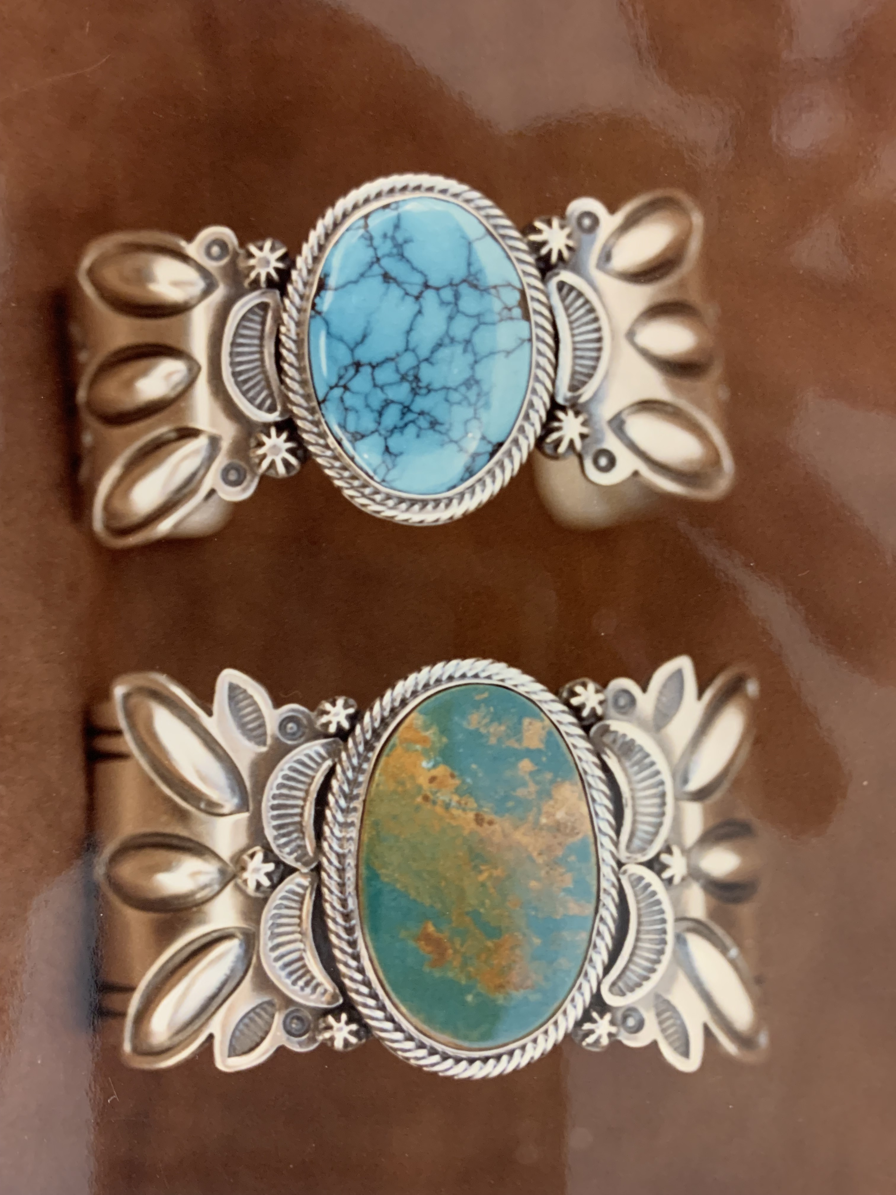 Blue stone looks like Chinese. We worked with a lot of high grade Chinese turquoise for Palms at that time. The green stone could be Cerrillos or a Nevada mine. Mark Del Frate, Palms general manager at the time had terrific Turquoise to work with, and always had the best selection of matched Cerrillos cabs I’ve ever seen. I believe Eddie Mauzy cut a lot of it for him.