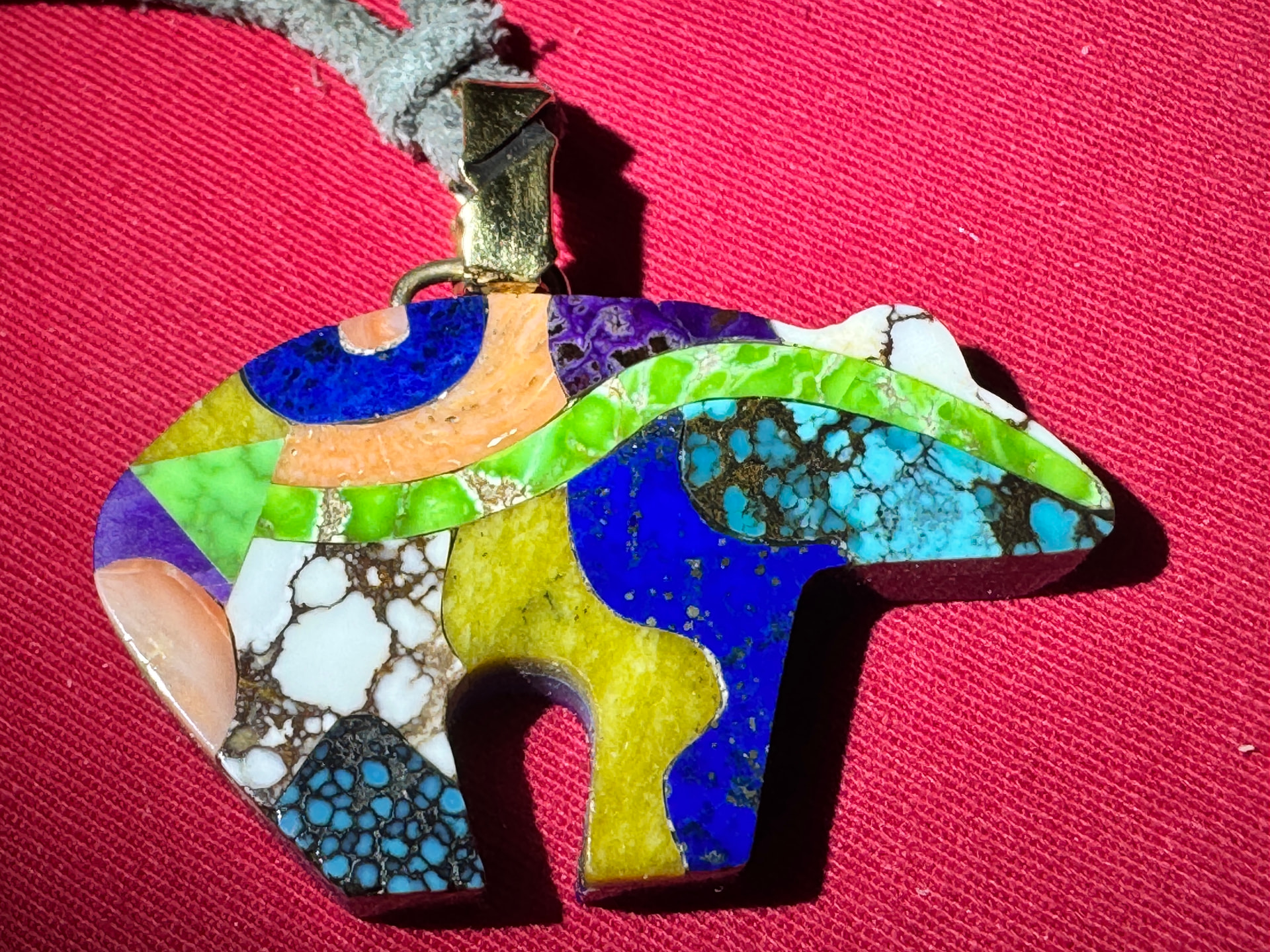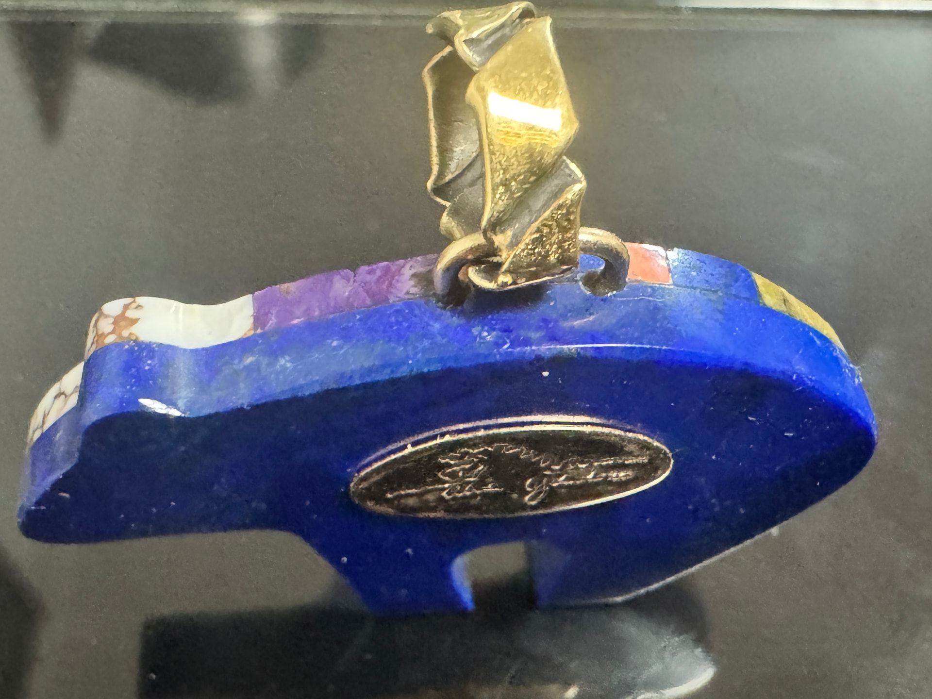 This bear was purchased from a jewelry merchant on eBay at a very reasonable price considering the craftsmanship. The stones used in this pendant are of a higher grade than those seen in silver bear pendants online, such as genuine Carico Lake and gem-quality lapis lazuli.