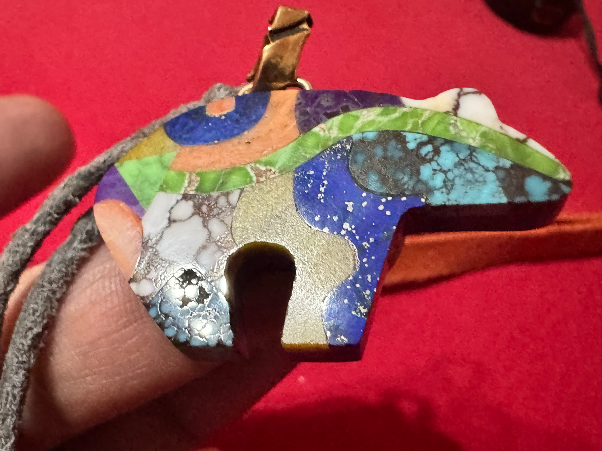 On the last working day before the Chinese New Year, I received double surprises. First, I got a beautiful colorful bear pendant made by Alvin yellowhorse: according to the seller’s description, this pendant is made of 18K gold and various stones. One side of the pendant is inlaid with a flat mosaic of various brightly colored gem-grade stones, while the other side has a golden nameplate inlaid in the middle of lapis lazuli. The nameplate bears Alvin yellowhorse‘s hallmark, but I didn’t see the 18K mark.