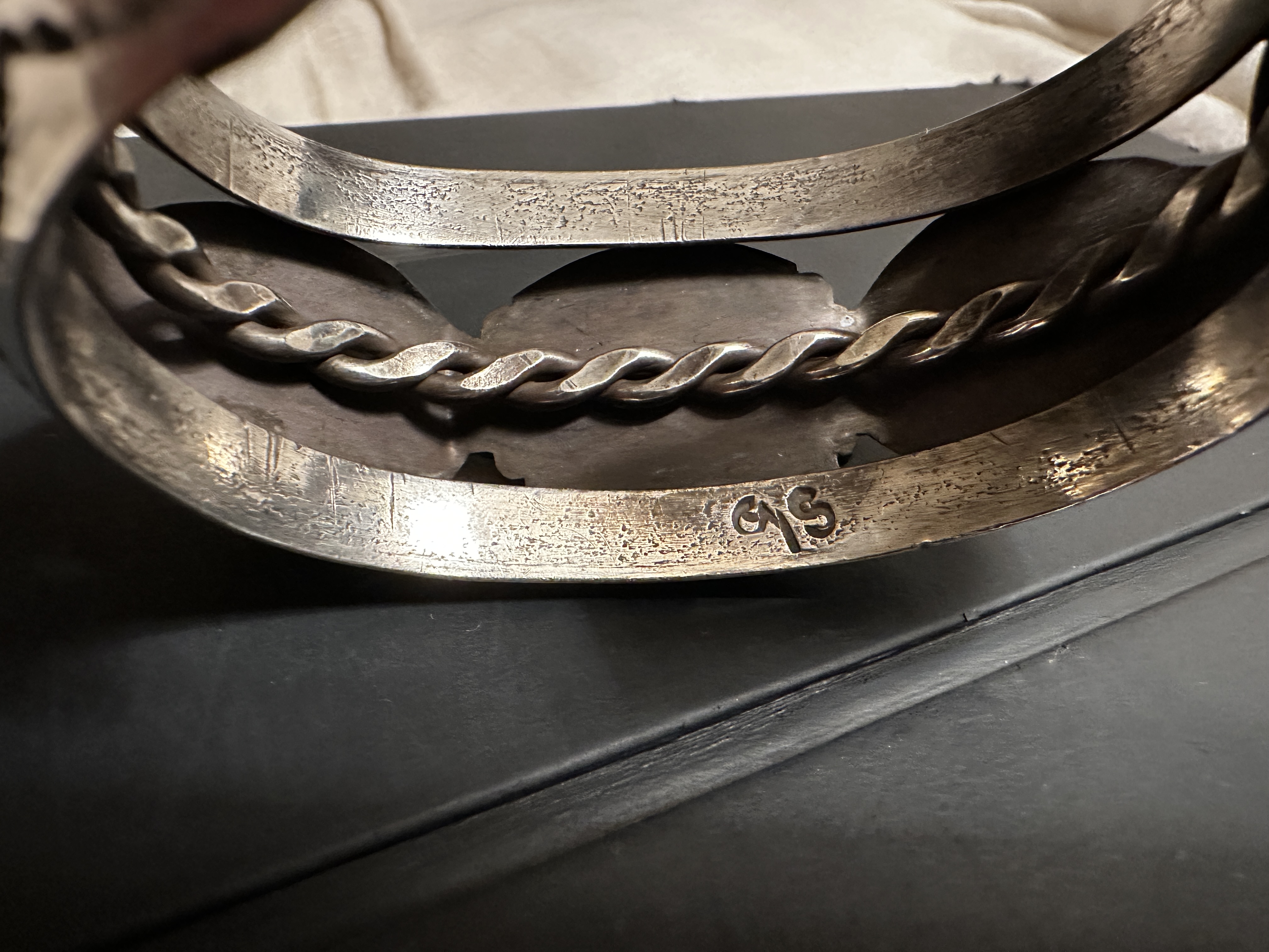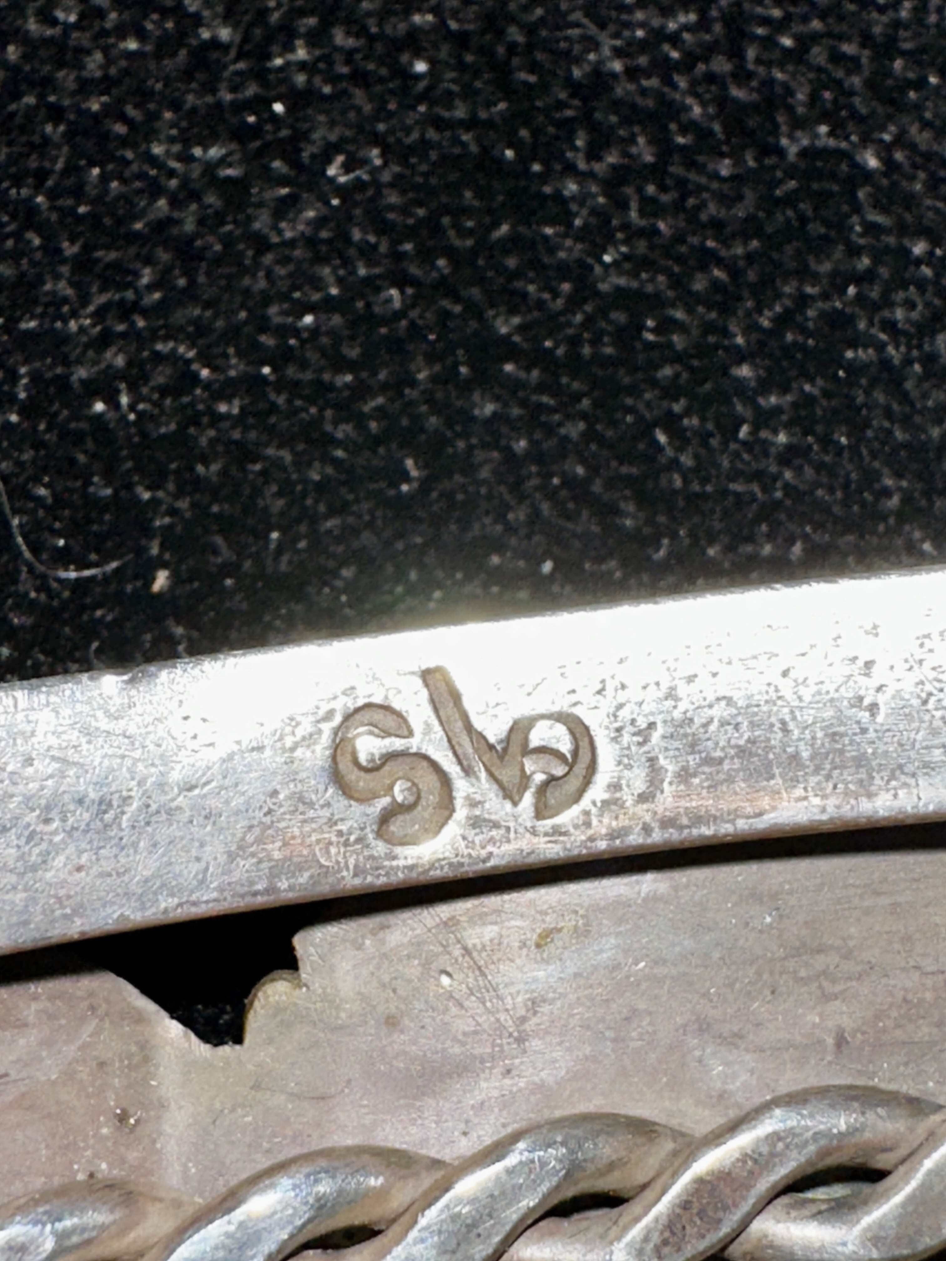 One of my favorite bracelets. I’d love to know who made it. The “s” is quite clear. The other half is a mystery to me. Which is first? Up/down?