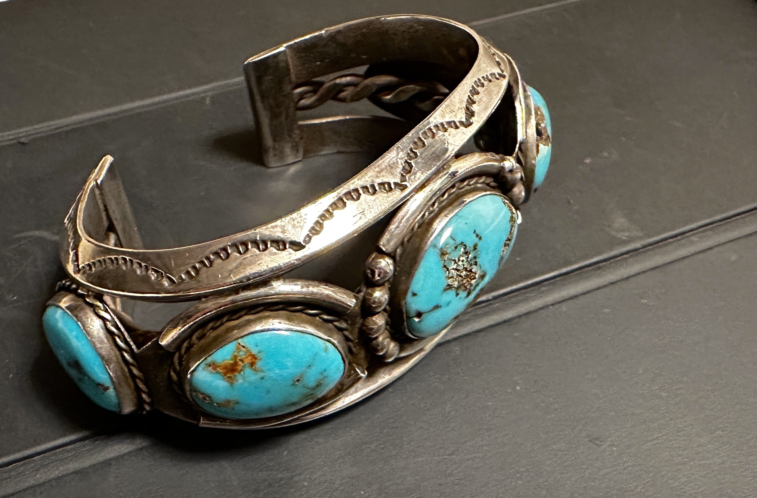 I feel like I’ve seen this hallmark, but I can’t find it now. I found something similar that was unidentified, but it wasn’t quite close enough. The ring definitely has a Navajo look, but there’s really no way to say for sure what mine the turquoise came from; it’s always a guessing game without actual provenance from the maker.