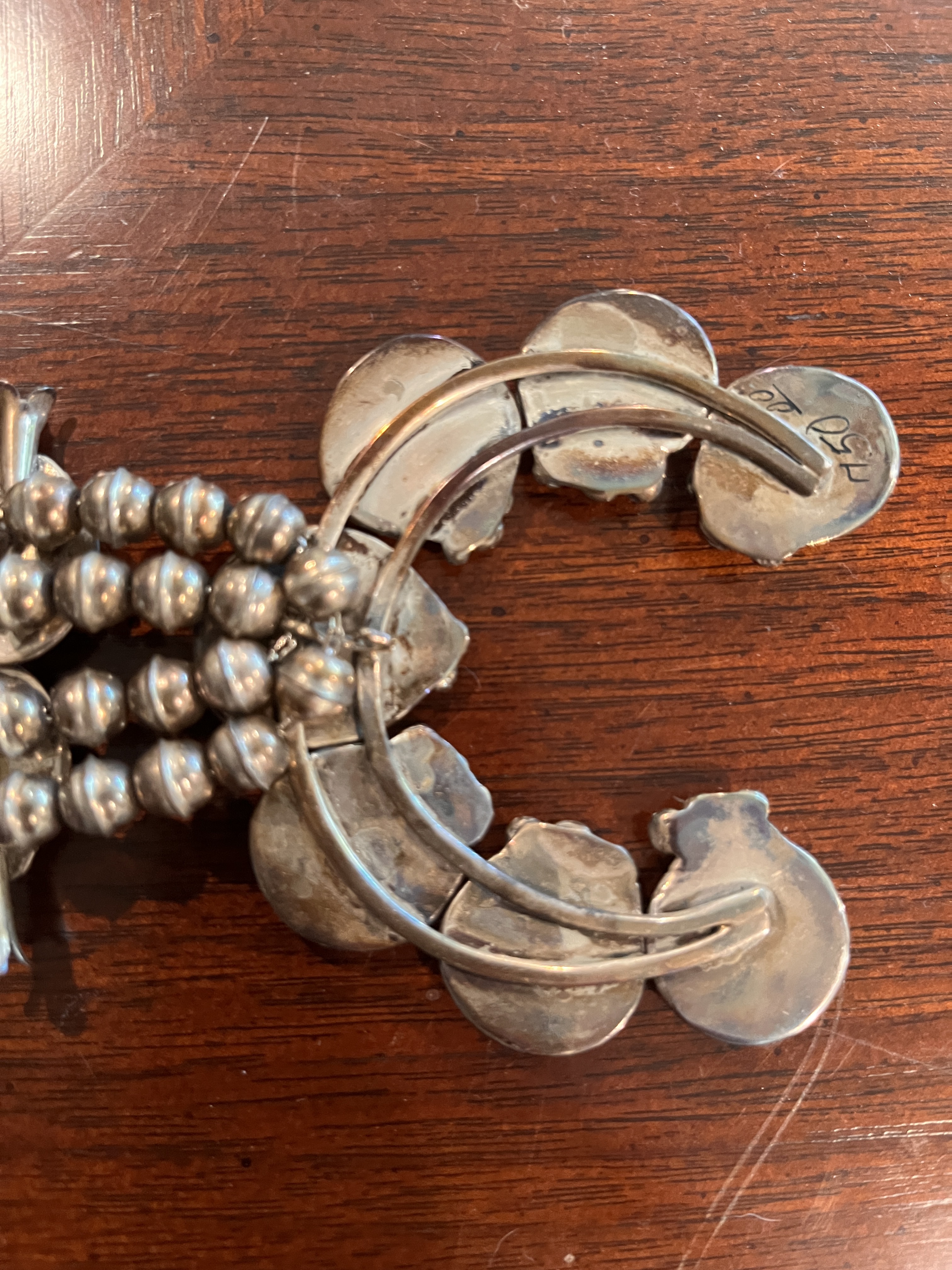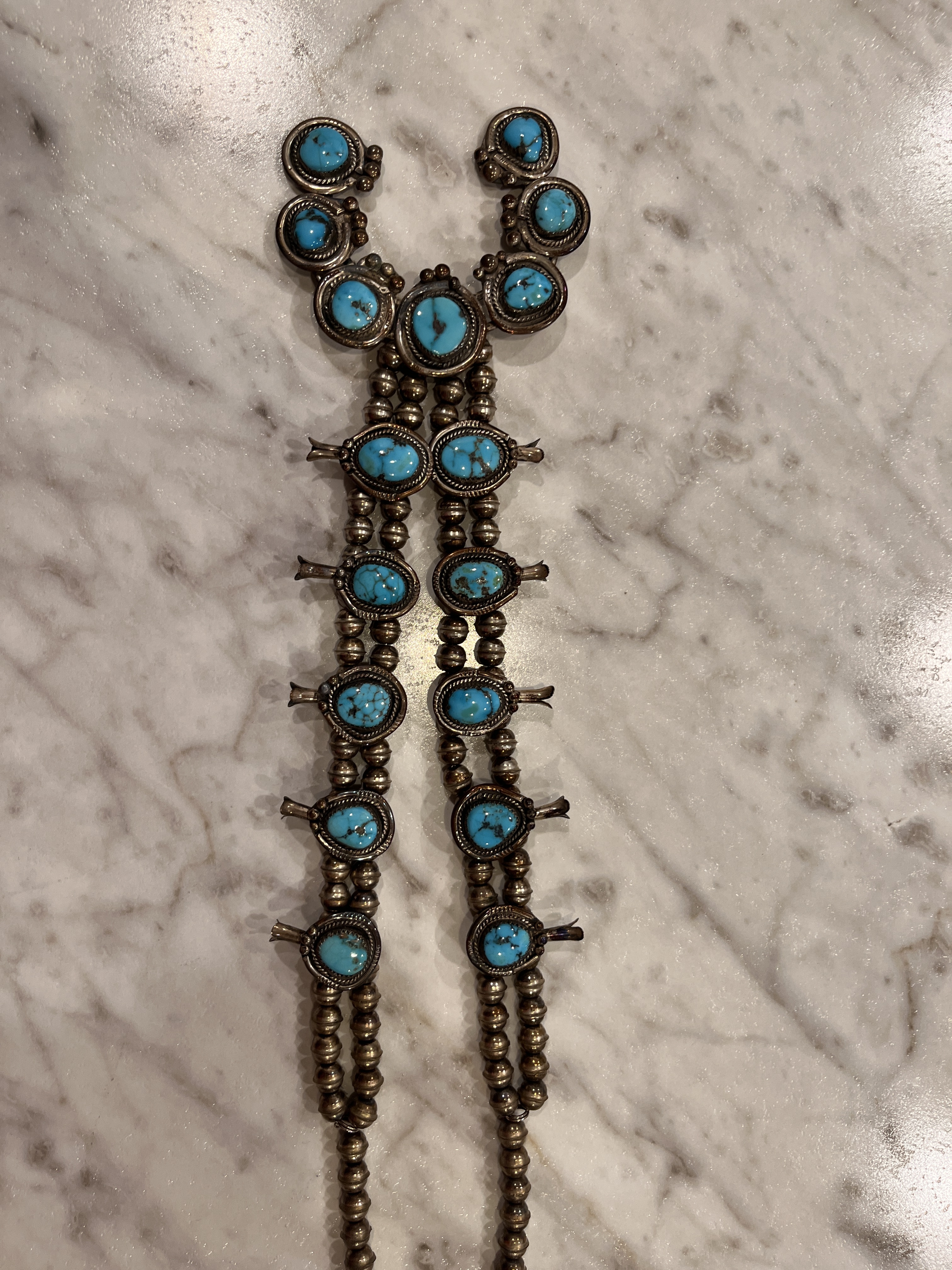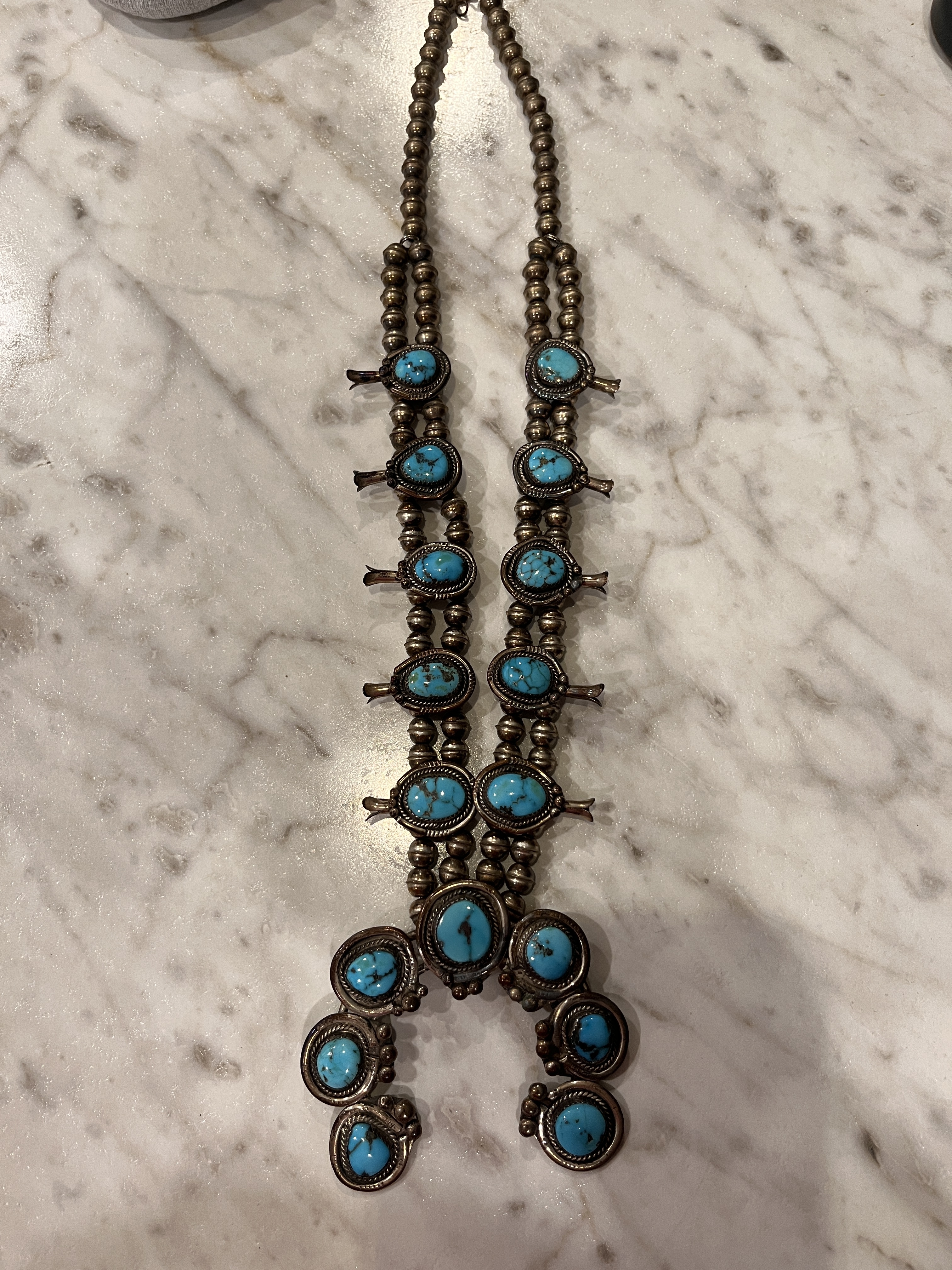 Looks to be a pretty typical 1970’s Navajo squash blossom. Around this time the number of squash blossoms exploded due to the increased popularity of NA jewelry. They also usually feature bench beads (as here)–machine made halves soldered together in assembly line fashion, and stabilized turquoise. I don’t believe yours is marked or hallmarked, so it will be hard to attribute it to a specific artist. Pretty necklace!