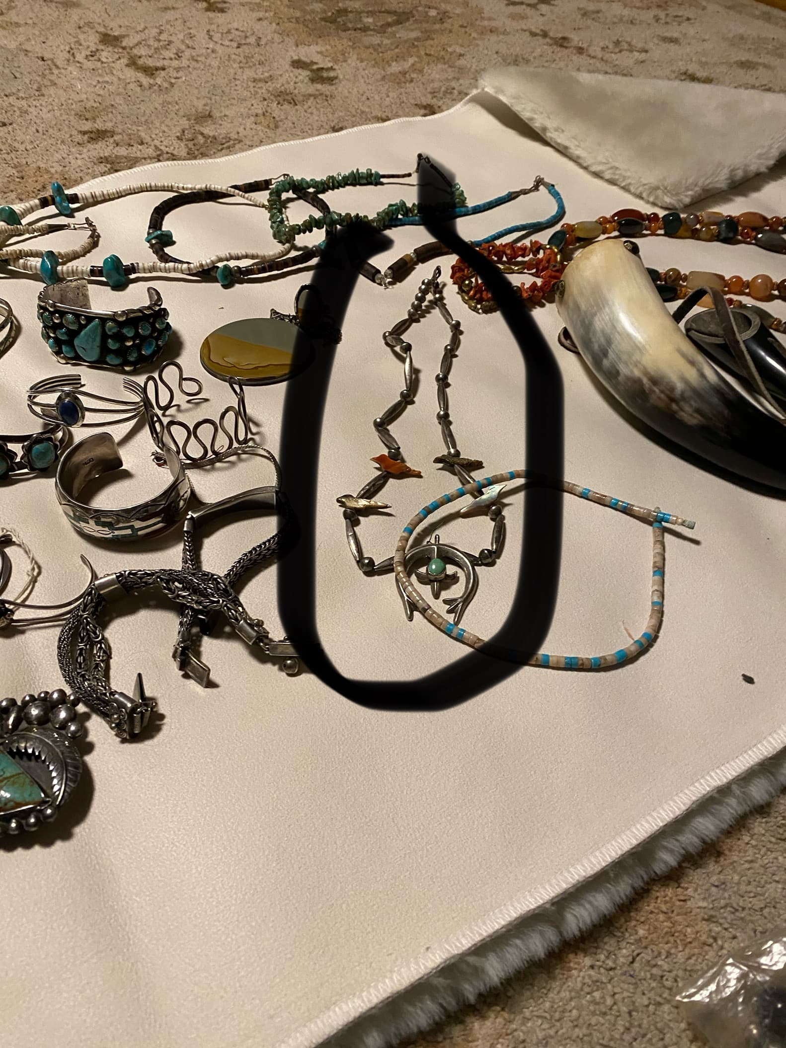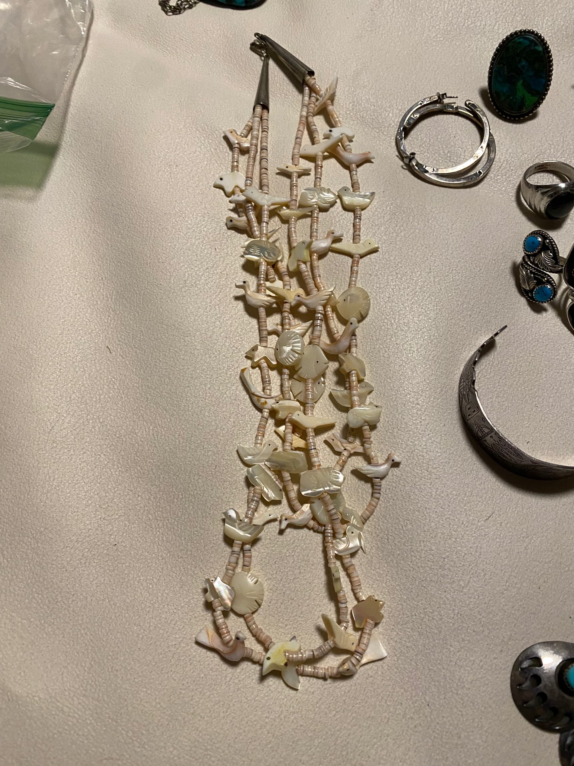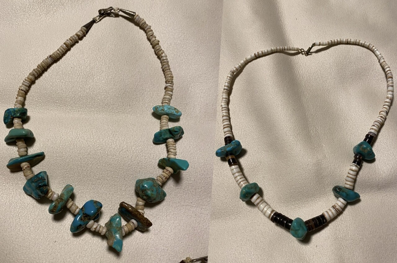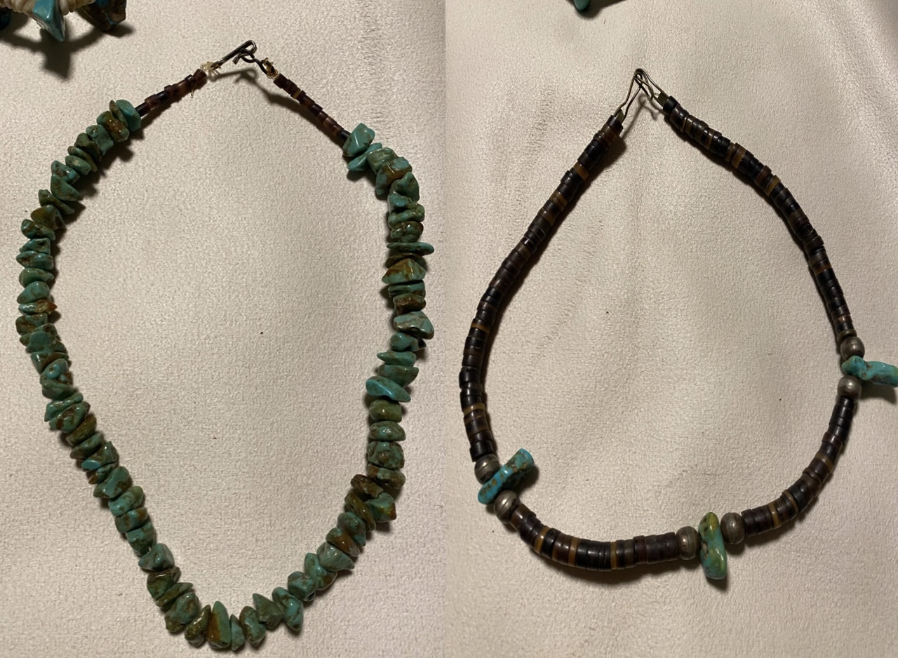 hello all I’m just going through some more of my grandmother‘s things and would like some opinions on these necklaces. The Heishi and the beaded ones tend to scare me because I know more often than not they’re imported or at least the imports flooded the market. any info at all would be greatly appreciated. I am very grateful to be a part of such a knowledgeable group and I appreciate each & every one of you. (I do apologize and understand if the mother of pearl heishi isnt allowed as it is not turquoise if it isn’t allowed just let me know and I will be happy to remove it ) thanks again