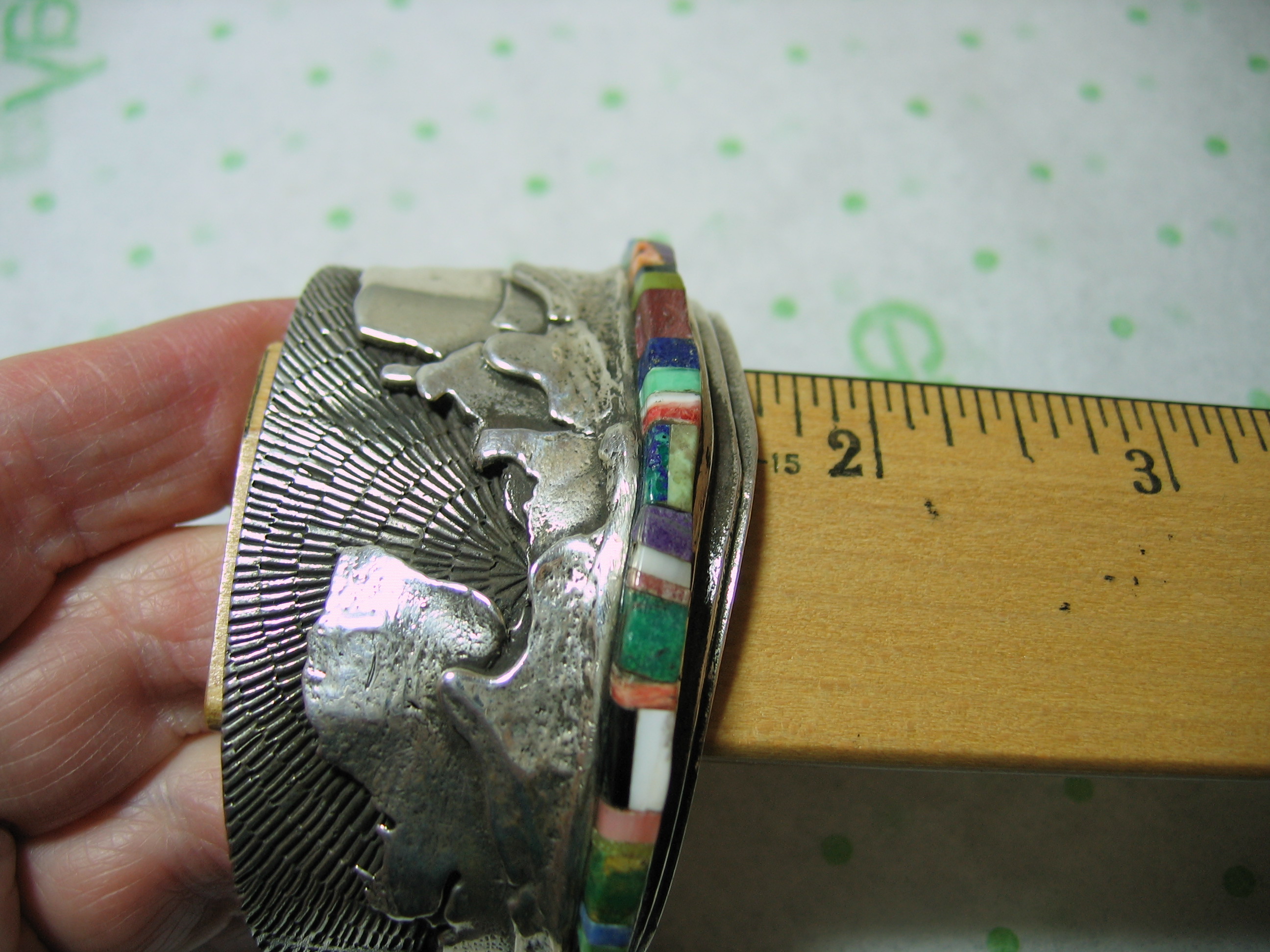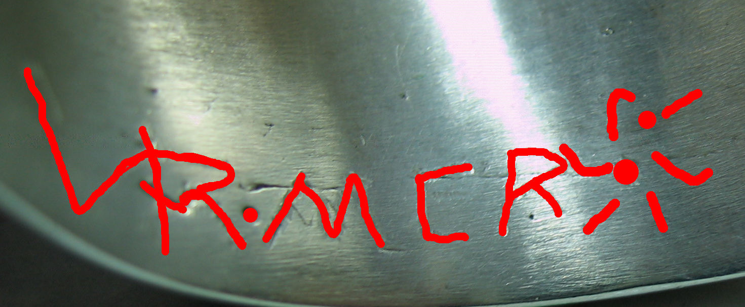 This is an extremely heavy cuff with hand etched marking. Looks like RMER with a sort of sunburst etched in mark.Cuff weighs 122 grams!!