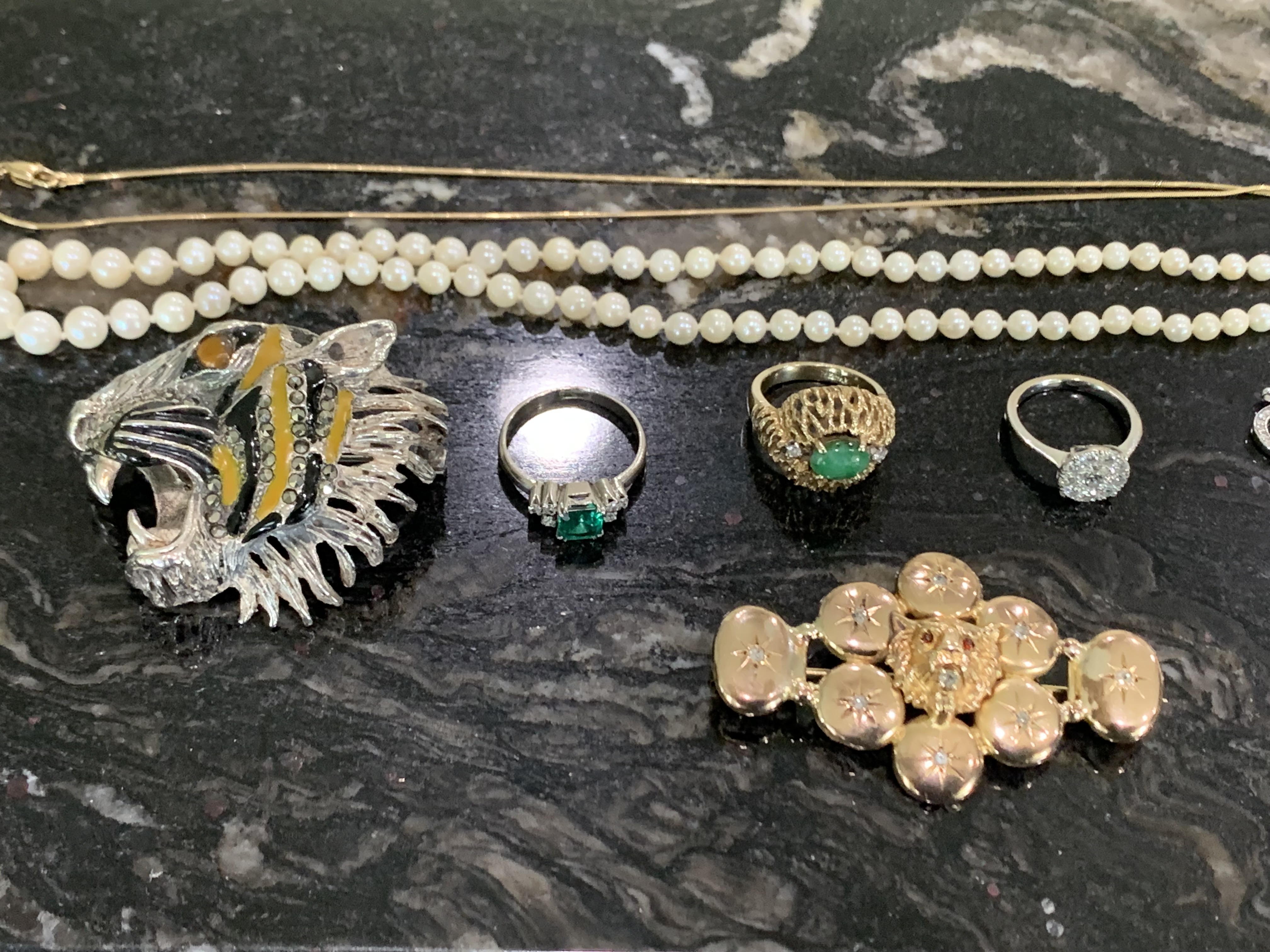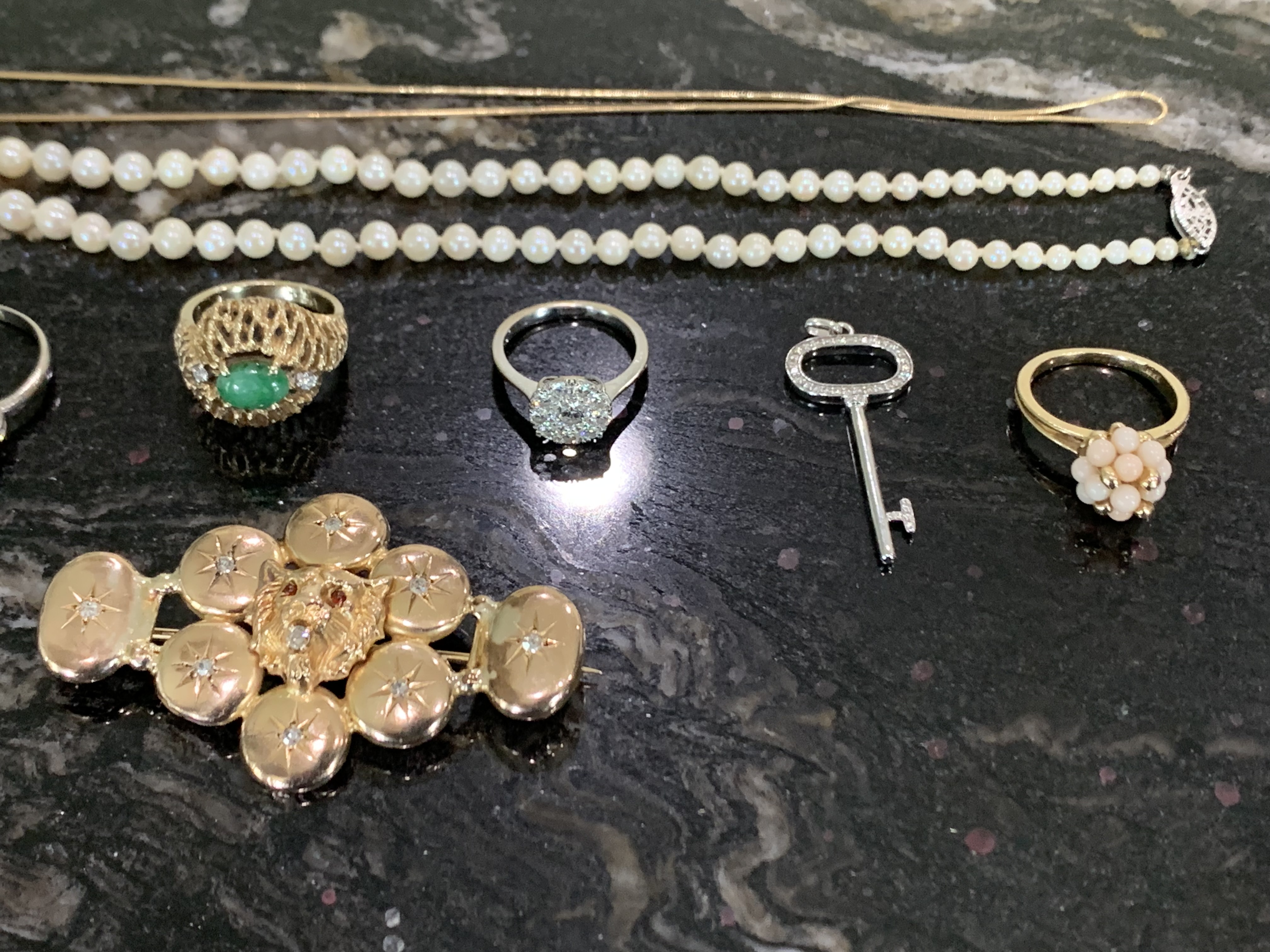 The 14k Jadeite diamond ring was $95, 14k coral ring was $65, the sterling lion was $50 (it reminded me of the gucci lion that is gold tone so I had to buy it). It’s heavy and sags on my shirts. The 14k diamond key was $25, the Pearls were $5 and the chain was $80 to replace my broken chain. All those pieces I found at a consignment shop. The 18k 1ct diamond cluster, 10k pin and 14k emerald ring were all saved for being scrapped. I had a few broken chains that I took to the this jeweler to be repaired and the repair was too much, so I junked them and ended up getting all three for $150 plus the broken chains. I saw the pieces in a box and asked about them and he let me trade