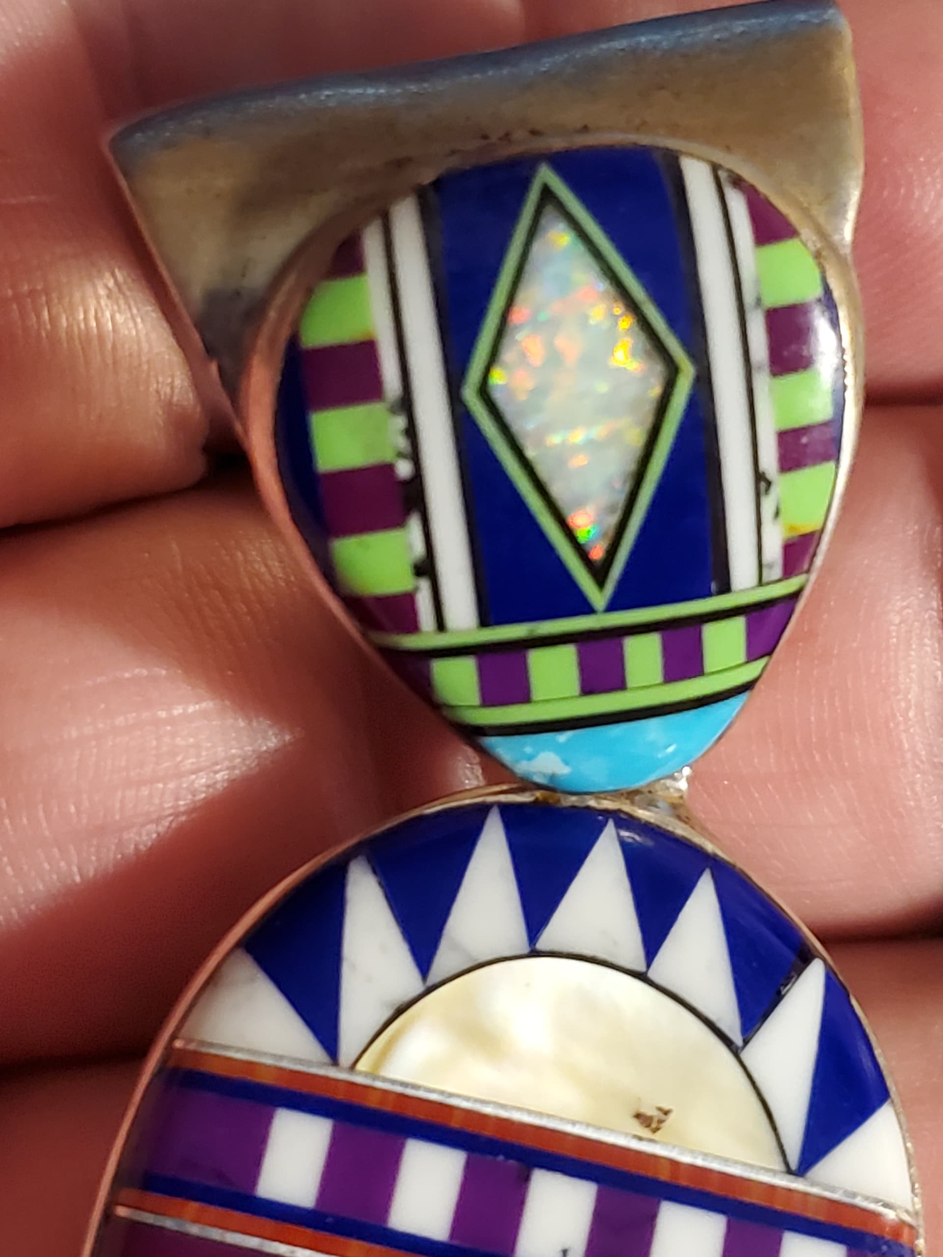 There is a Kay Johnson, Anglo, who makes “Southwest” style jewelry, but it’s nothing like this. It’s cabs of turquoise in silver settings in the manner of conventional Navajo work. I haven’t seen anything in the micromosaic style by them. I agree this is probably Phillippines imitation stuff. The garish colors, indeterminate design, the faux opal, all of it–