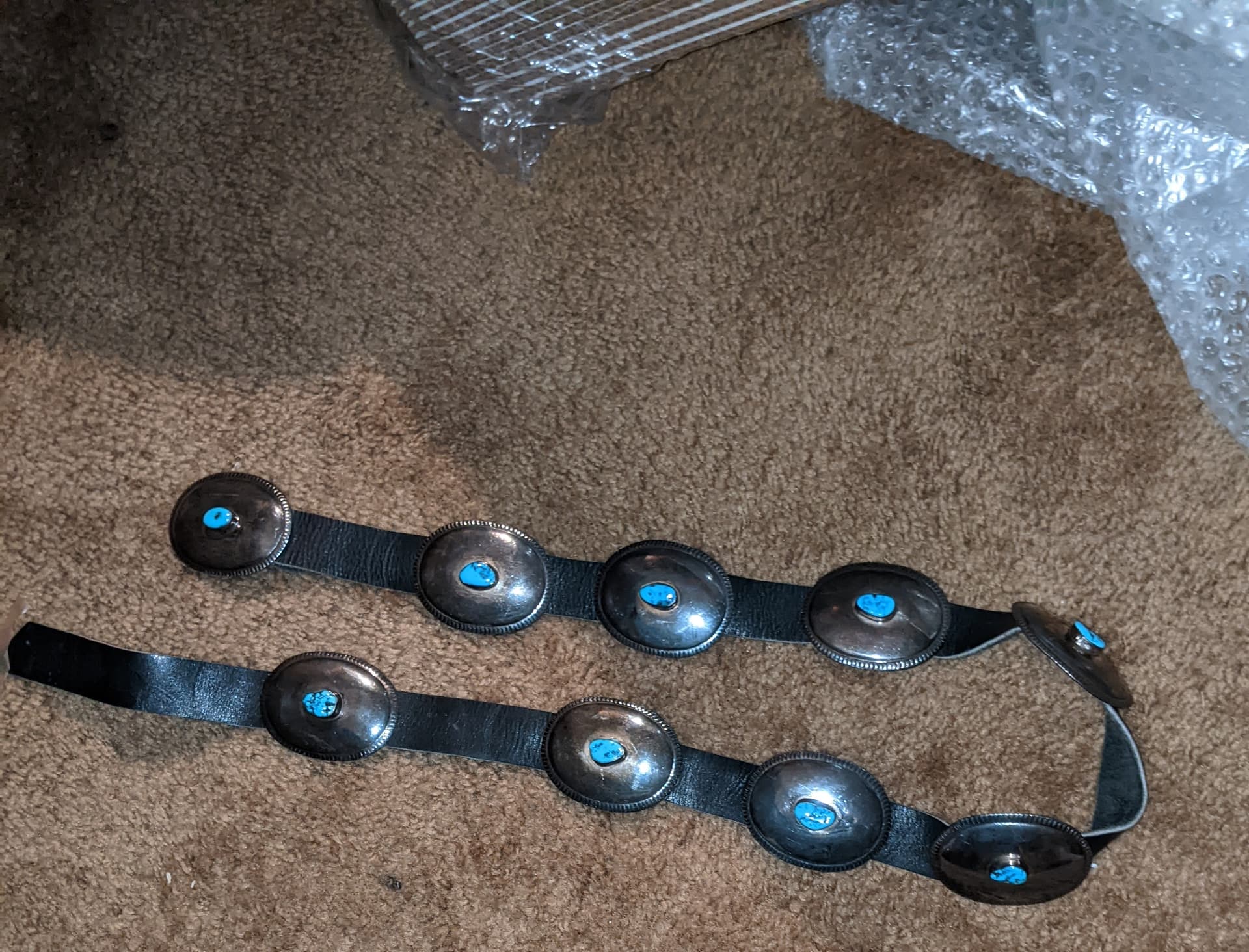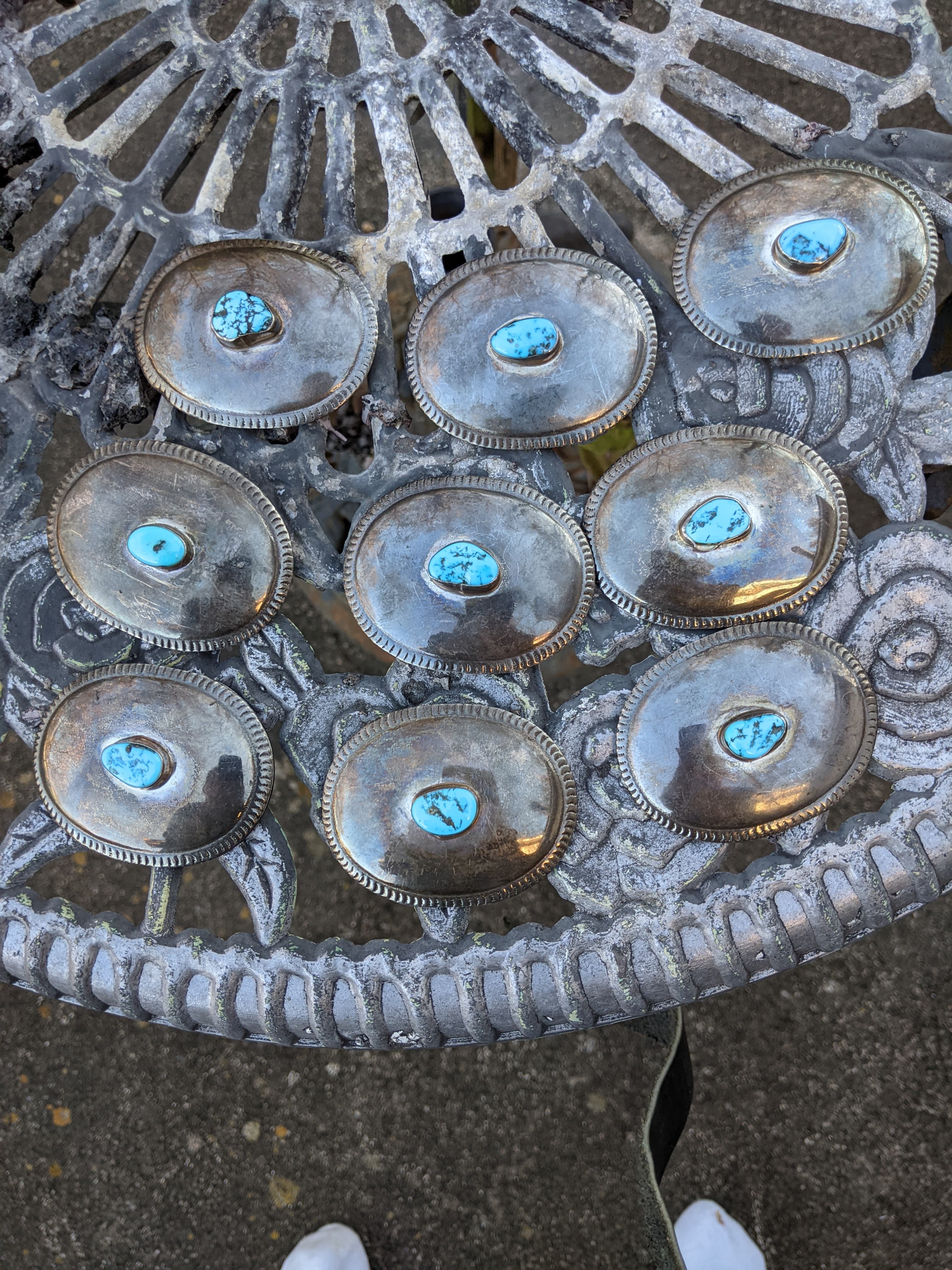 I bought this about 6 months ago. Only markings is an affixed sterling block on the buckle.Conchos are about 2.5 by 1.75 inches. 1 inch belt and copper belt guides. Rather small as is 26-28 inches. 4 extra inches before 1st hole. Conchos weigh 14-15 grams each Any idea on value? Been tested for silver content already