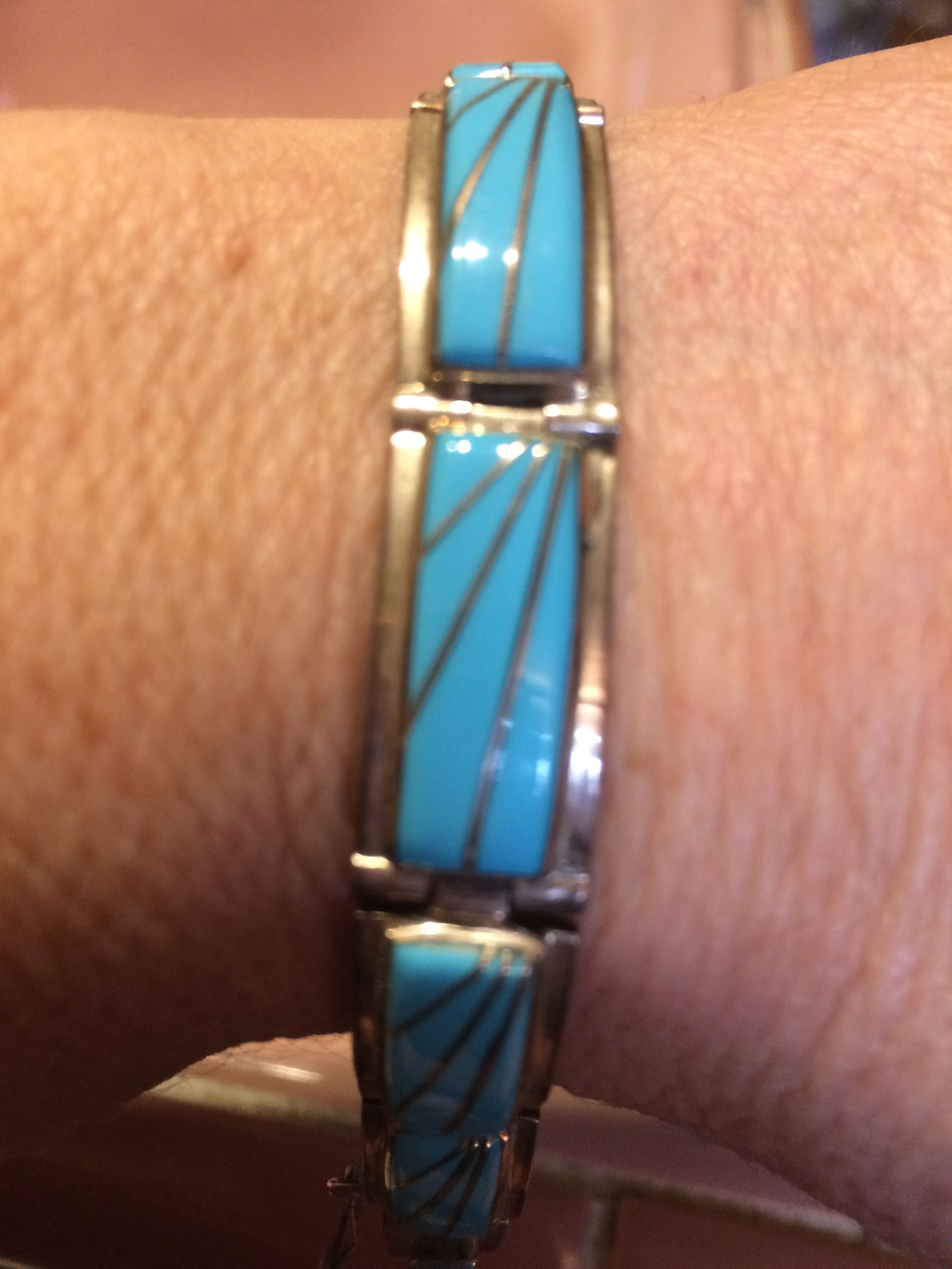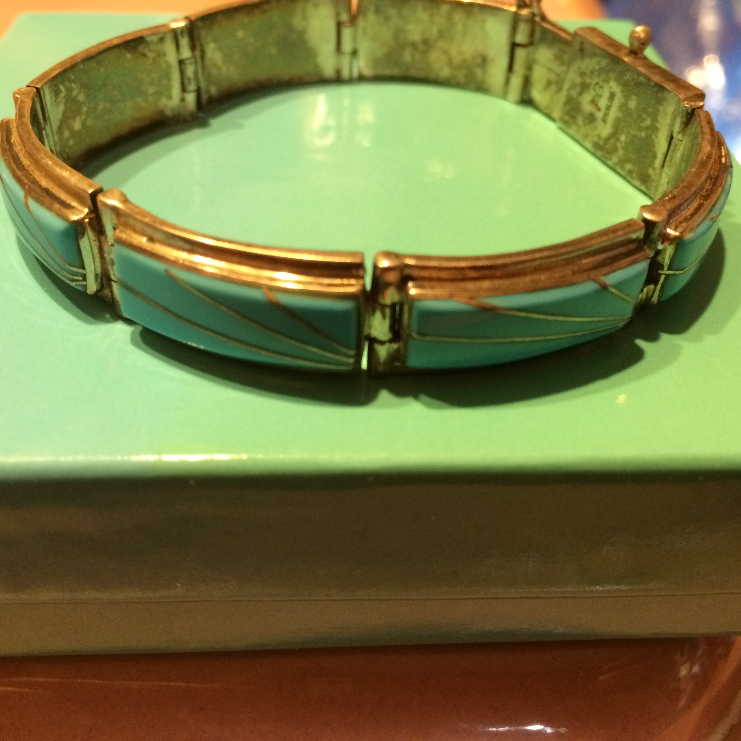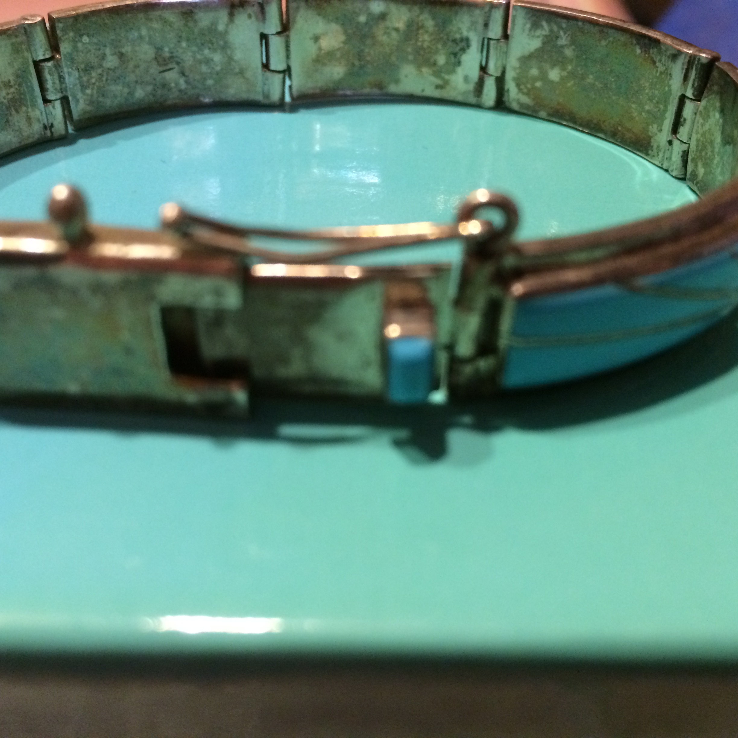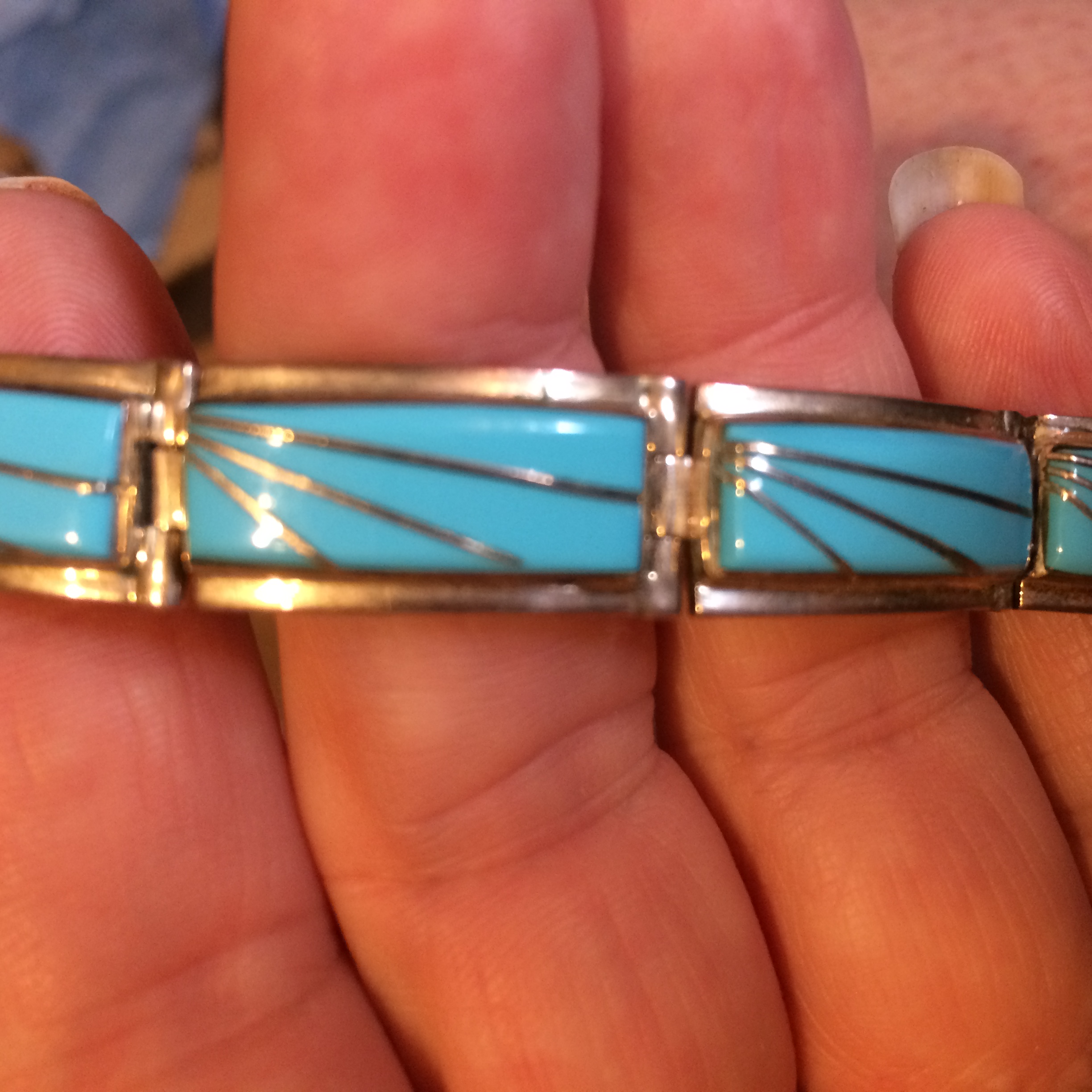The hallmark looks to say PB STERLING. The turquoise is a little blurry in these photos but from what I can tell it looks to be block turquoise.