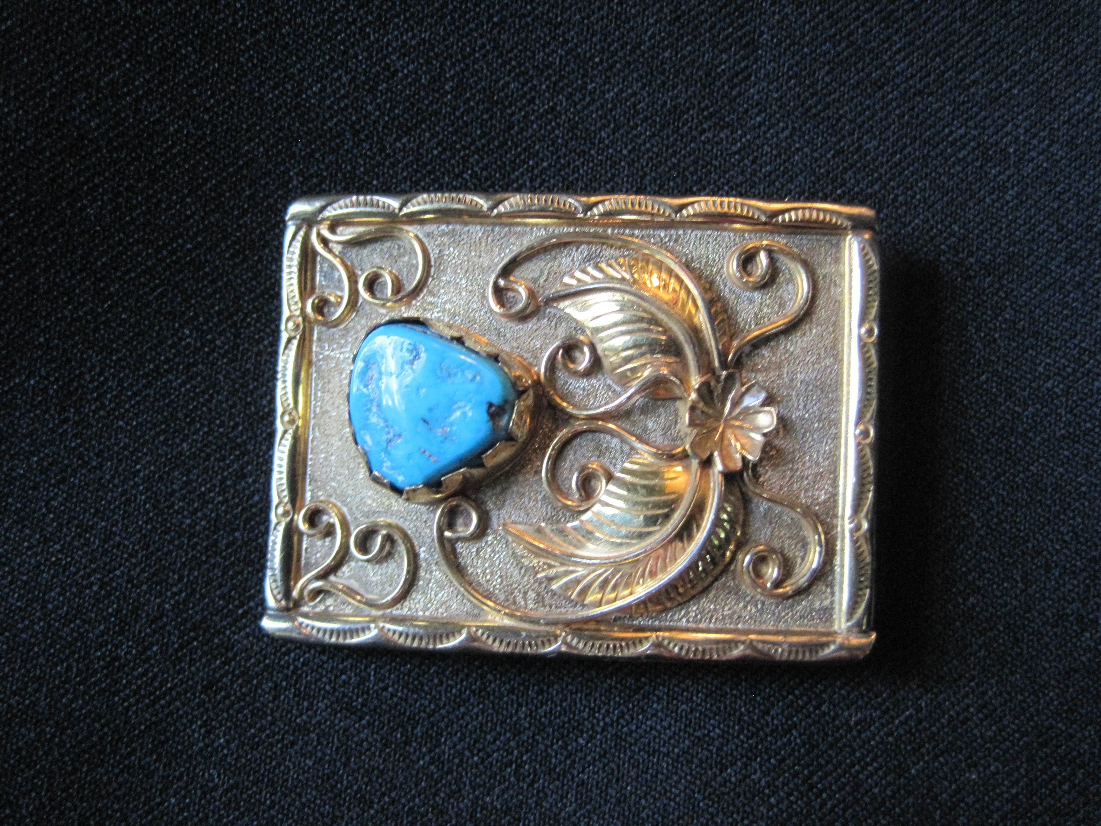 Hello, thanks for sharing. This buckle is a Navajo made piece. The piece of turquoise could be Sleeping Beauty. I would call this 1980s - 90s. It is difficult to tell from the picture what exactly is the gold fill and what is the silver. I am assuming the leaf work is the gold fill, possibly the bezel around the stone? Gold fill looks nice against silver and is a replacement for those who don’t want to pay the high price of real gold. I came across the name Wilson Yazzie who was active beginning in the 1970s, this is possibly your maker. It has an interesting buckle back, more the style you see on a concho belt. It might be a tight fit for a regular leather belt. Hope this helps.