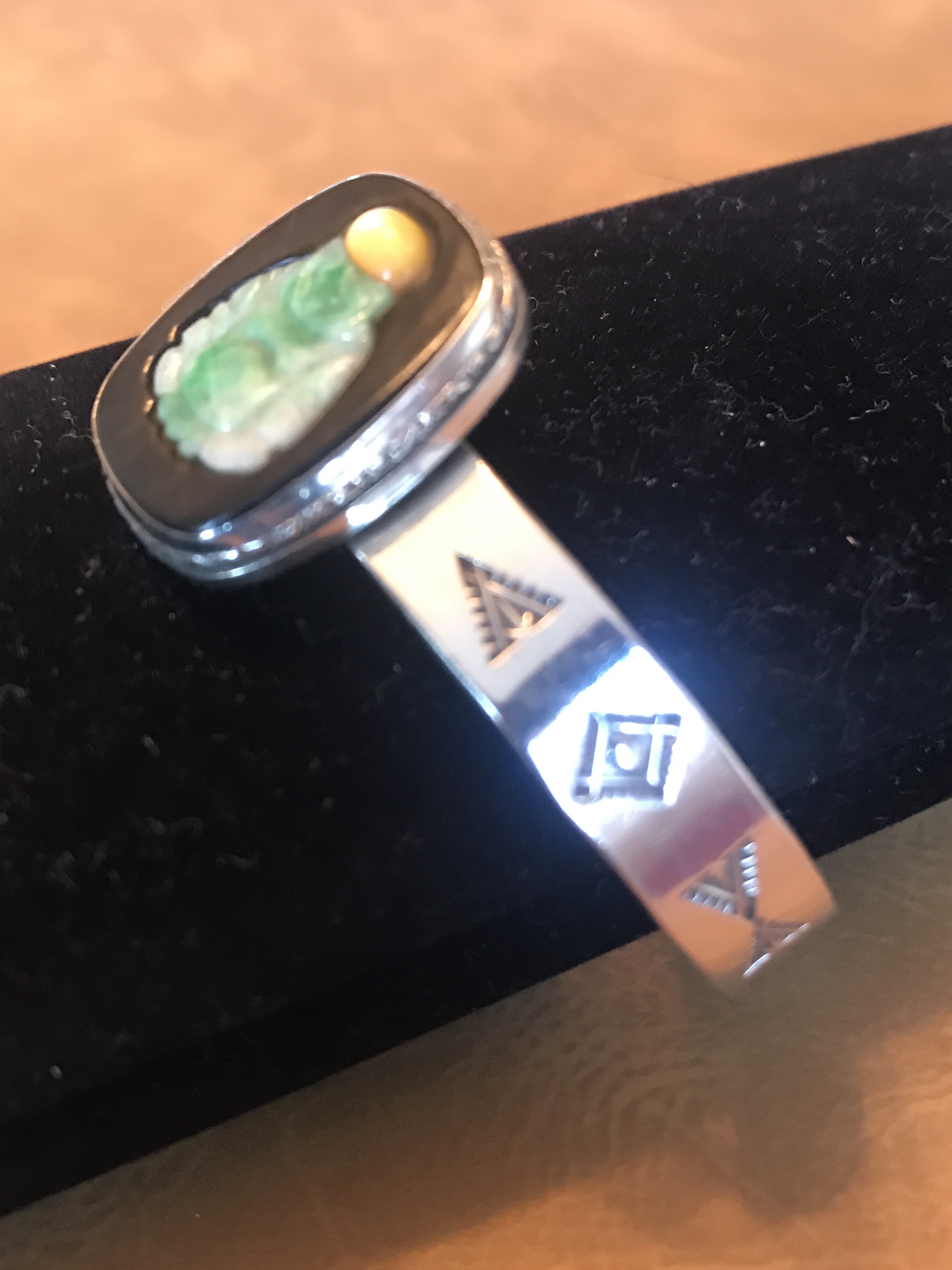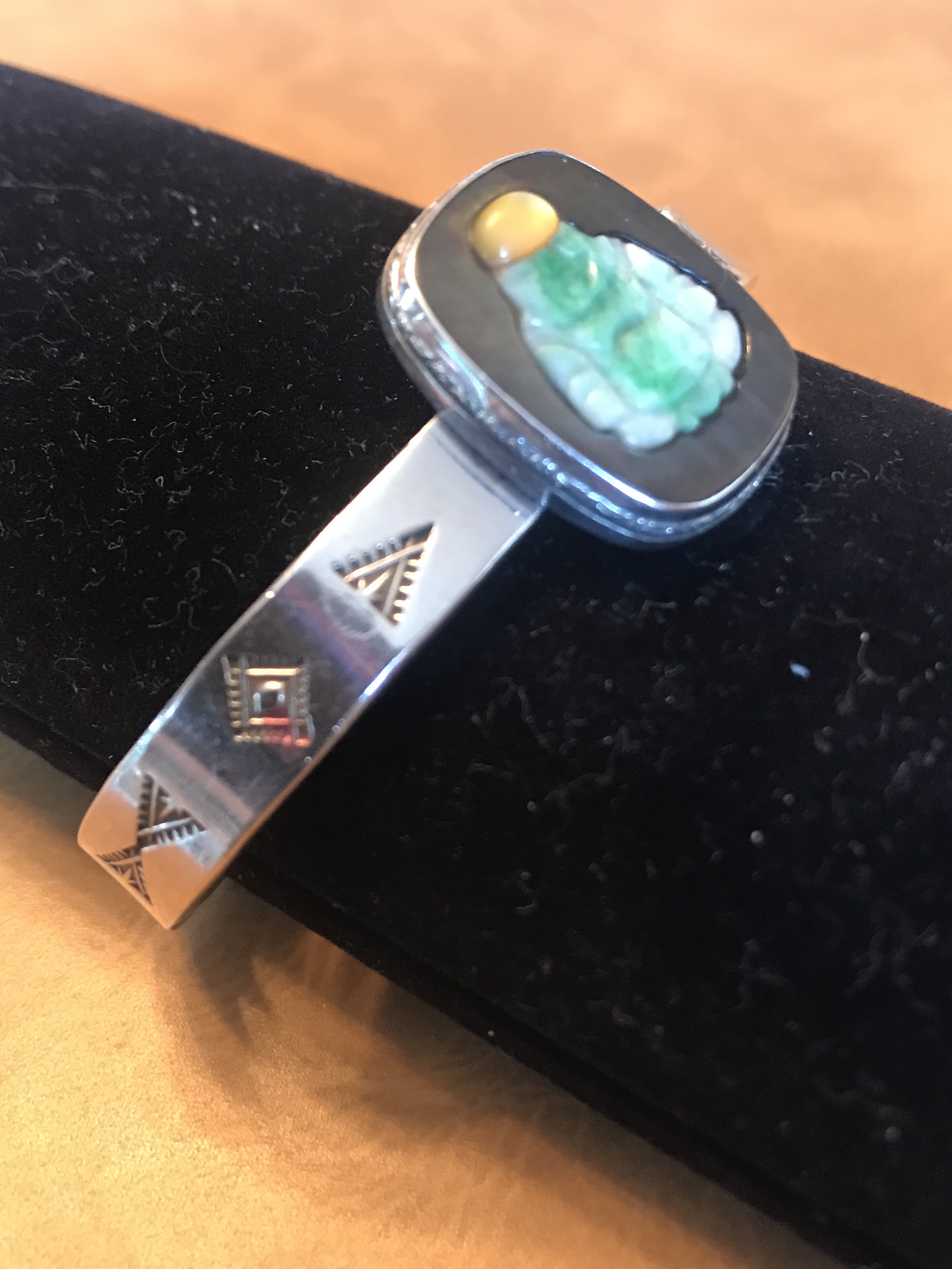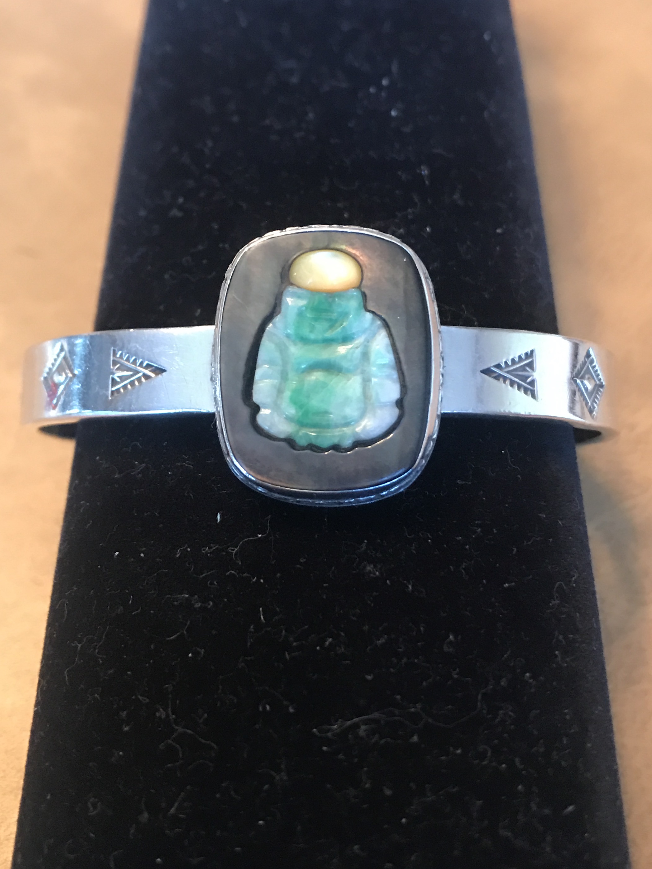 Hau Pete I’m Wayne Eagleboy and I made this Buddha bracelet for my daughter , Aleah. That is my Thunderbird hallmark I designed in 1968. I started out as a painter and later switched to shell and silver jewelry.