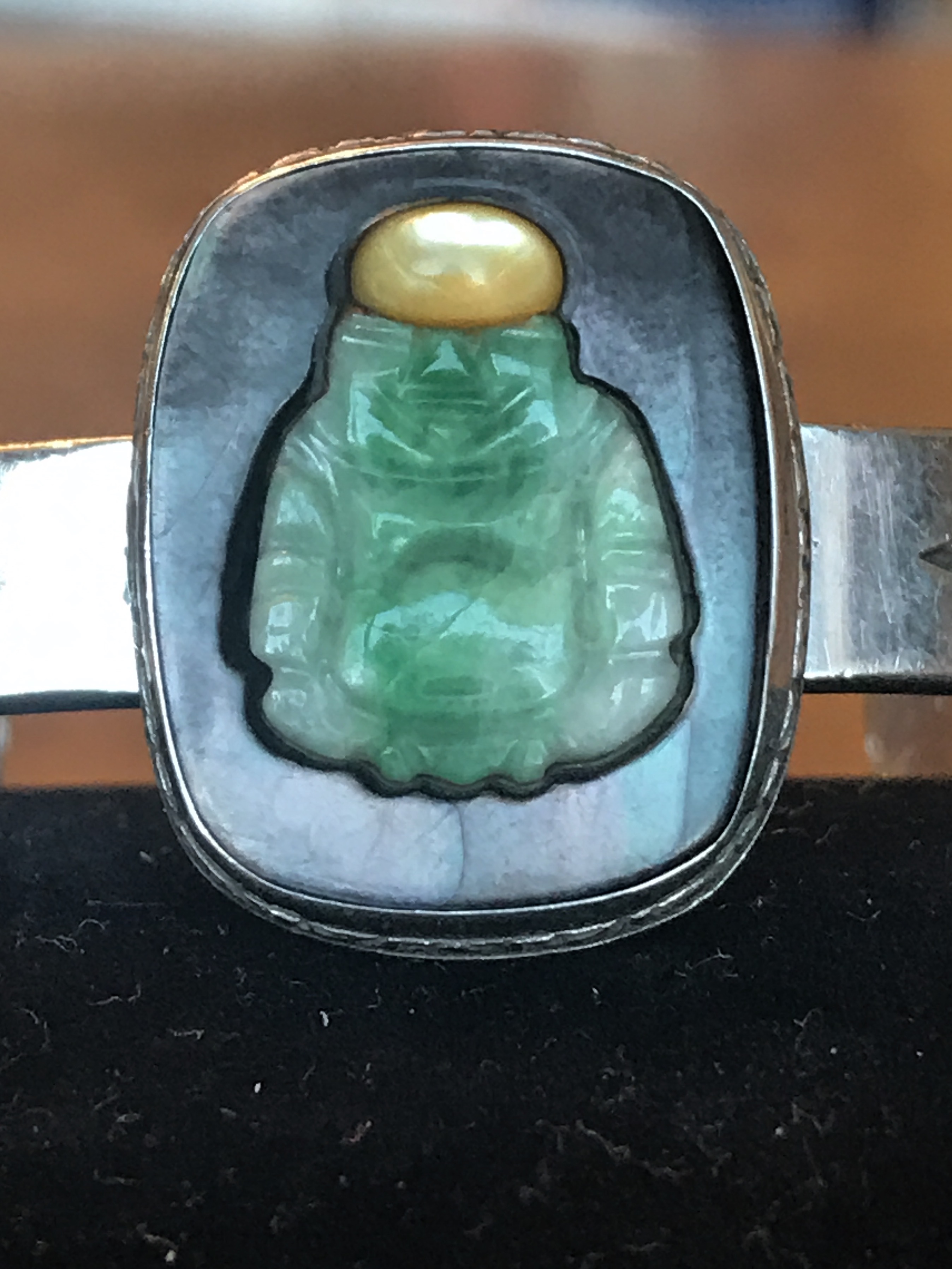 This is Wayne Eagleboy and I made this bracelet for my daughter Aleah. It is probably regular Sterling as I switched to all Argentium Sterling around 2008. The jade Buddha stone was made in china but I made the crown chakra out of Gold Mother of Pearl. It is set in a piece of Black Mother of Pearl. The hallmark is a thunderbird motif I designed for my work in 1968. It is on all my paintings and jewelry that I have made over the years. I would like to know how and where you obtained it as it was reported stolen around 2010. Would appreciate a response.