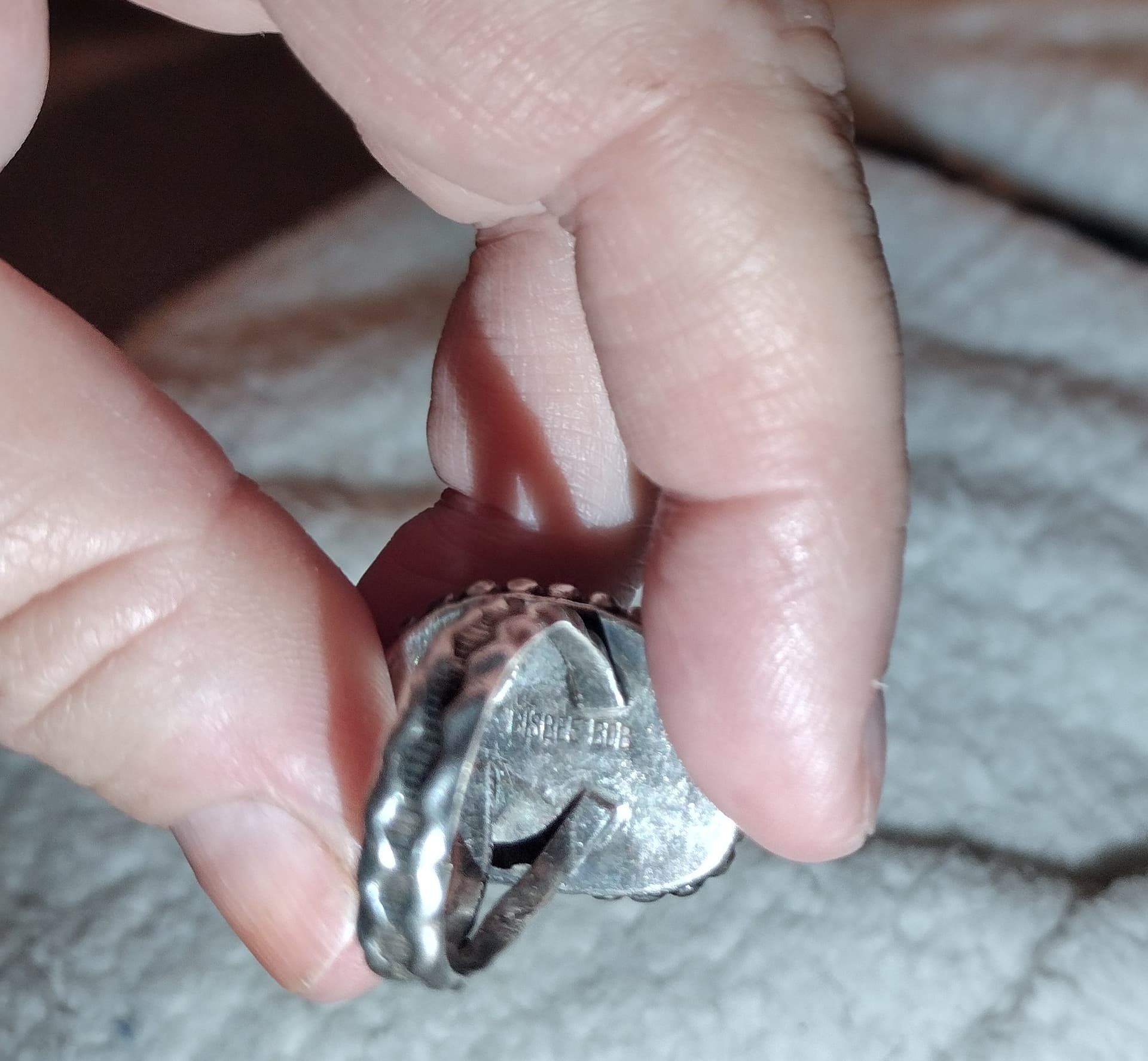 Recently I’ve been going through stuff, trying to assess what we have when I opened the box with his granddad’s stuff. There is some turquoise jewelry, one ring that’s tigers eye and another that could be malachite. Looking at them for any markings I almost gave up when I saw one of the turquoise rings had Bisbee Bob stamped on it!