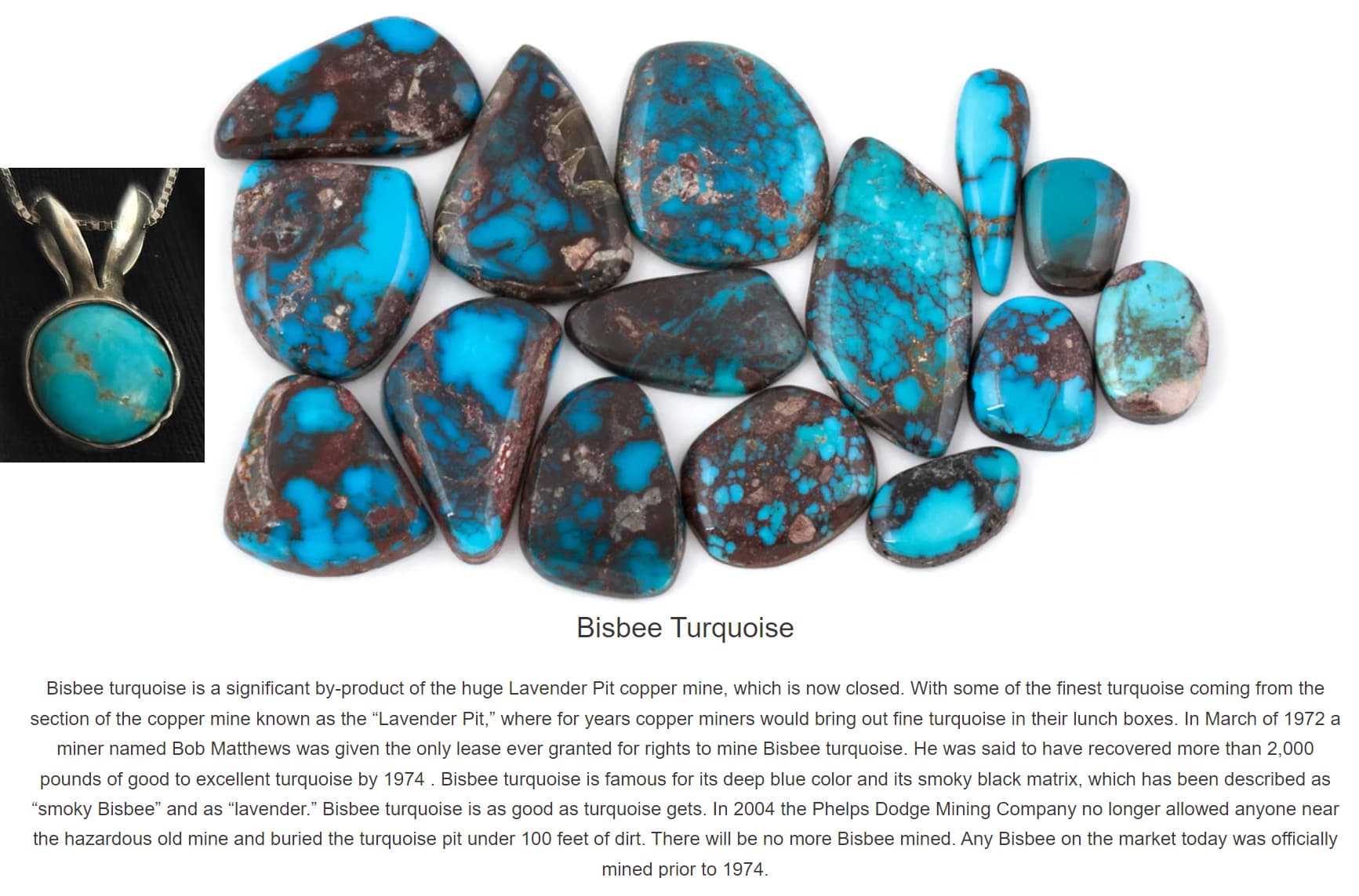 Hi & Welcome. Nice pendant. In my opinion, I don’t believe it’s Bisbee turquoise. Without provenance, though, it’s near impossible to accurately determine the mine or type of turquoise. It’s pretty much guesswork. If you type Bisbee Bob in the forum’s search field, previous threads will come up with questions & info about this silversmith.