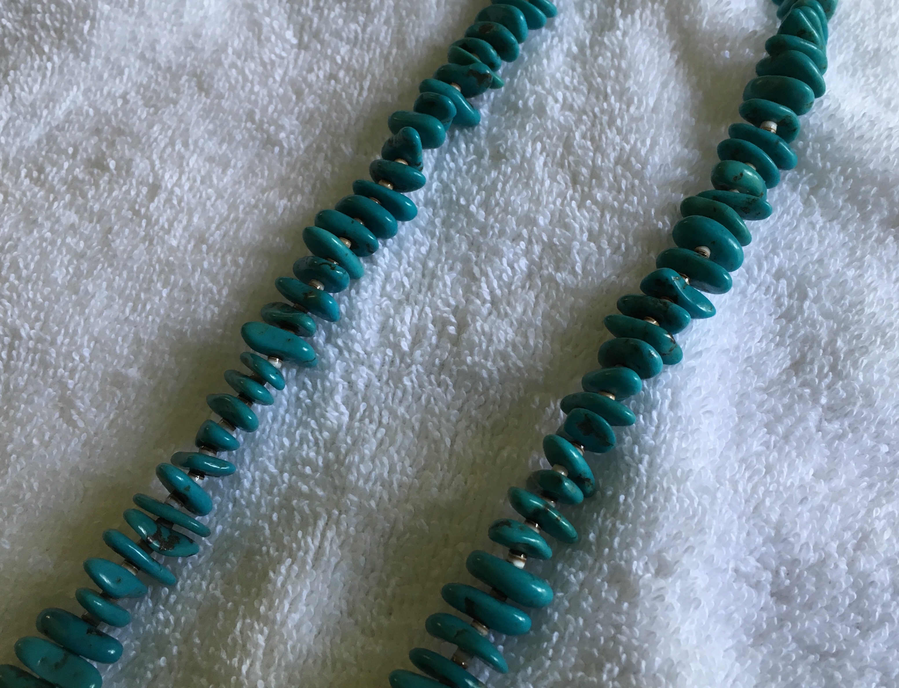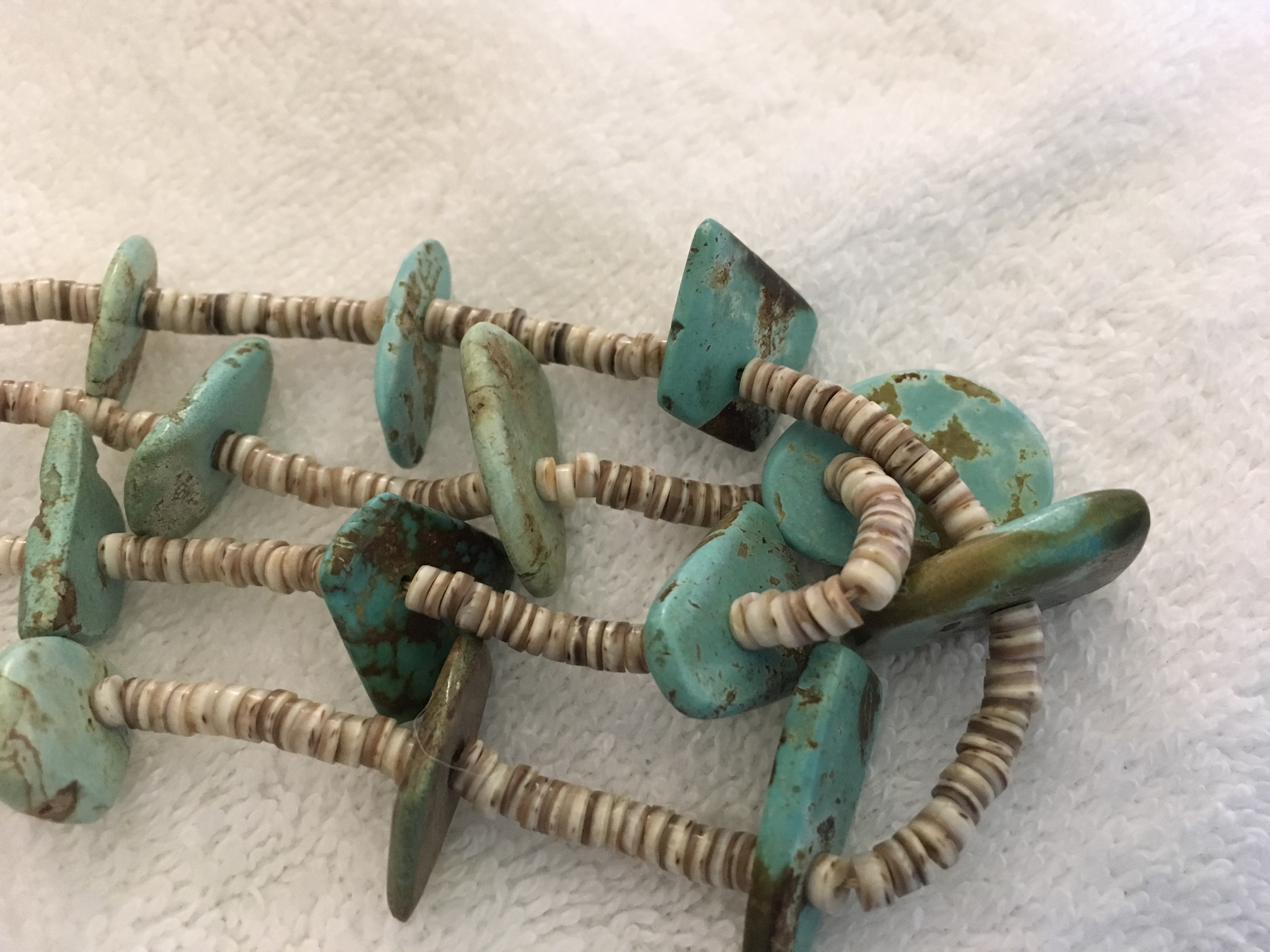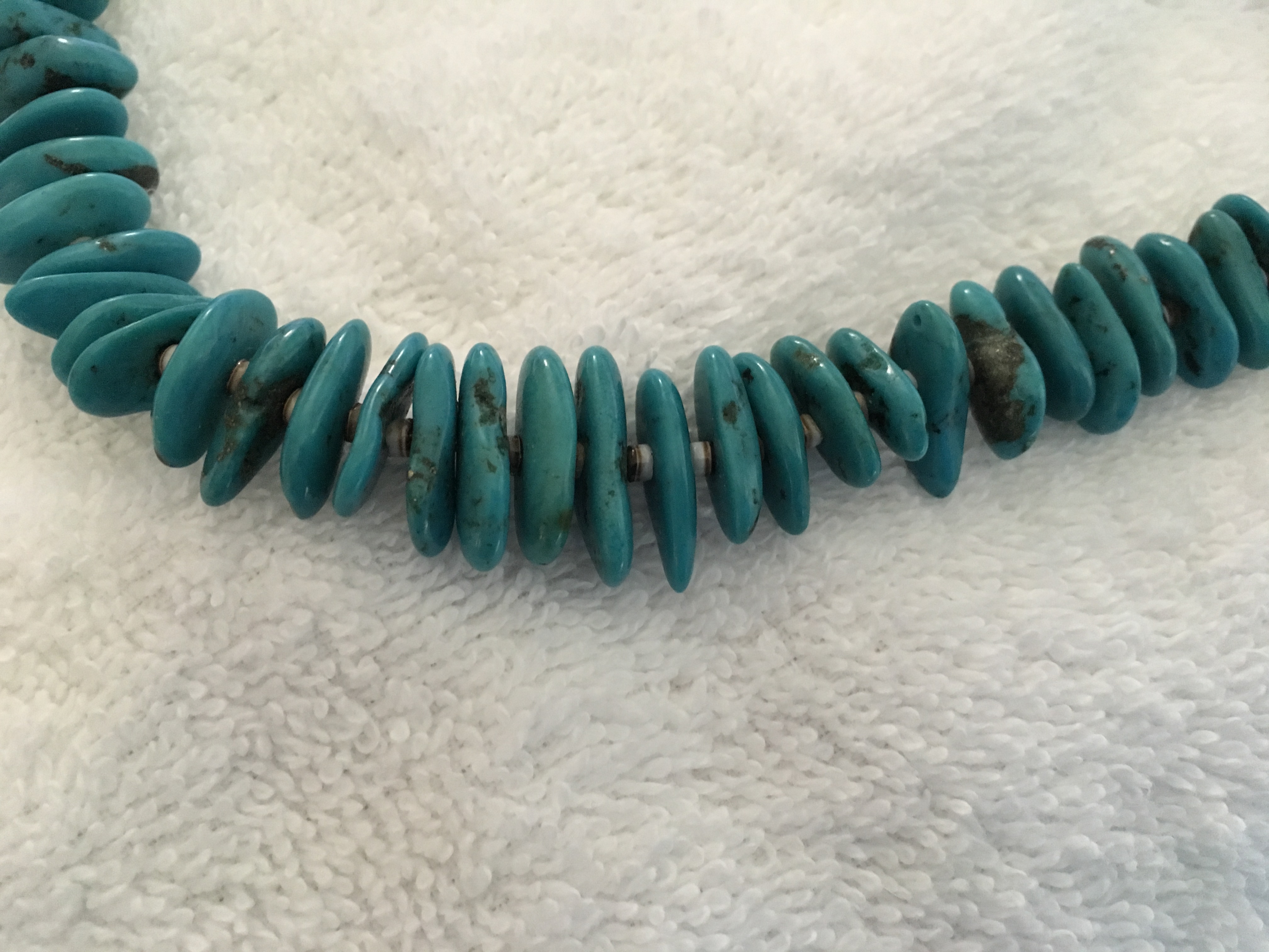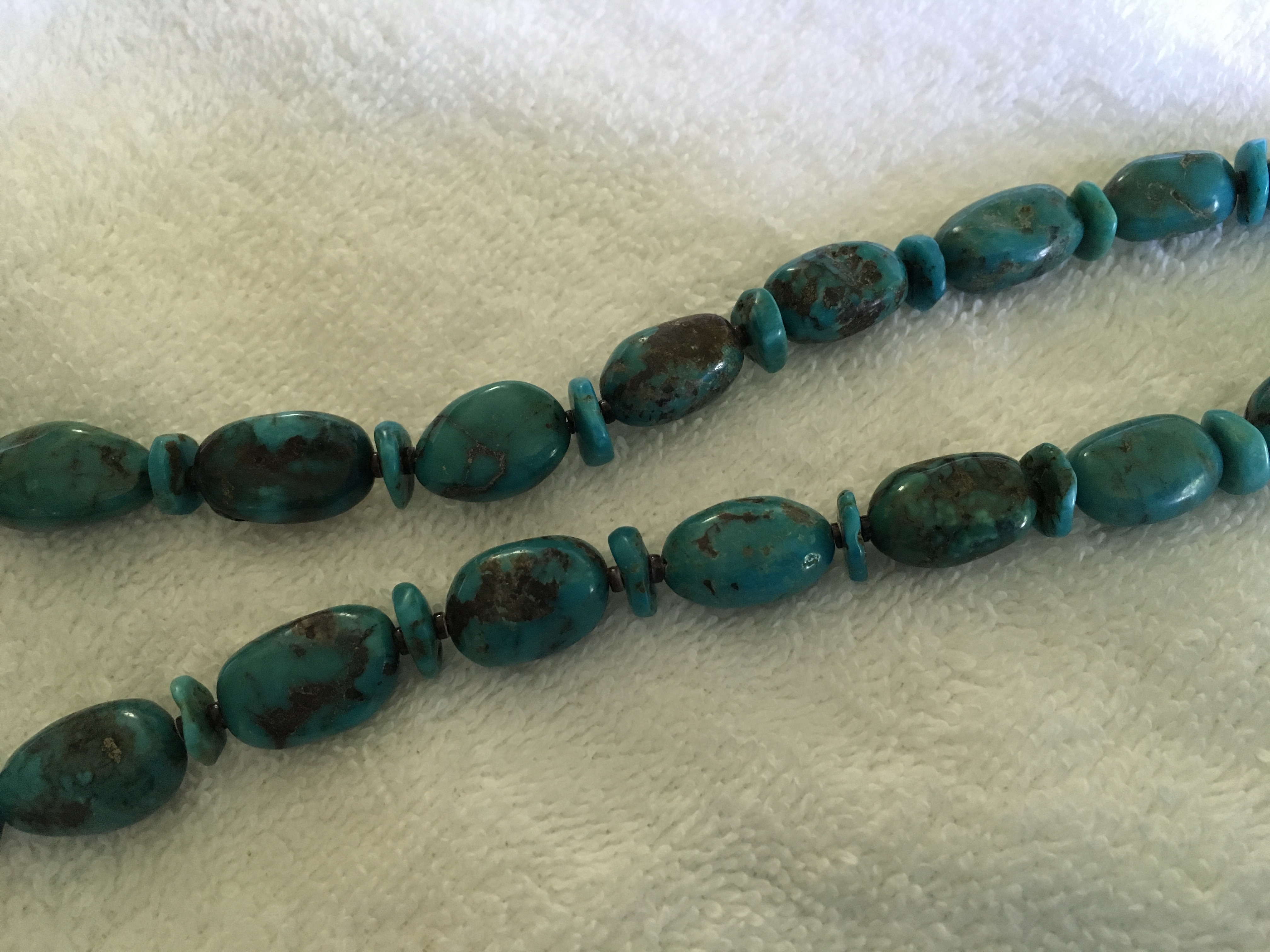 I have four necklaces that I would like an opinion on. They are all different and I’m not sure of their origin. The first looks the most natural to me and I would almost think Royston. It needs a clasp. The second is almost a choker with very tiny heishi and chunks of turquoise. The third is oval beads and the fourth is turquoise discs separated by heishi.