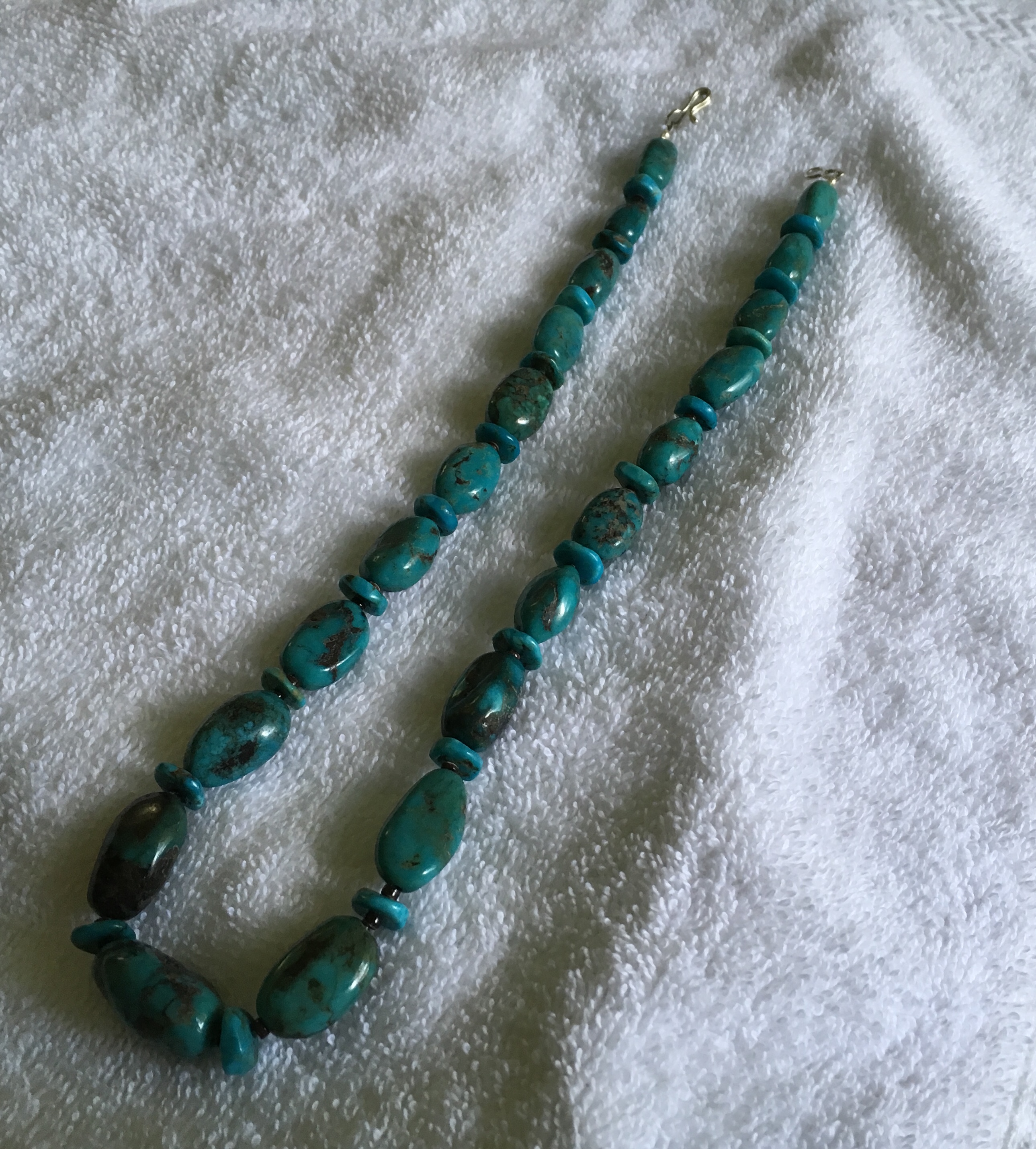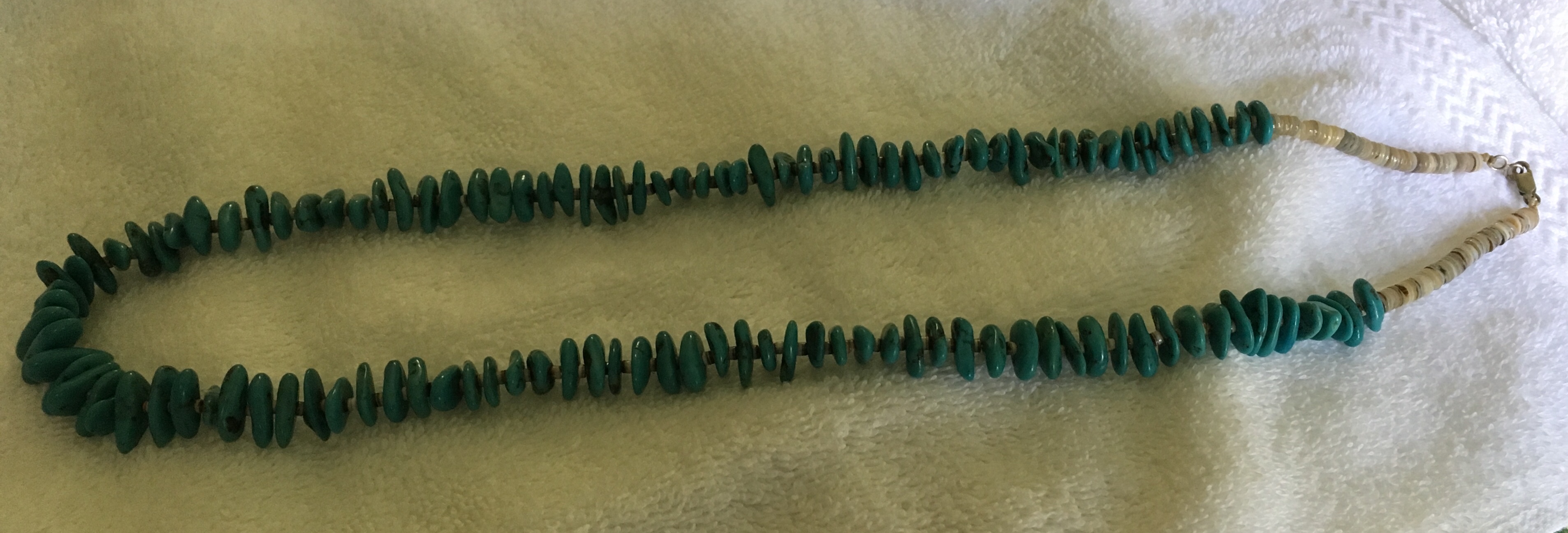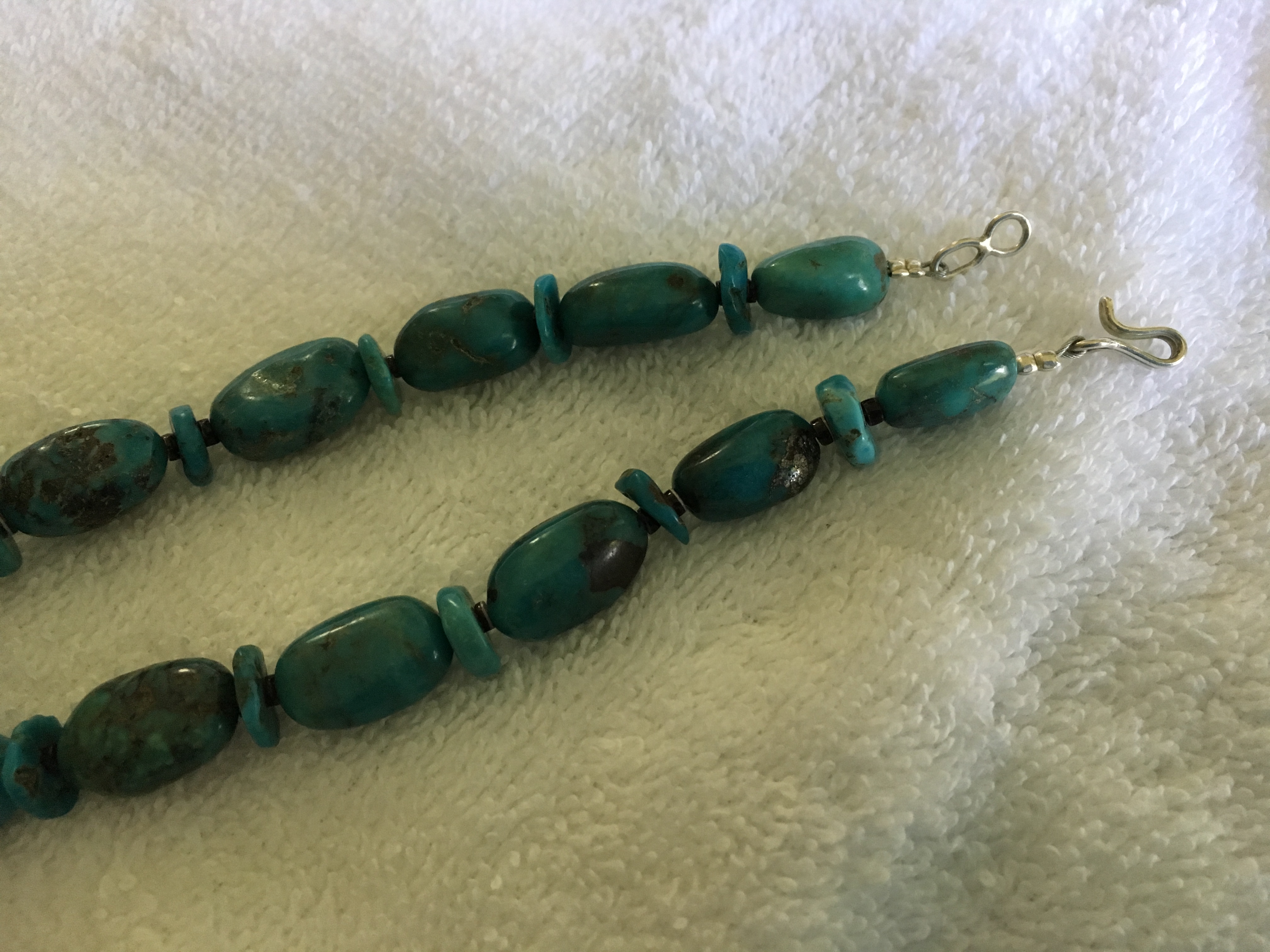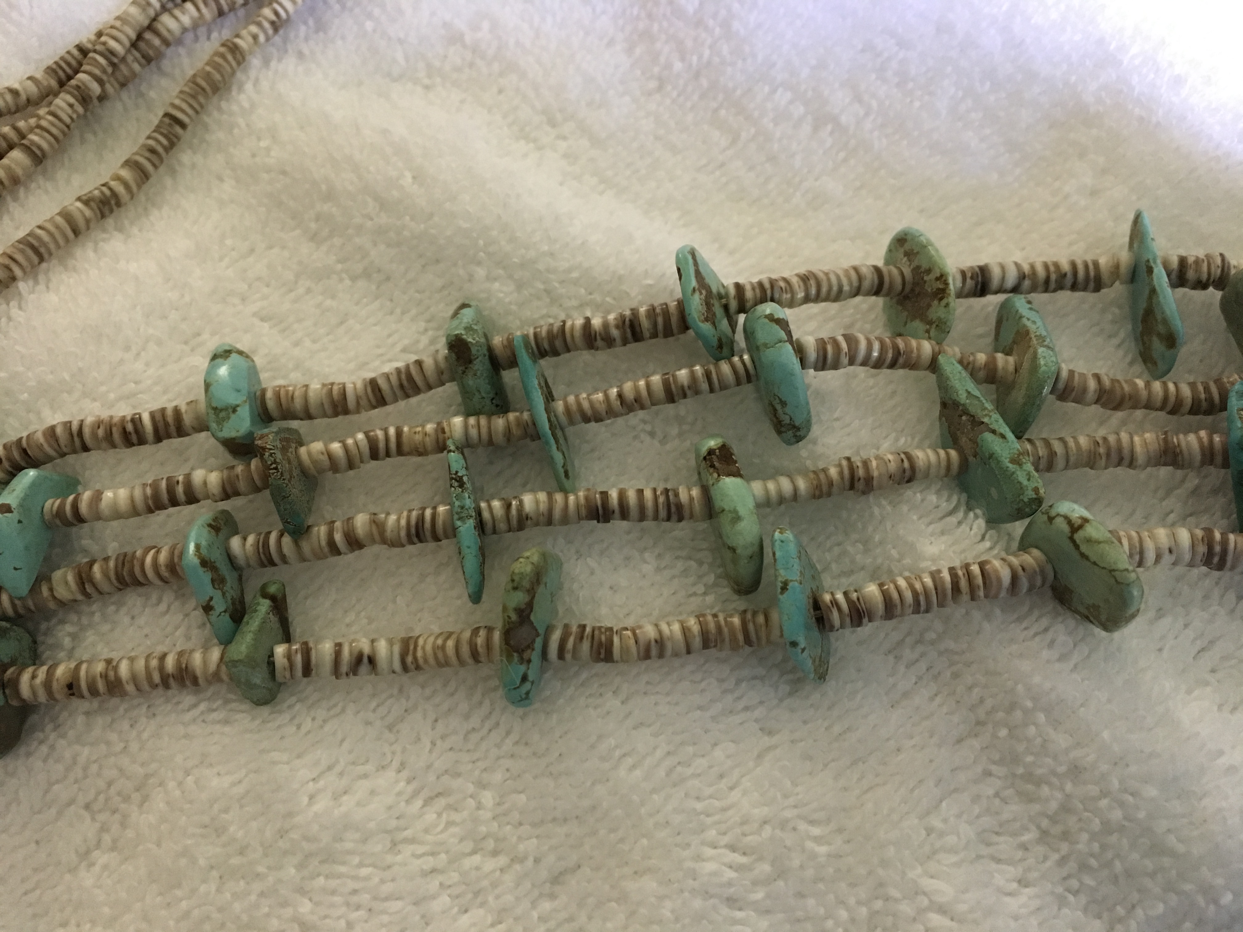 I have four necklaces that I would like an opinion on. They are all different and I’m not sure of their origin. The first looks the most natural to me and I would almost think Royston. It needs a clasp. The second is almost a choker with very tiny heishi and chunks of turquoise. The third is oval beads and the fourth is turquoise discs separated by heishi.