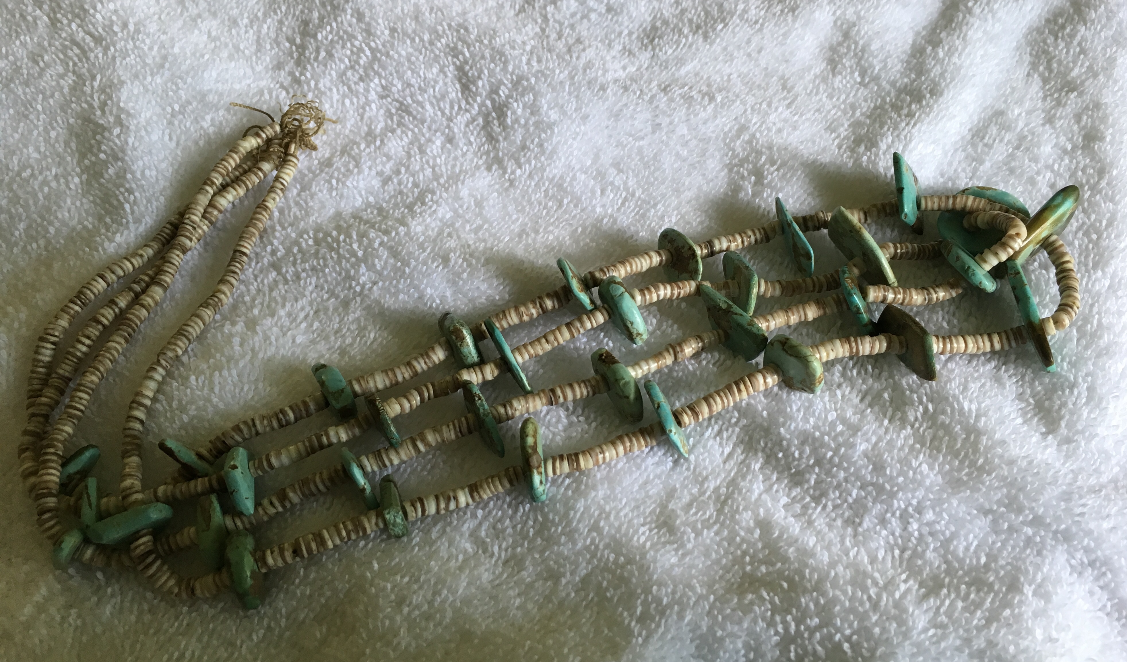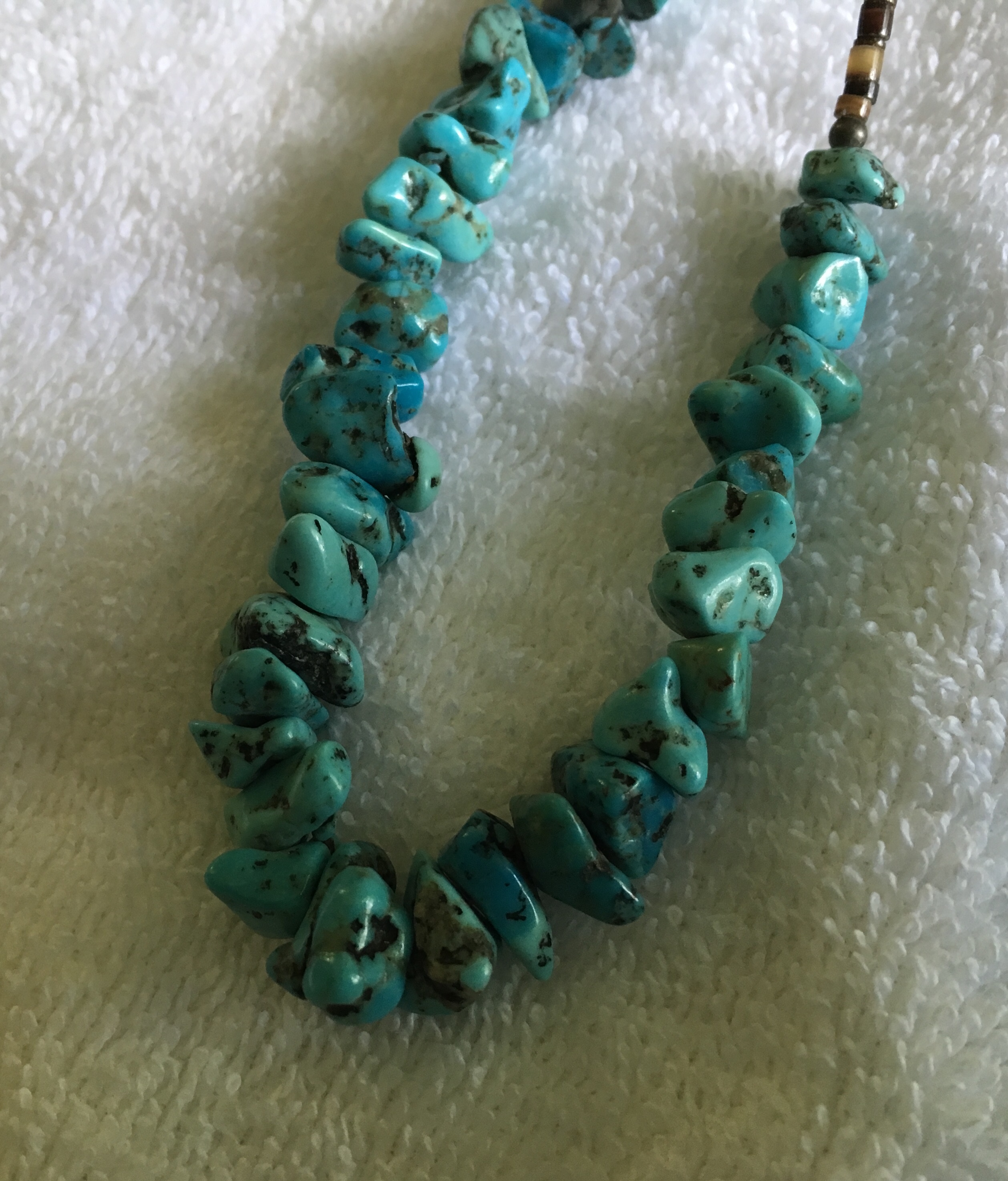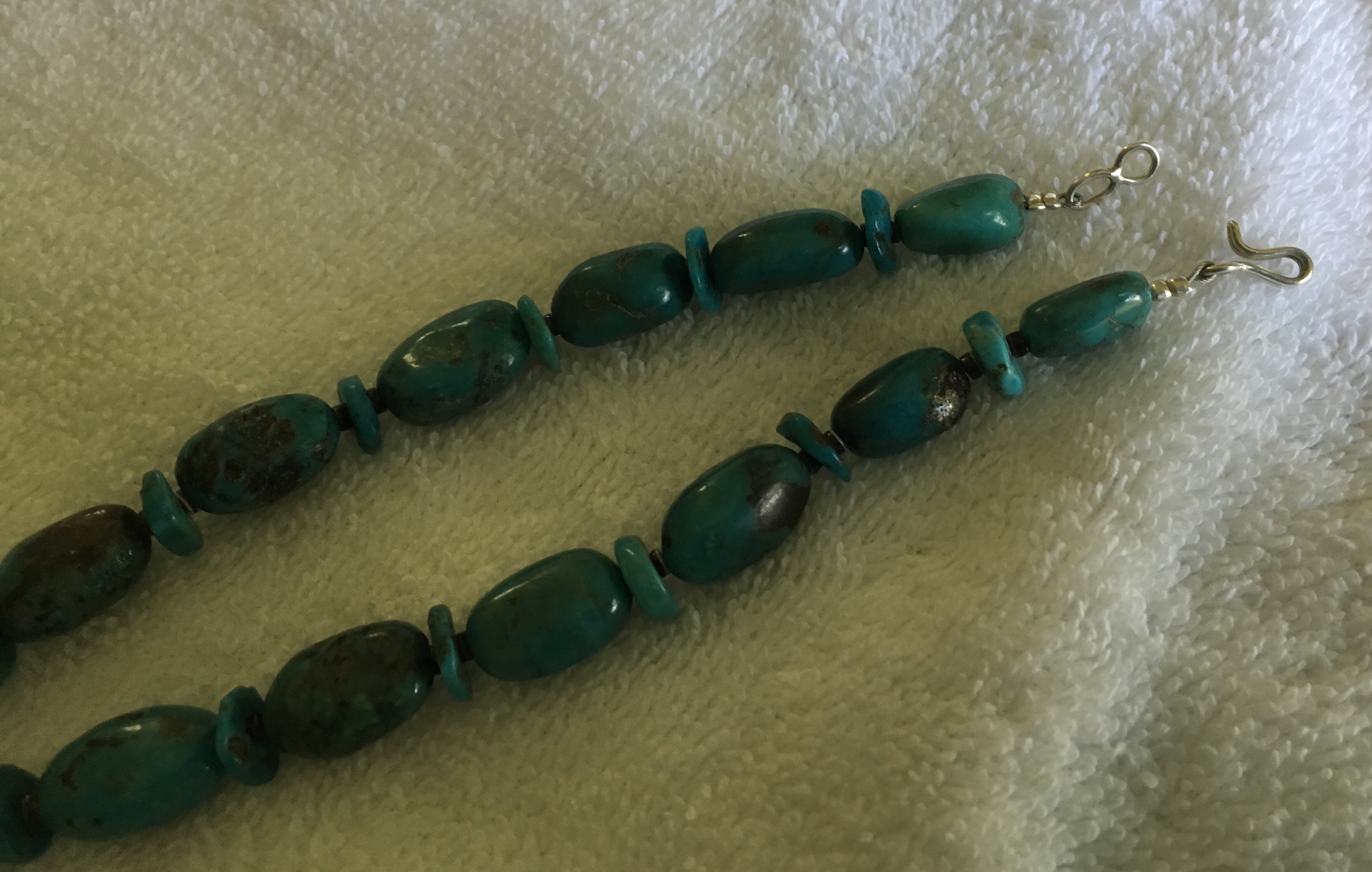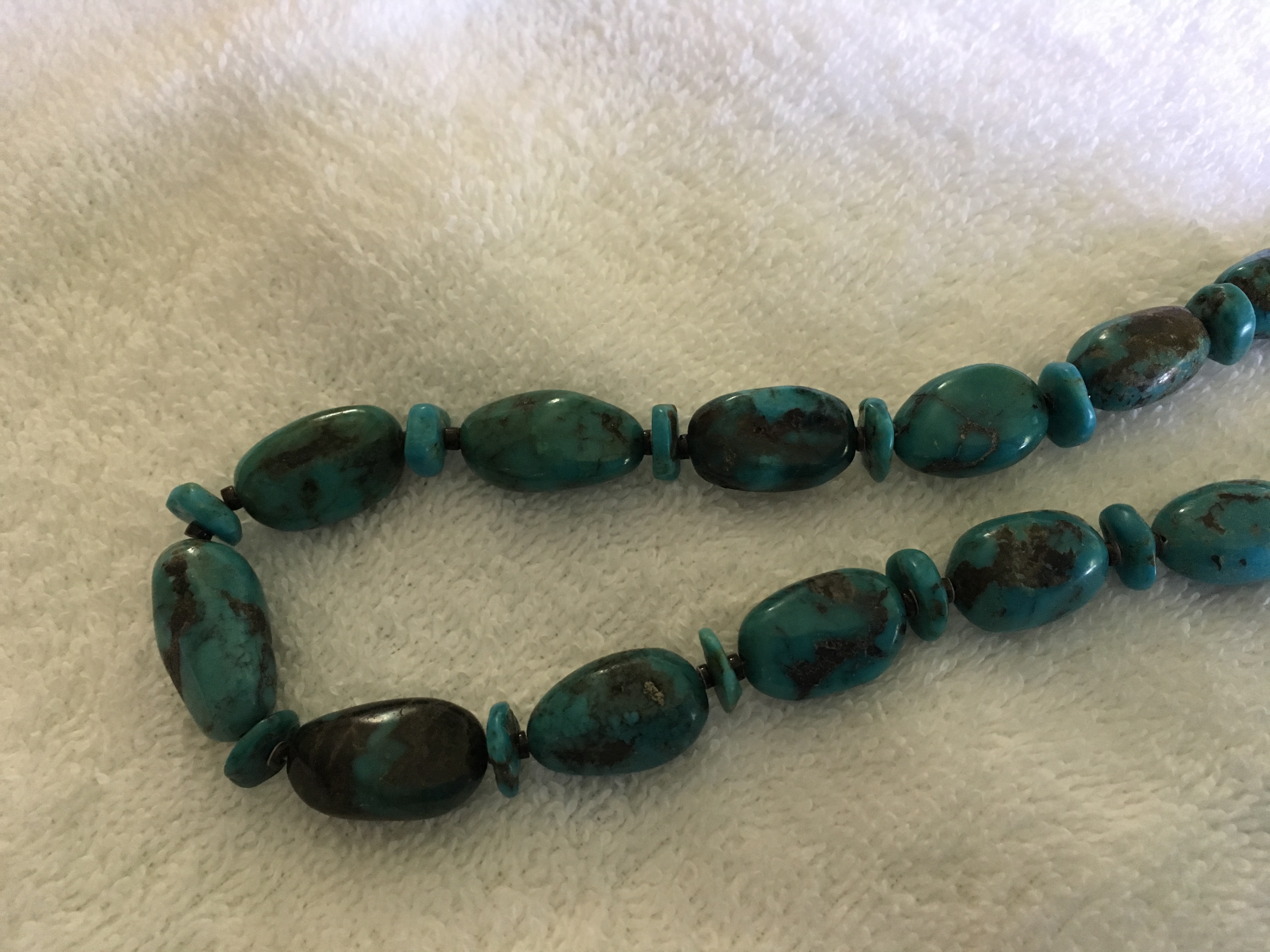 I have four necklaces that I would like an opinion on. They are all different and I’m not sure of their origin. The first looks the most natural to me and I would almost think Royston. It needs a clasp. The second is almost a choker with very tiny heishi and chunks of turquoise. The third is oval beads and the fourth is turquoise discs separated by heishi.
