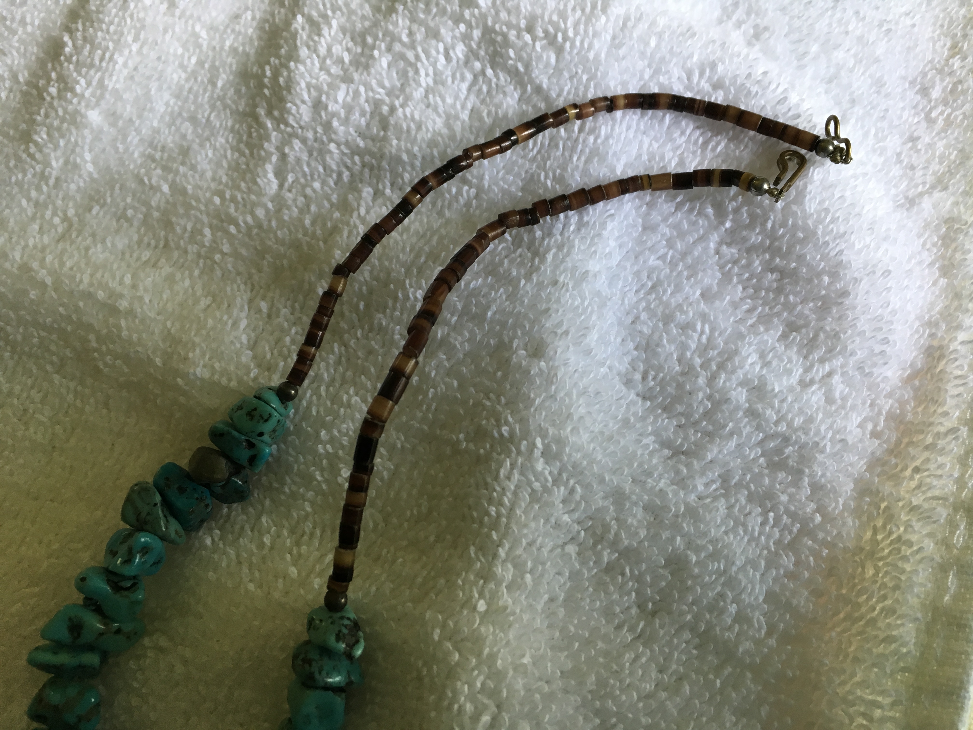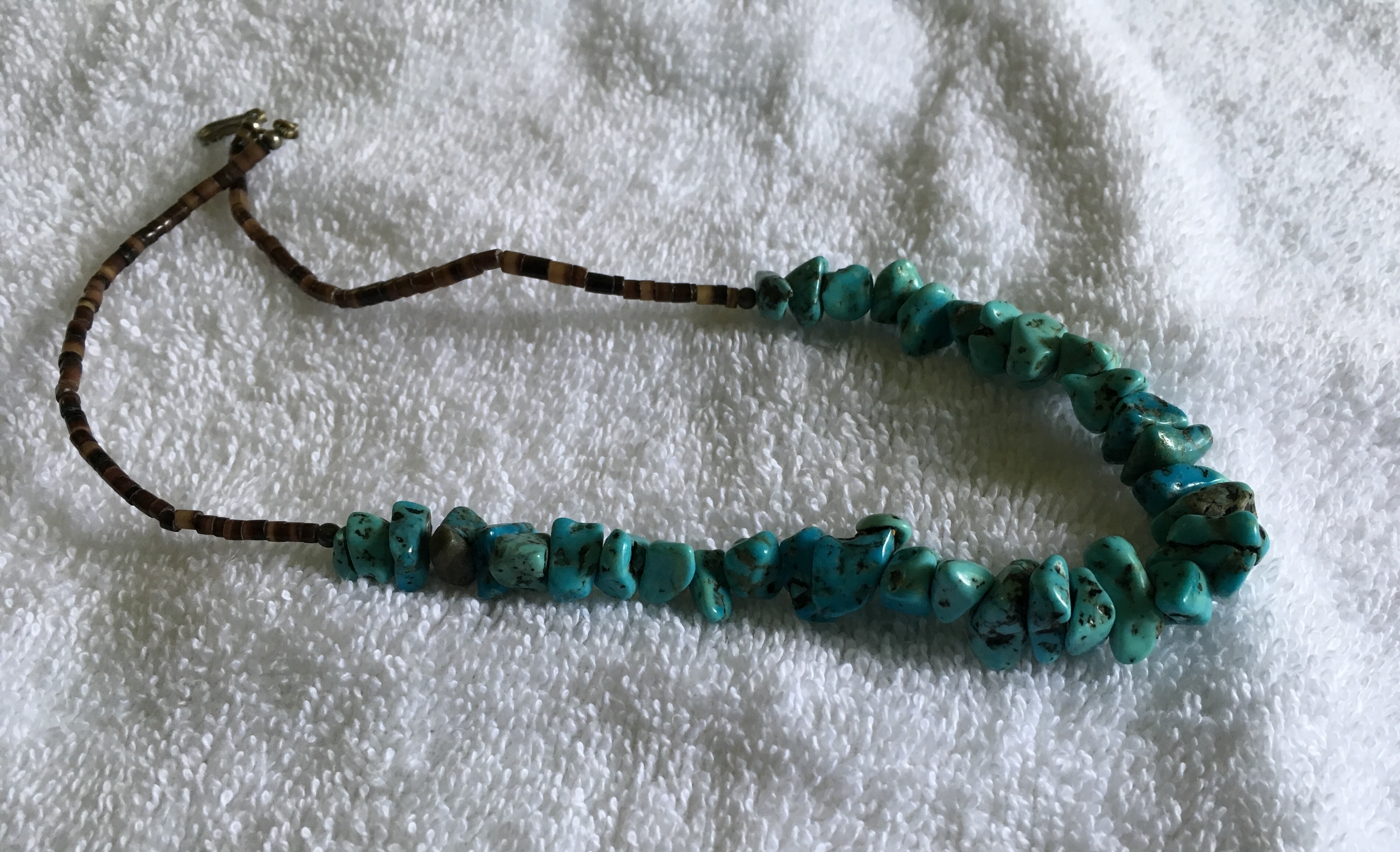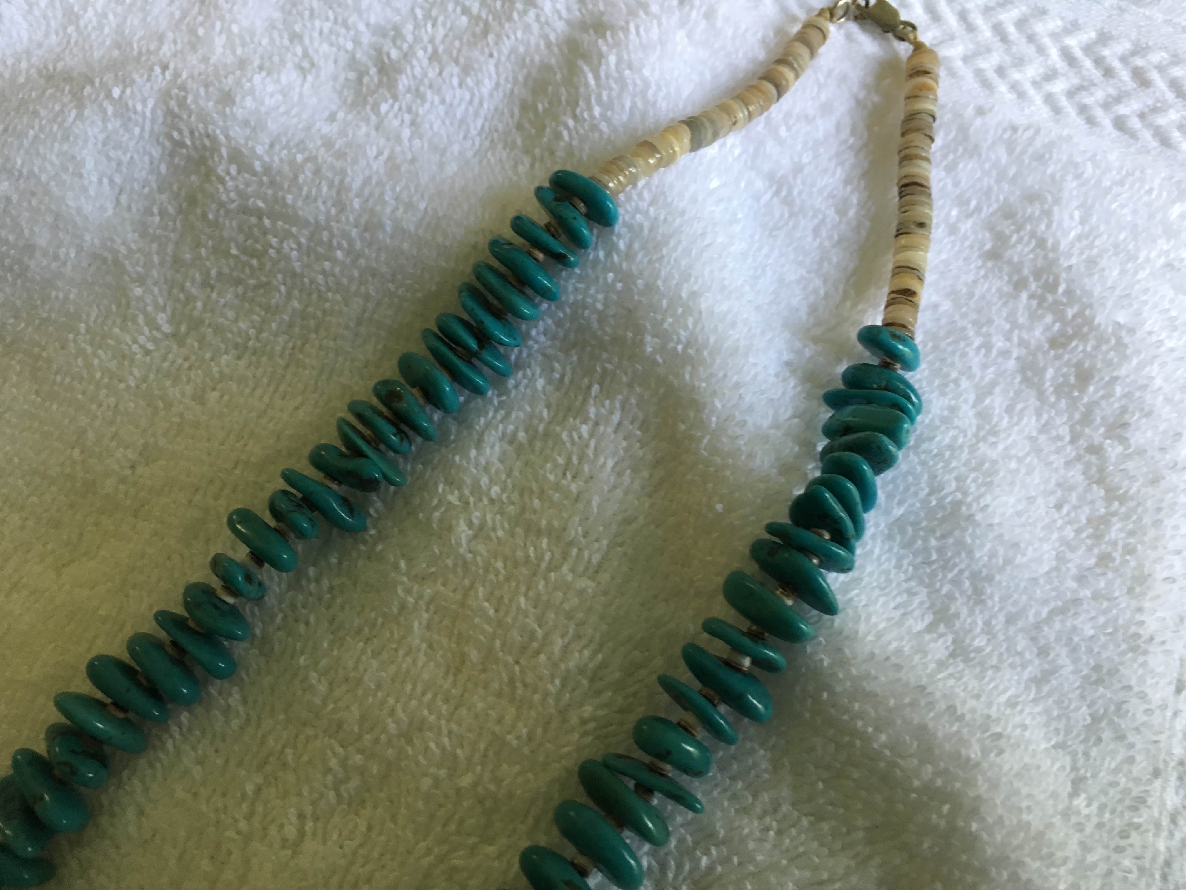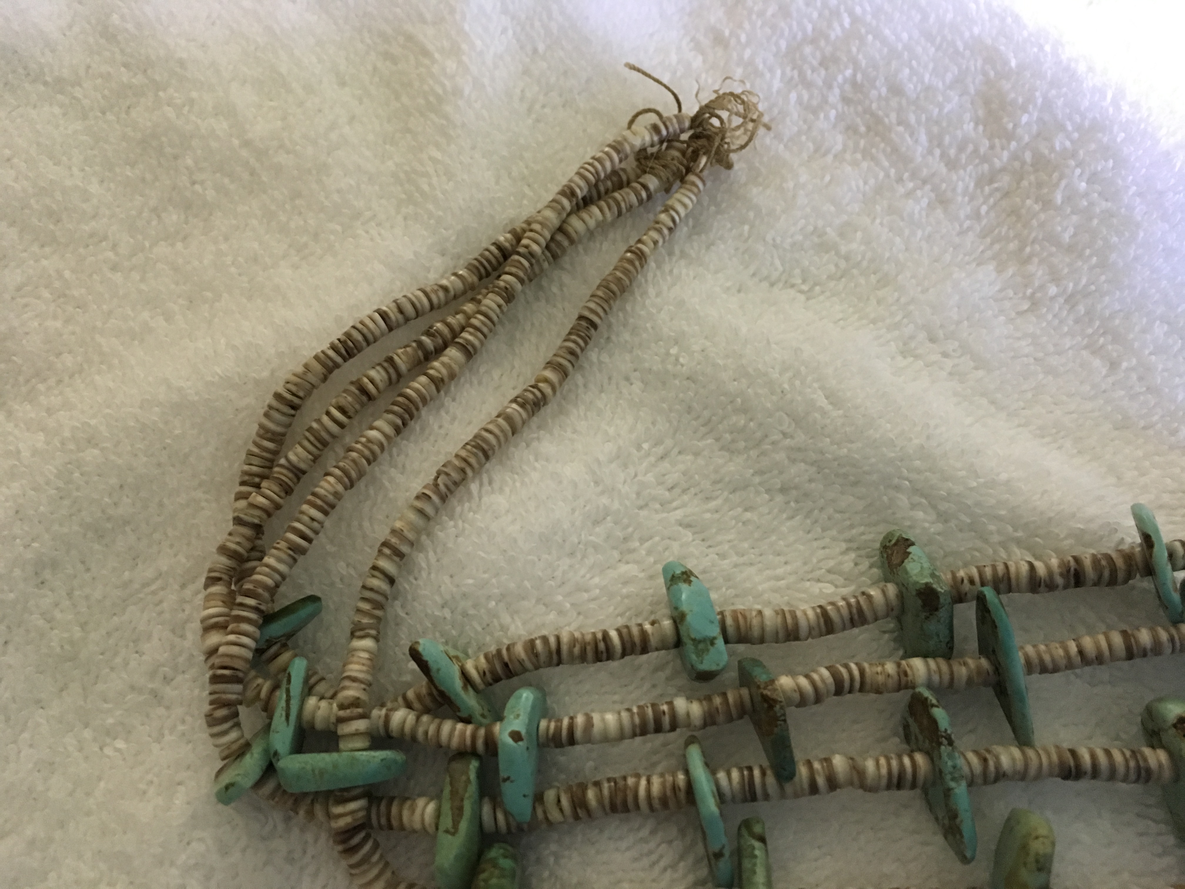 I have four necklaces that I would like an opinion on. They are all different and I’m not sure of their origin. The first looks the most natural to me and I would almost think Royston. It needs a clasp. The second is almost a choker with very tiny heishi and chunks of turquoise. The third is oval beads and the fourth is turquoise discs separated by heishi.