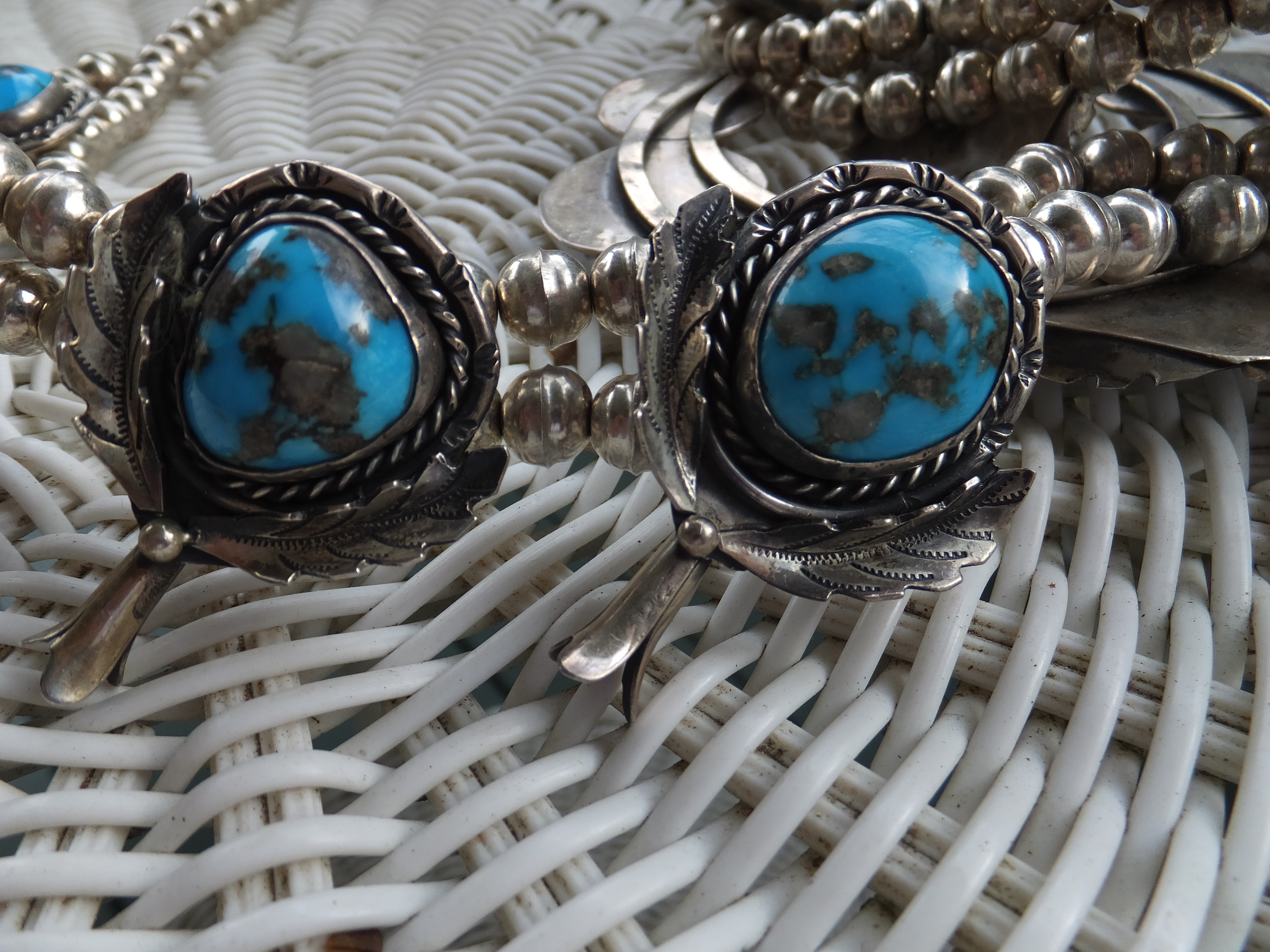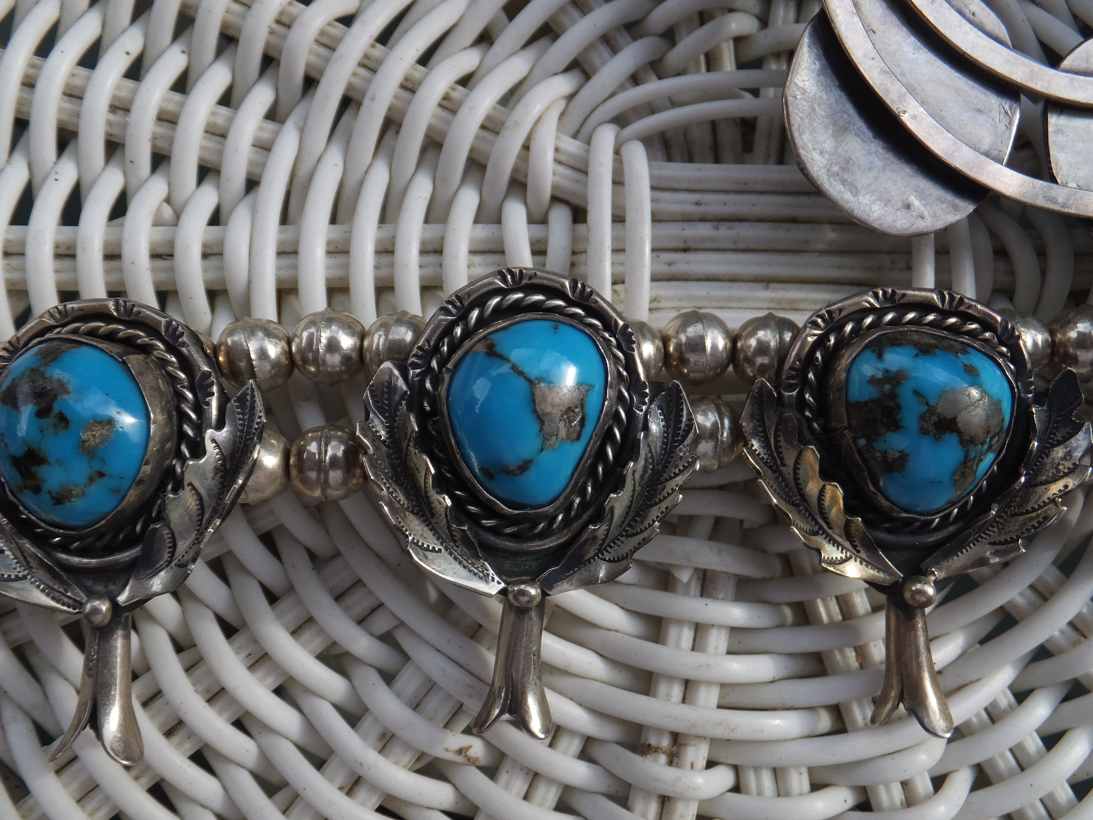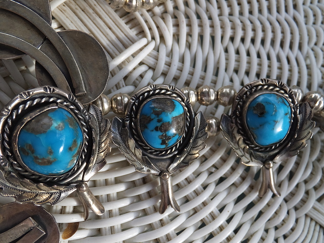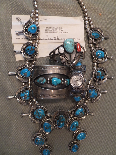 My wife got these from her mother years ago and they have been in storage since. From receipt, purchase was in 1975. I can find no hallmarks or silver marks, nothing. Hopi jewelry that we have from living in AZ. back then all have hallmarks.Seems strange that this Navajo jewelry does not. She always said everything she purchased was Bisbee Blue. Can anyone tell from picture?