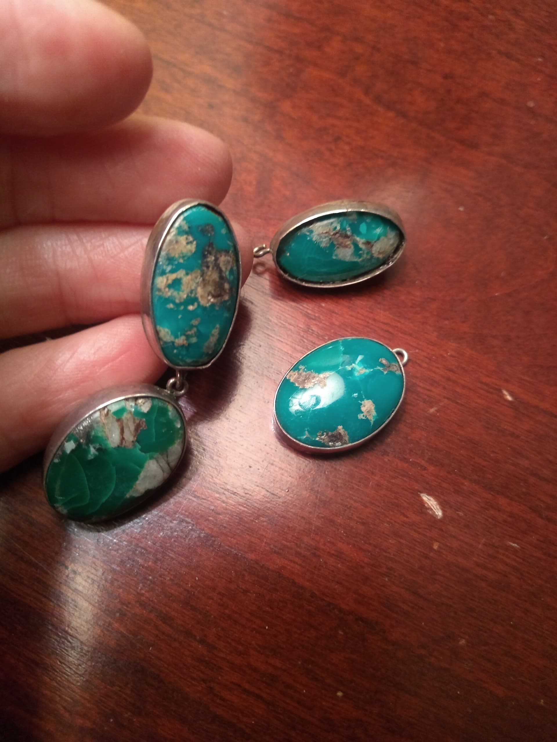 I posted these earrings months ago in a thread about my mom’s train trip. I definitely know she bought them around 1945 in Santa Fe while on a train trip. I would love to fix them, because of the family history, but they’ve pretty much broken apart in the middle between the two stones. One stone is sitting deeply in the setting, because it fell out. The sawdust was old and dried, so I probably was a dummy and put it in with super glue, because at that time they were still wearable. Then it completely broke. Way back I had them switched to posts from screw backs.