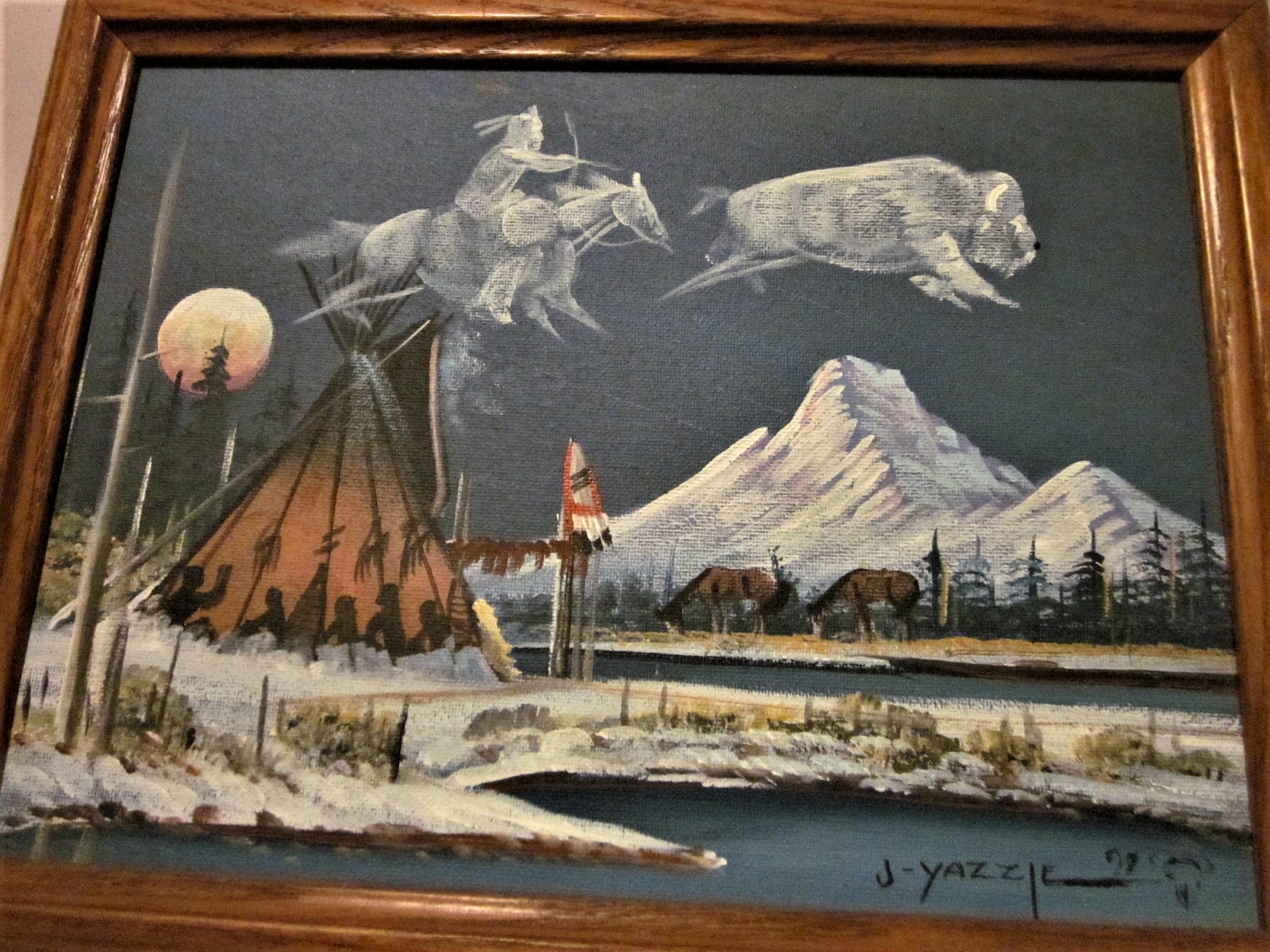 I know Silversmithing is a skil taught and handed down in families. Yazzie is a a name I have heard before in jewelry making. Could the painter who created this hauntingly beautiful image of a buffalo hunt be the same man who who perfected the art of jewelry making? J Yazzie the artist was said ti have been selling his paintinhgs along the roadside in the 1970s Southwest, where this one was acquired. Would appreciate any background on the artist.