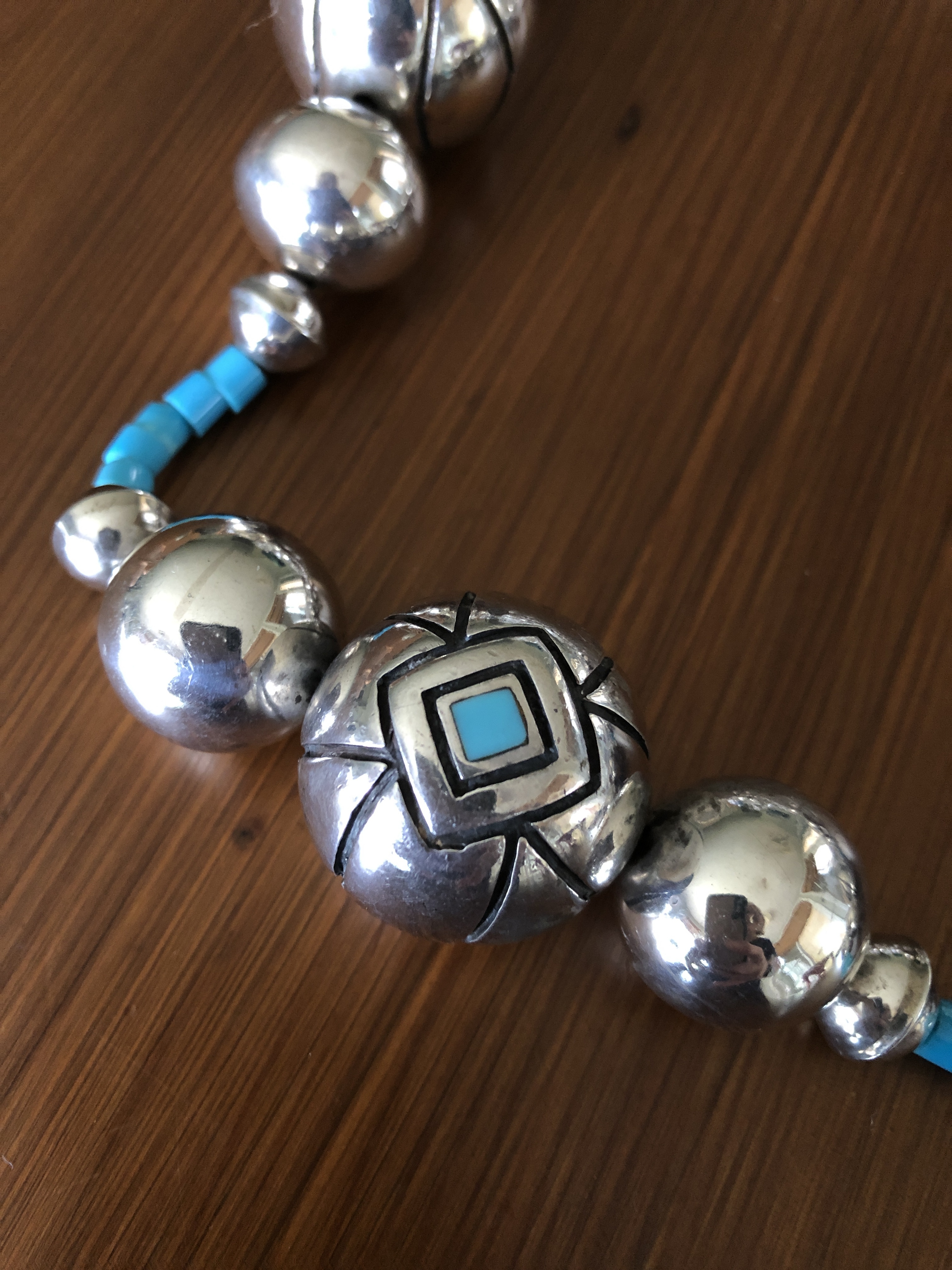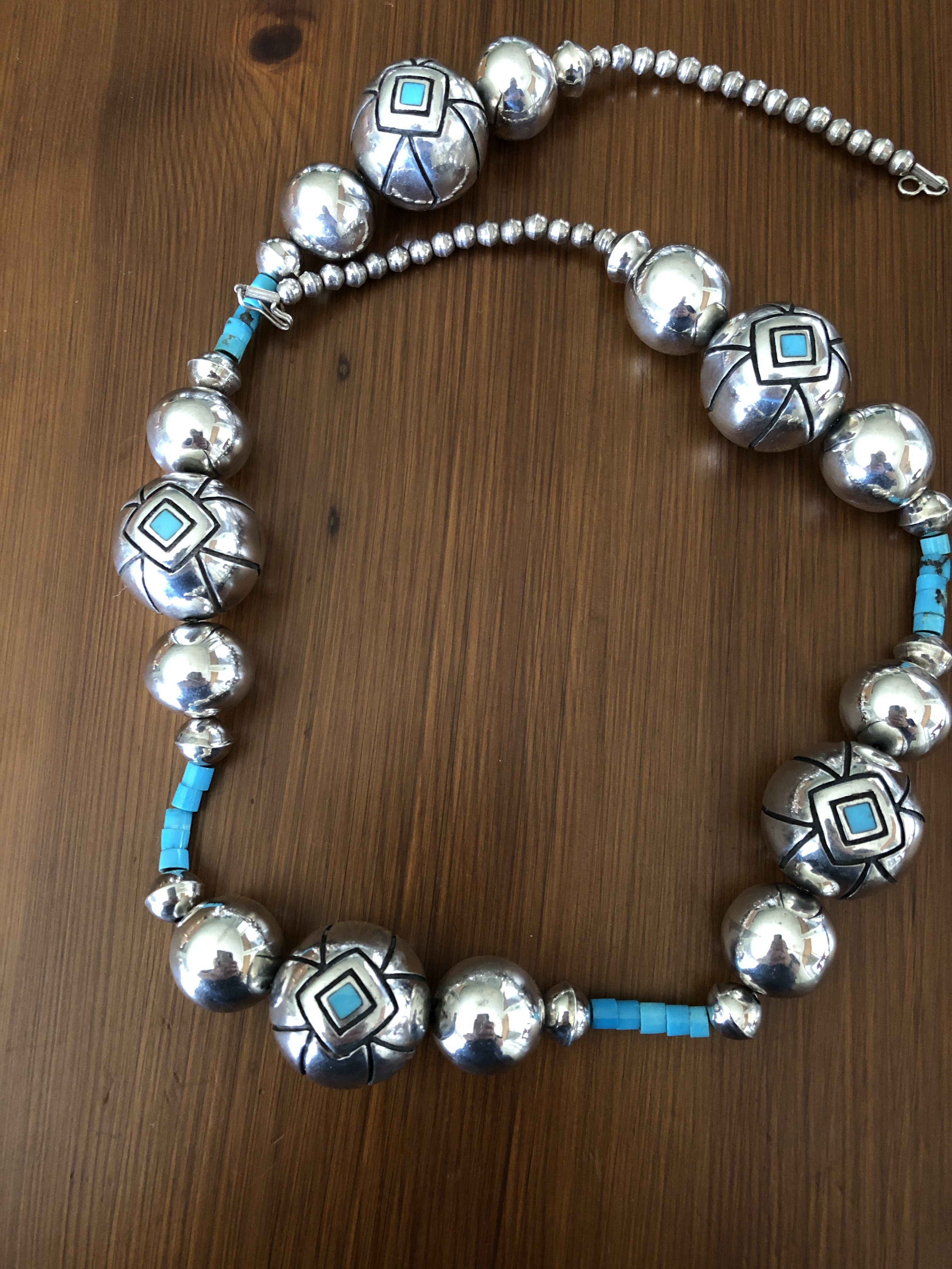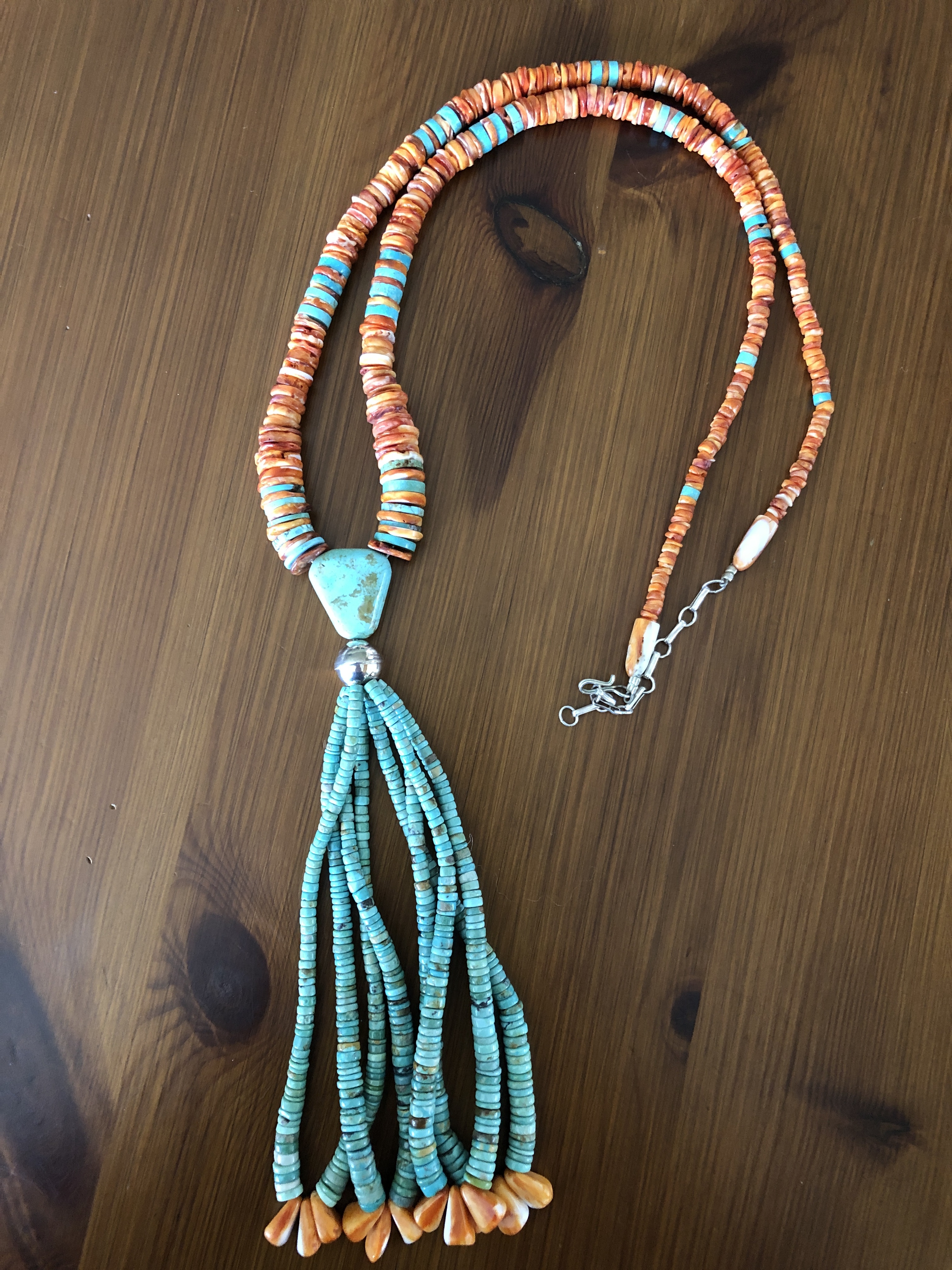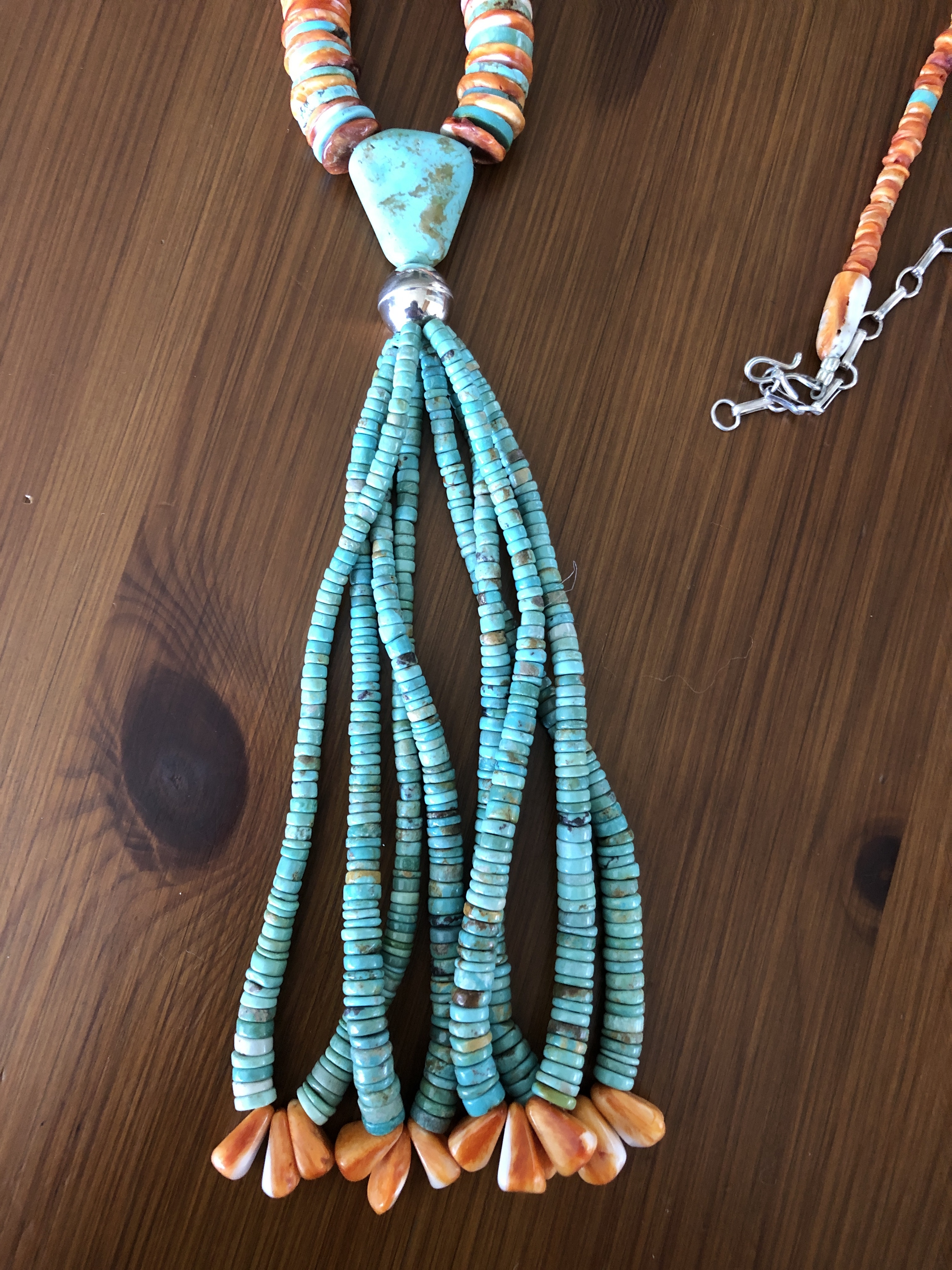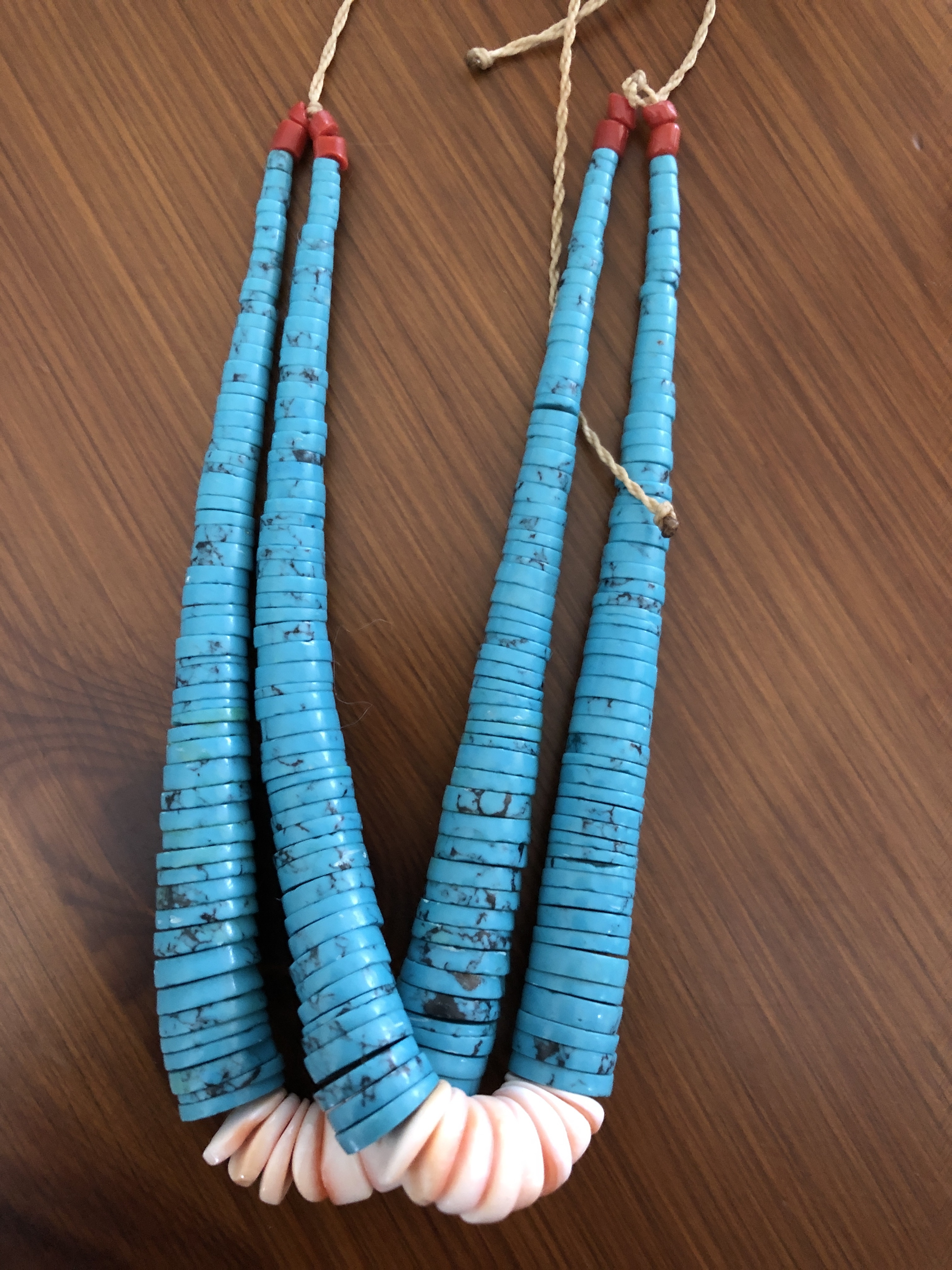 Hi, I inherited quite a bit of jewelry, that I know little about other than the buyer bought much of it in the southwest. Any thoughts on the large bead necklace, I know she bought that on a trip thru Colorado & Arizona. I have serious doubts about the turquoise jacla - the shells & turquoise bother me. The spiny oyster necklace with jacla looks ok, thoughts?