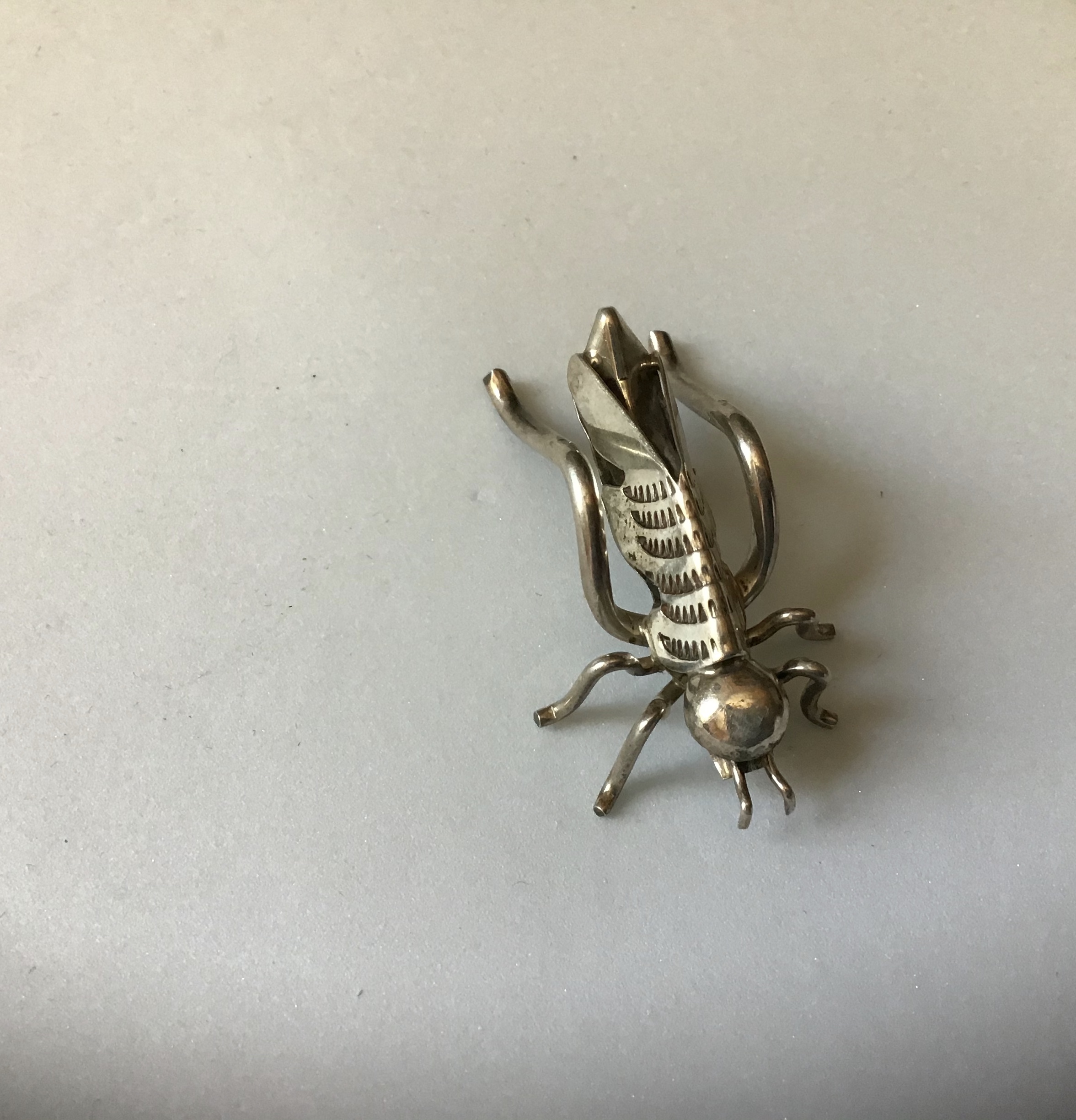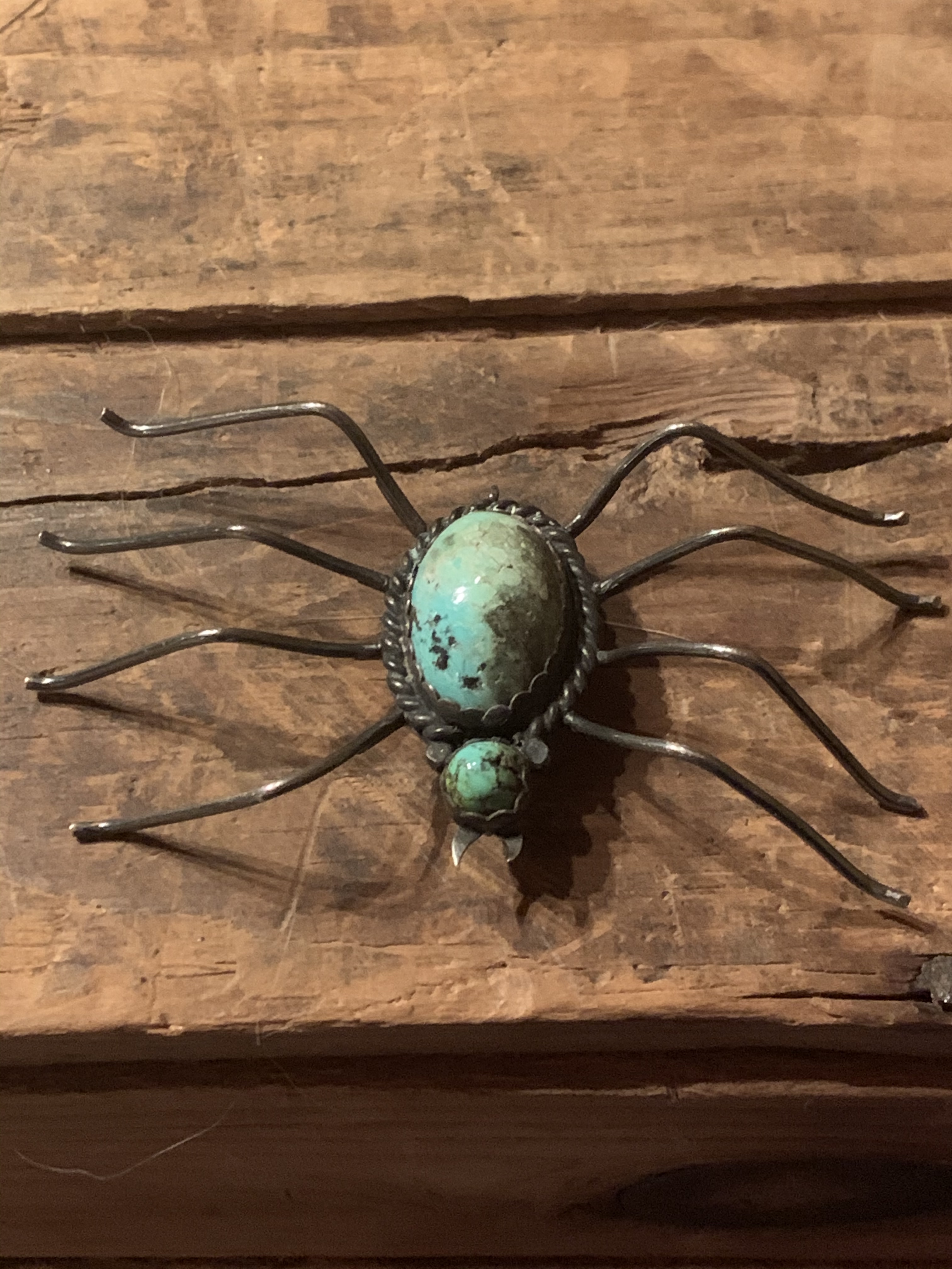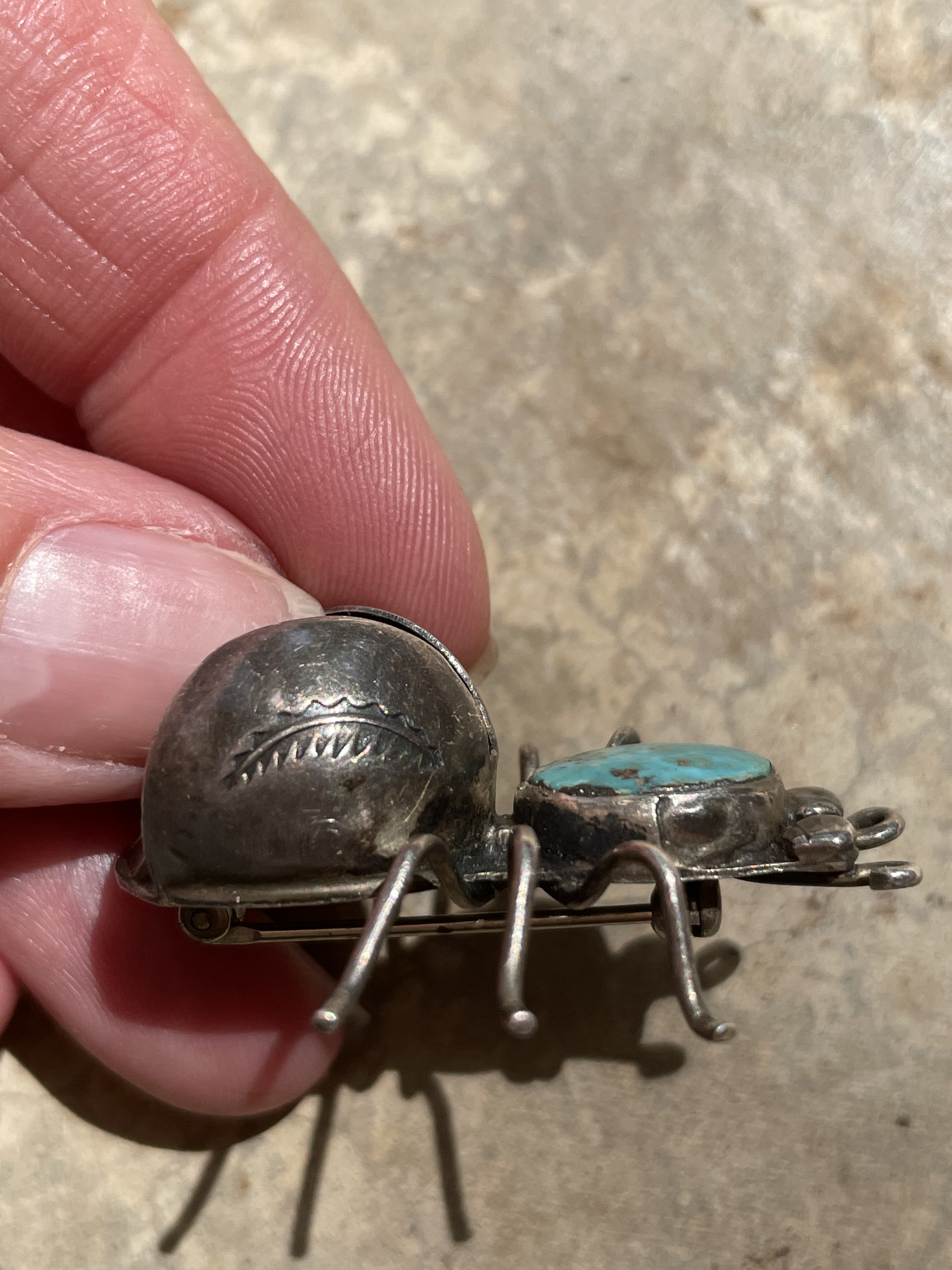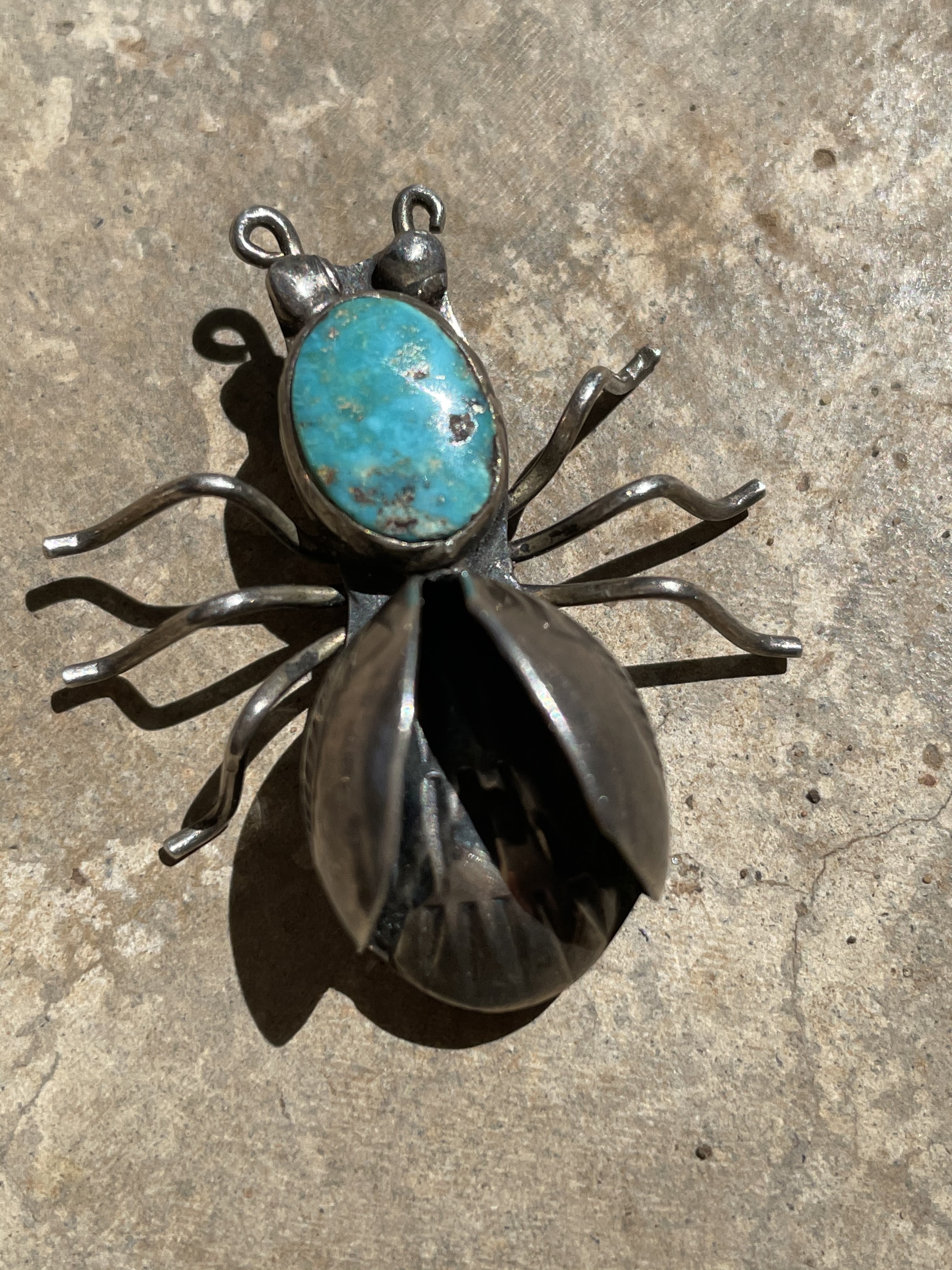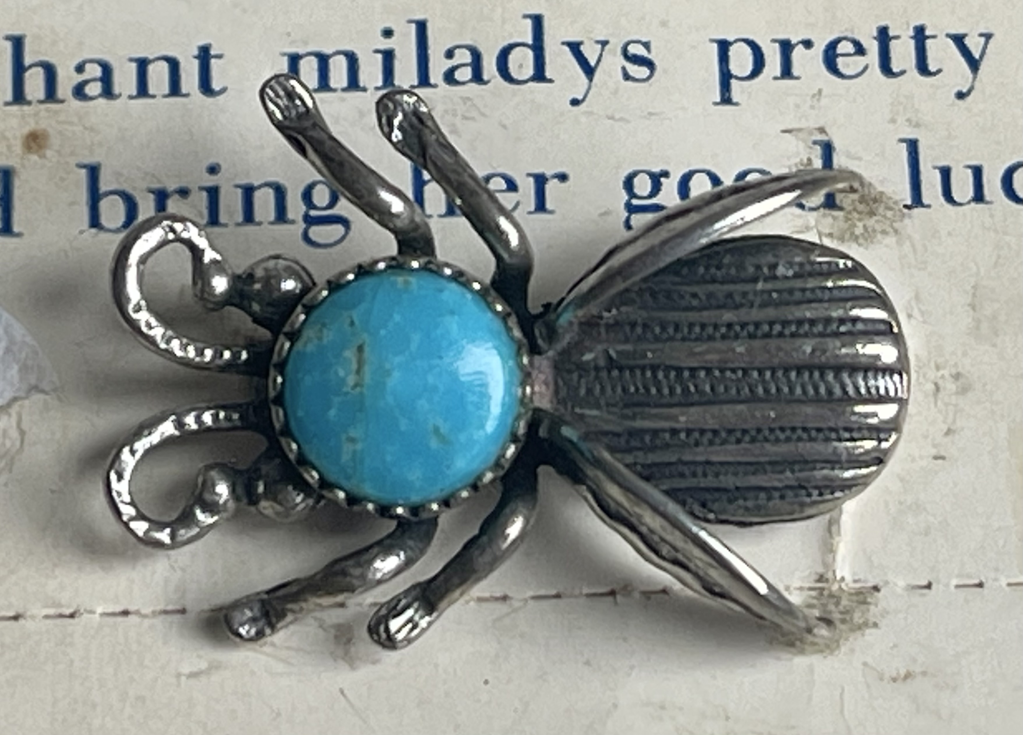 It symbolizes “really cute pin for the tourist trade.” I love these vintage Navajo insect pins. I’ve seen them sold as a bug, insect, beetle, flying beetle, and fly. I guess an entomologist would make the distinction according to number of legs, but resellers take liberty.