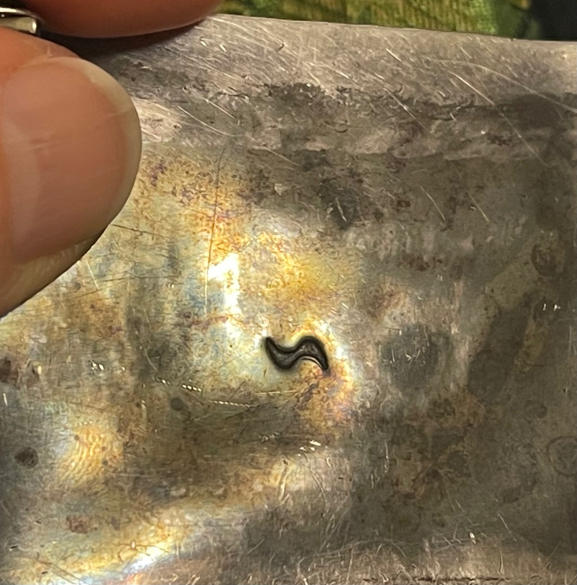 The mark (a curvy S?) is unknown to me, and I can’t find it in any of the resources I have access to. Despite that, I took the plunge, as these pieces are rarely encountered here in Canada, and this one appealed to me. The size is 3” x 2” and the weight is 66.42g.