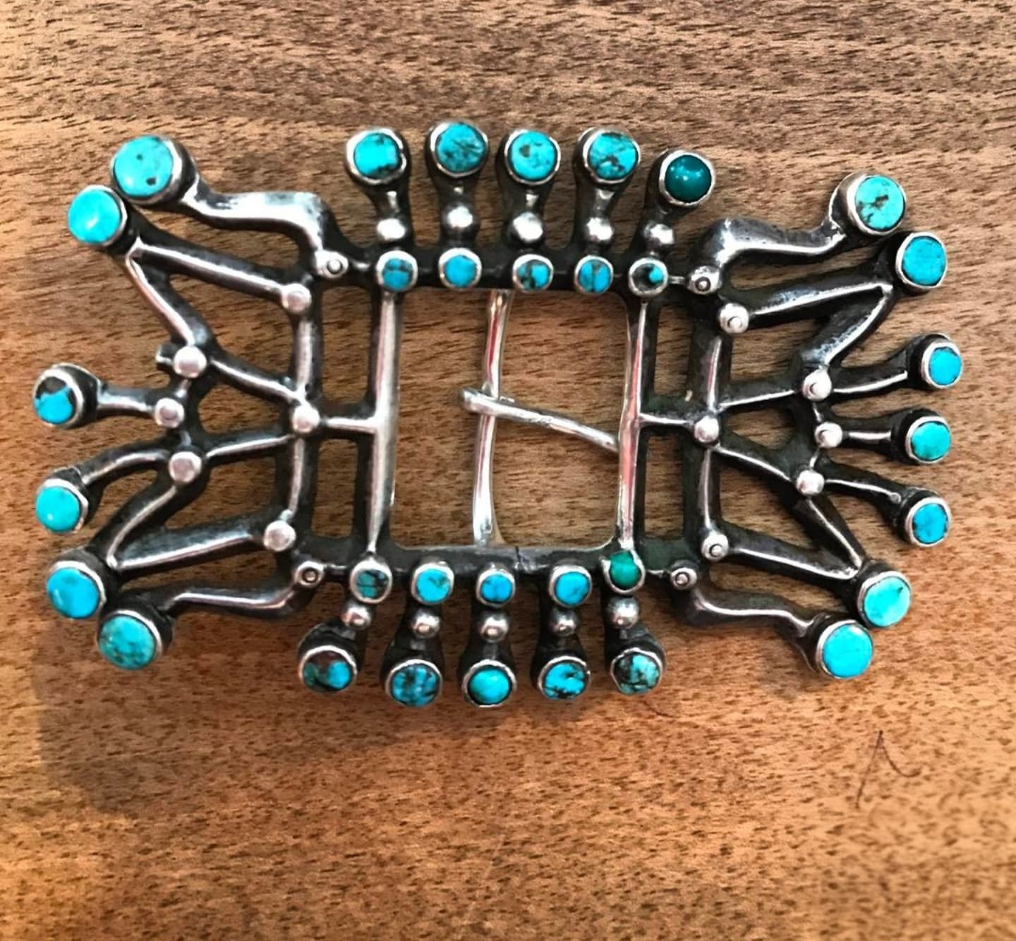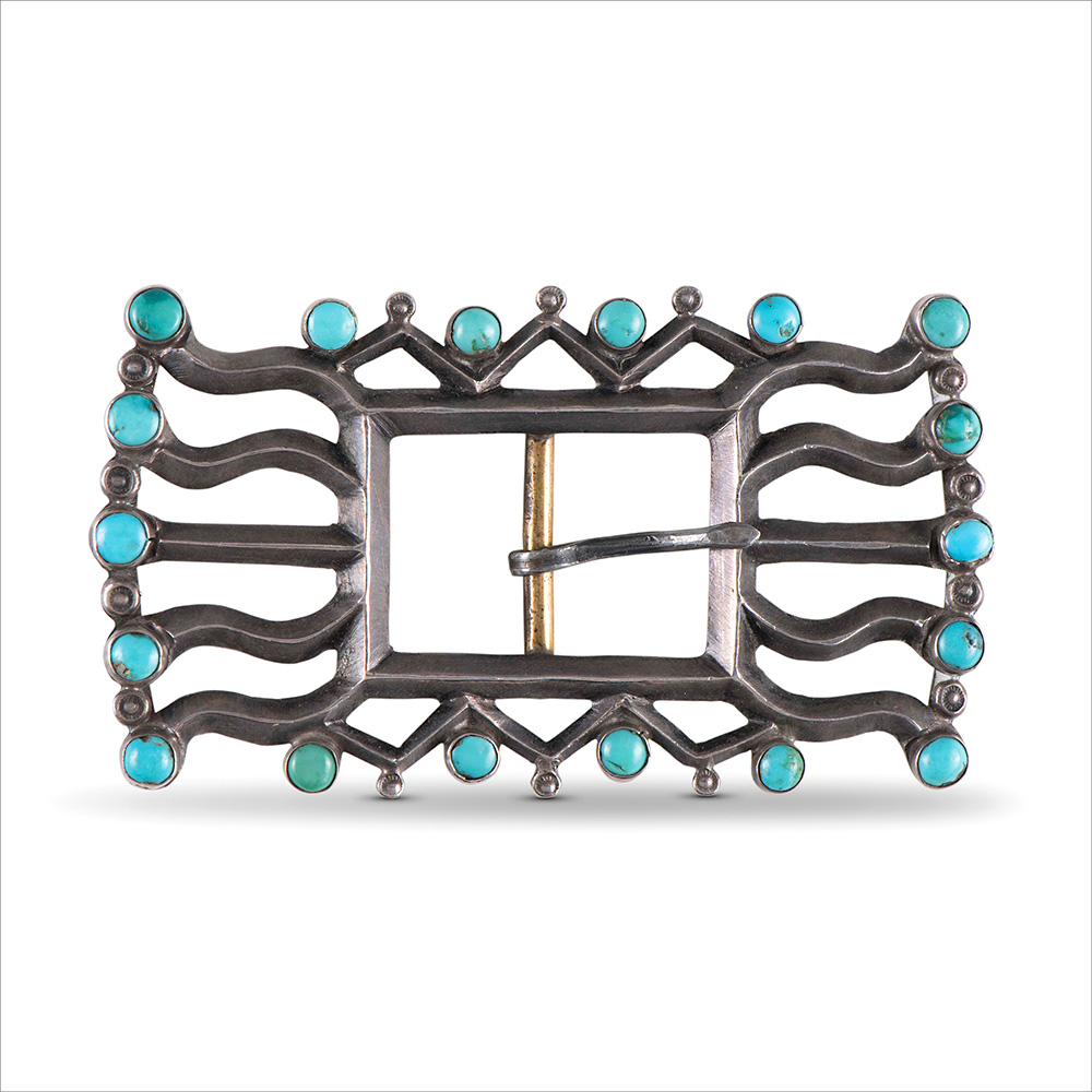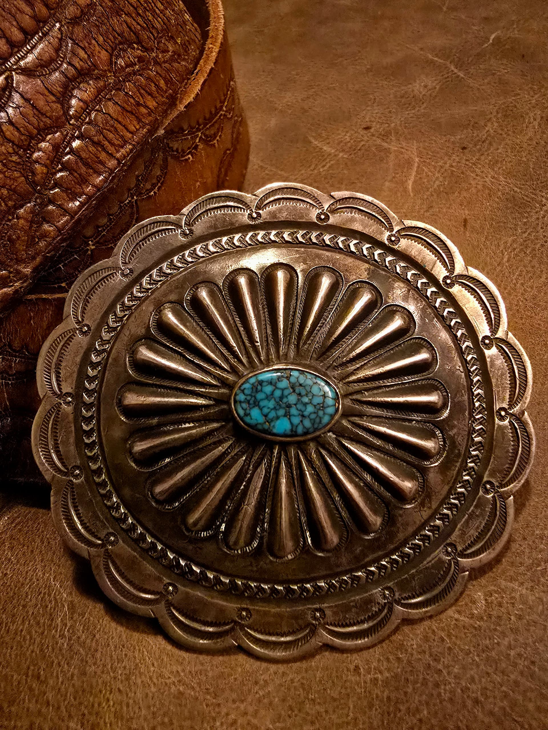 Long ago, pre-Ayatollah, through the trading company I worked for at the time, I worked on the road selling Persian Turquoise from the Levian family of Iran. A great deal of the material I carried, while mined in Iran, was cut in Idar Oberstein Germany. The turquoise in your buckle has the same characteristic template cut shape and dome one sees in material cut in Idar Oberstein. I was fortunate enough to meet the Levian Patriarch when he came to Gallup to meet with my employers, and worked mostly with his son Larry, who is the same Levian behind the branded “LeVian” fine jewelry lines, and “Chocolate Diamonds”.