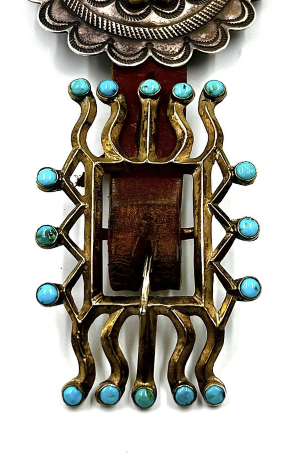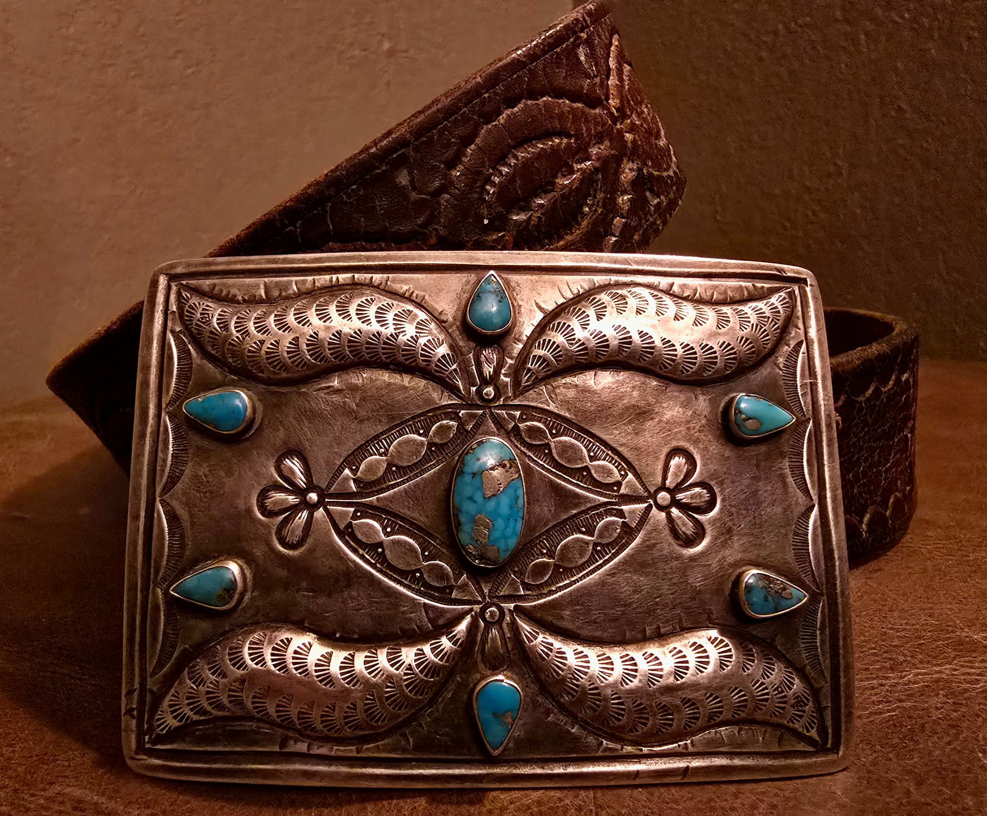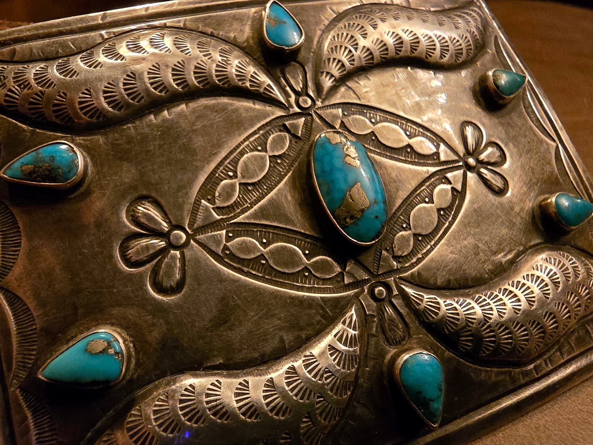 Long ago, pre-Ayatollah, through the trading company I worked for at the time, I worked on the road selling Persian Turquoise from the Levian family of Iran. A great deal of the material I carried, while mined in Iran, was cut in Idar Oberstein Germany. The turquoise in your buckle has the same characteristic template cut shape and dome one sees in material cut in Idar Oberstein. I was fortunate enough to meet the Levian Patriarch when he came to Gallup to meet with my employers, and worked mostly with his son Larry, who is the same Levian behind the branded “LeVian” fine jewelry lines, and “Chocolate Diamonds”.