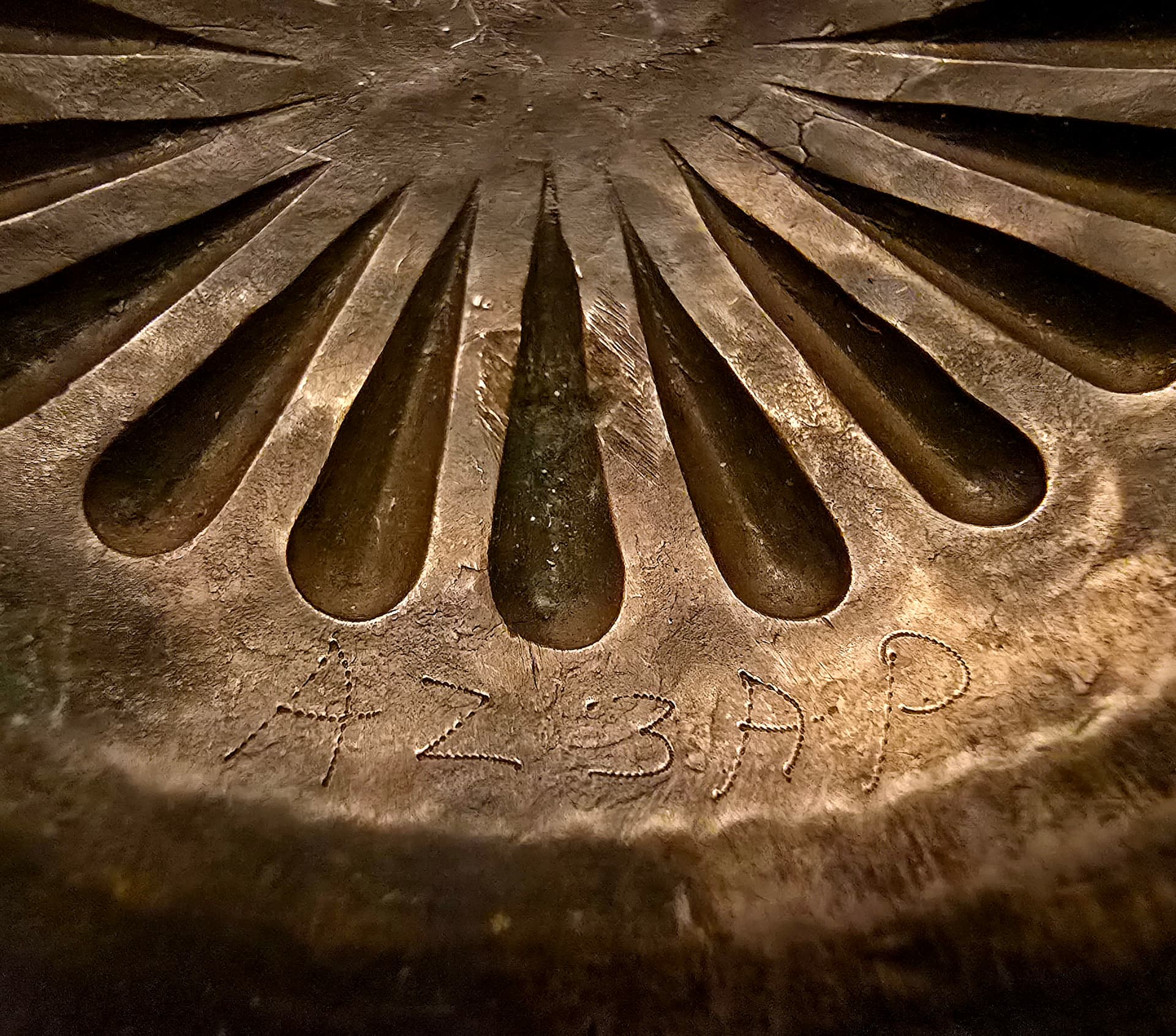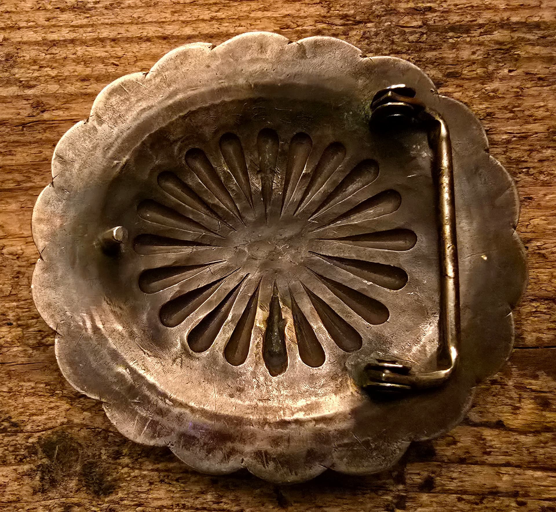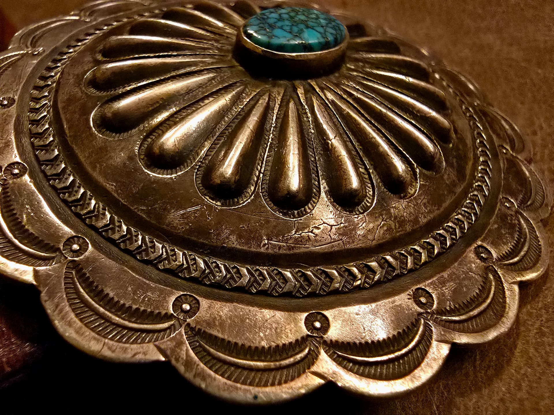 I’ve managed to stumble across a couple buckles recently. Being inspired by @TAH to find a Phase 3 concho converted to a buckle, similar to his masterpiece crafted by Hosteen Goodluck, I thought this one was tastefully done. I really like the stampwork and I thought the stone was pretty. It’s got a beautiful, dark color, as well. In the second photo, there are some evident cracks in one of the radiating repoussé elements, as well as on the area between these and the border, which I love to see. There’s also what appears to be a layout line scribed at the outside of the repoussé, just above these cracks. On the back, one can just barely make out the remnants of where the strap was originally soldered in place, speaking to this buckle’s former life as a concho. I can only imagine what the rest of the belt looked like. I perceive all of these things as stories written in silverwork, and I thoroughly enjoy the read. I also got a kick out of the trader’s code engraved on the back: the last two letters are my initials.