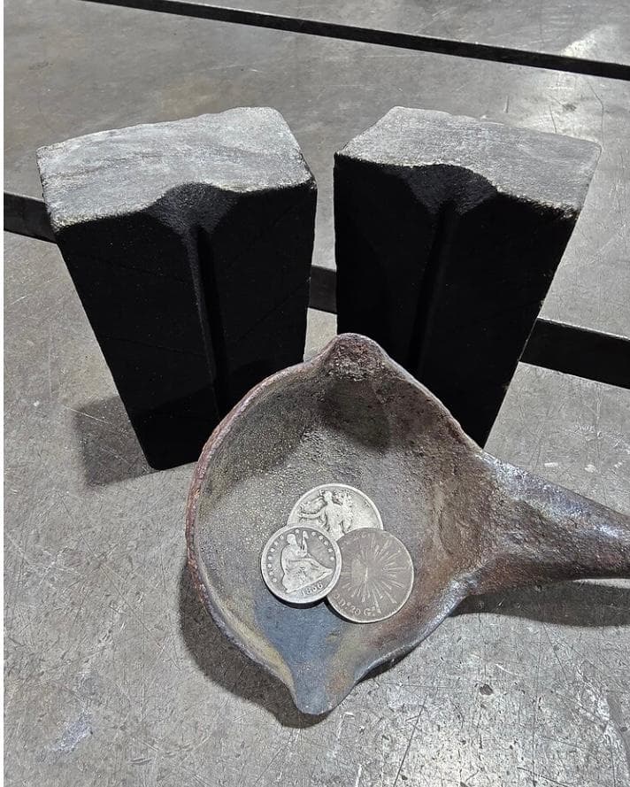 Zia, I utilized the tufa mold simply for casting the coin silver ingot. I don’t have ingot molds, and this is the way this would have been done when the concho was originally crafted. (In Tom’s and I’s opinion anyway.) Once the ingot was cast, from there it was hand forged to a roughly round shape, (this imparts both strength and stresses into the ingot) it was then annealed to soften it, went through more forging, and then it got passed through the rolling mill. The mill helped true the round shape Tom desired, while lengthening the blank. Once the blank passed through the final sizing groove in the mill, it was drawn through the drawplate with the drawing tongs seen in Tom’s first photo. This finalizes the shape and is the last step before cutting bending, and welding the components to Tom’s beautiful concho. ![]()