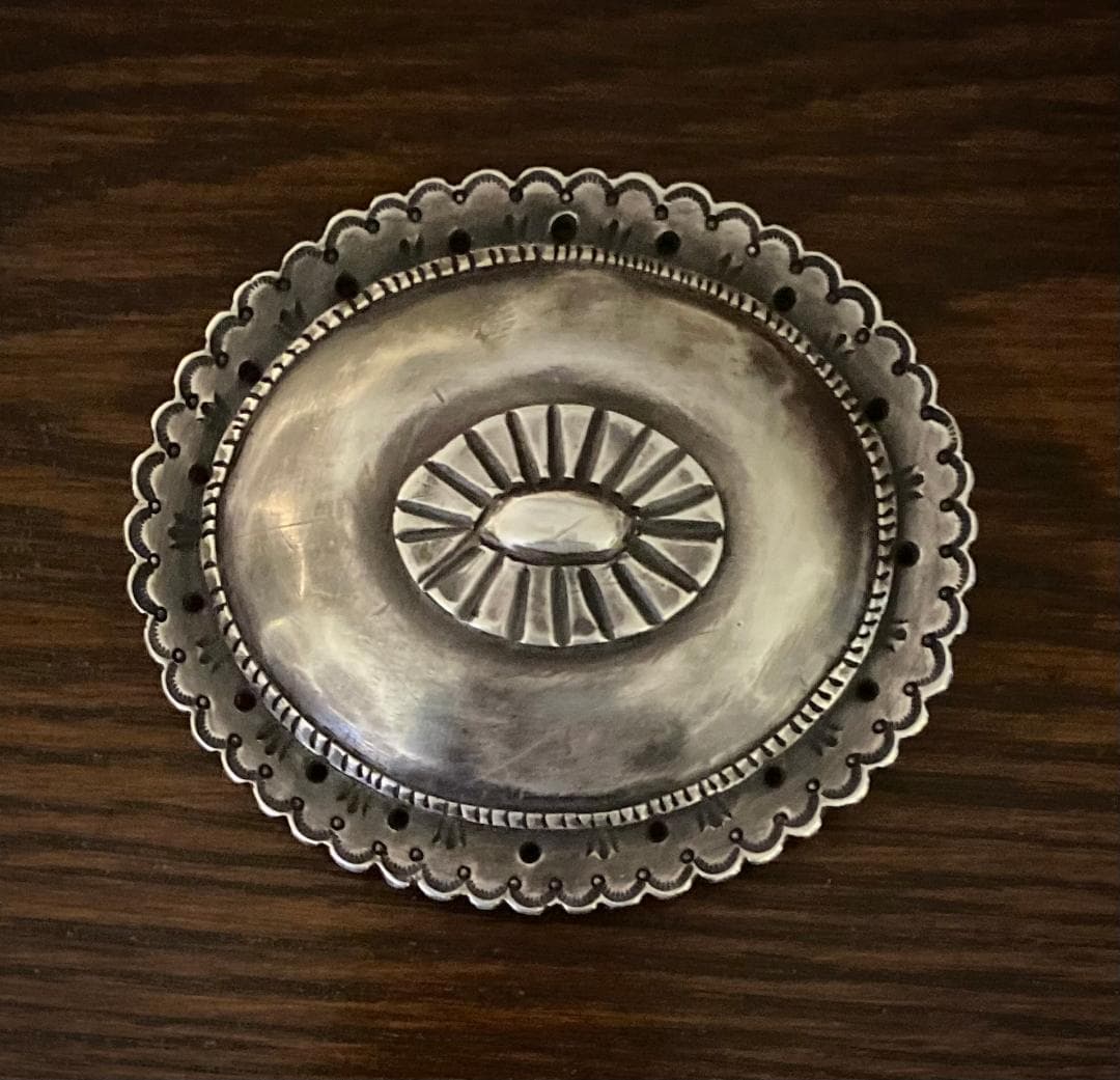 This buckle is now one of my favorites with its broad area of unworked silver, its low relief, central medallion that is a result of filing away the surrounding surface and adding radiating lines with a cold chisel, the shallow scalloping, minimal stamp work, and the overall imperfections, which suggests this concho was created with limited tools and resources.