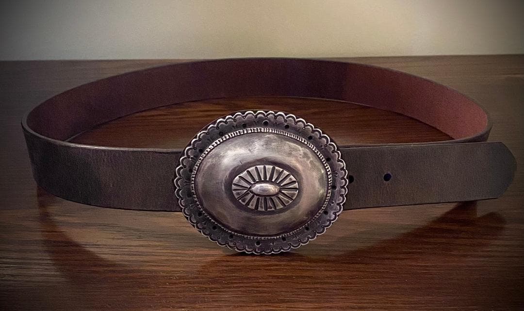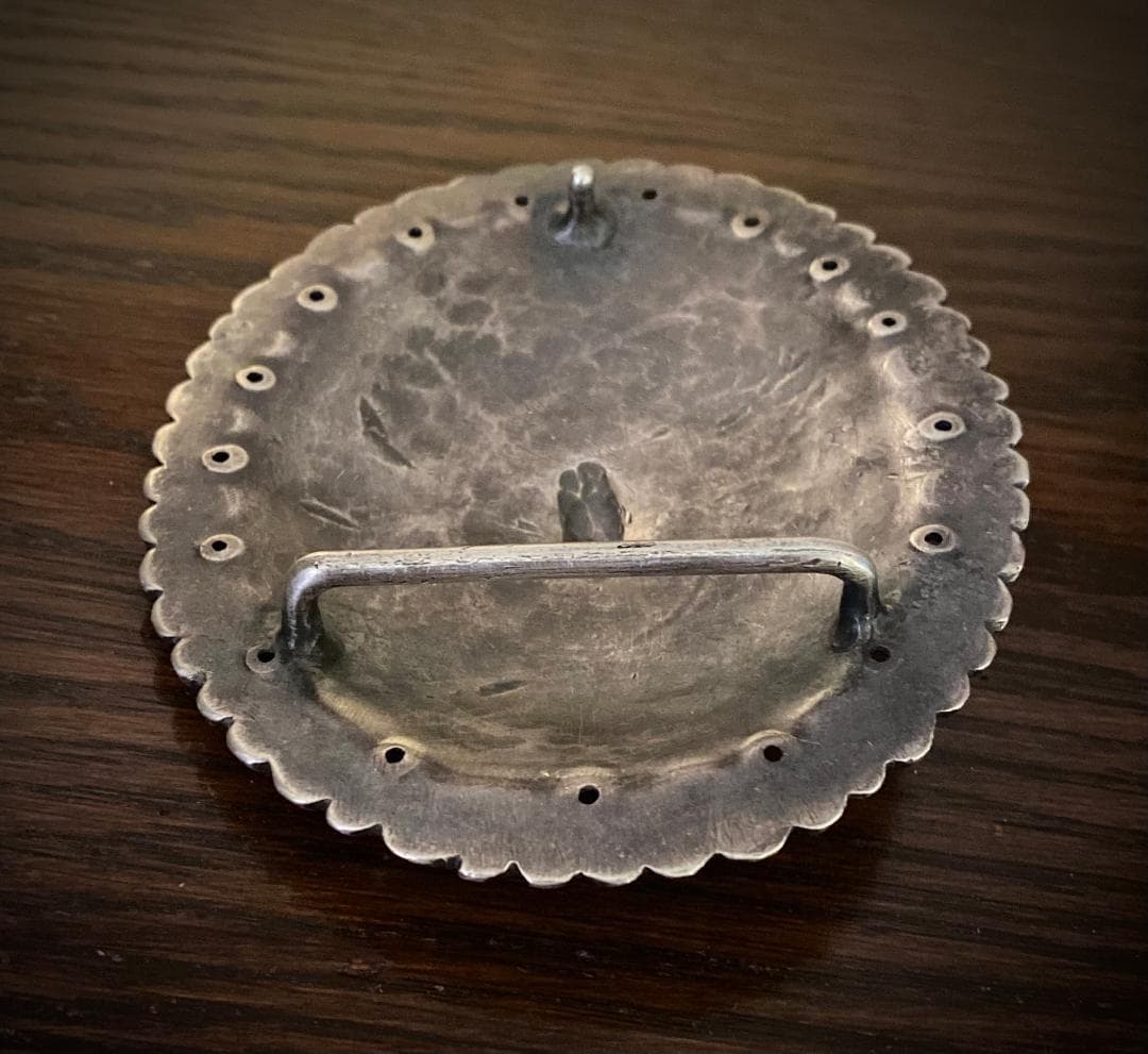 Back in August 2024, I was in Scottsdale and visited John C. Hill Antique Indian Art. While there, I saw a beautiful, large concho, that appeared to have some age on it. It was mixed in with a few other belt buckles, so I asked John if I could see it. The first thing I noticed when he handed it to me was its significant weight. However, my excitement quickly diminished when I turned it over and discovered it had not been converted to a belt buckle, as it did not have a belt bar or post. Reading my disappointment, John said, “You could always have a commercial swivel bar and post soldered on the back.” But, to me, this concho was too cool and too special for commercial findings, so I reluctantly decided to let it go halfheartedly convincing myself that I really didn’t need another belt buckle.