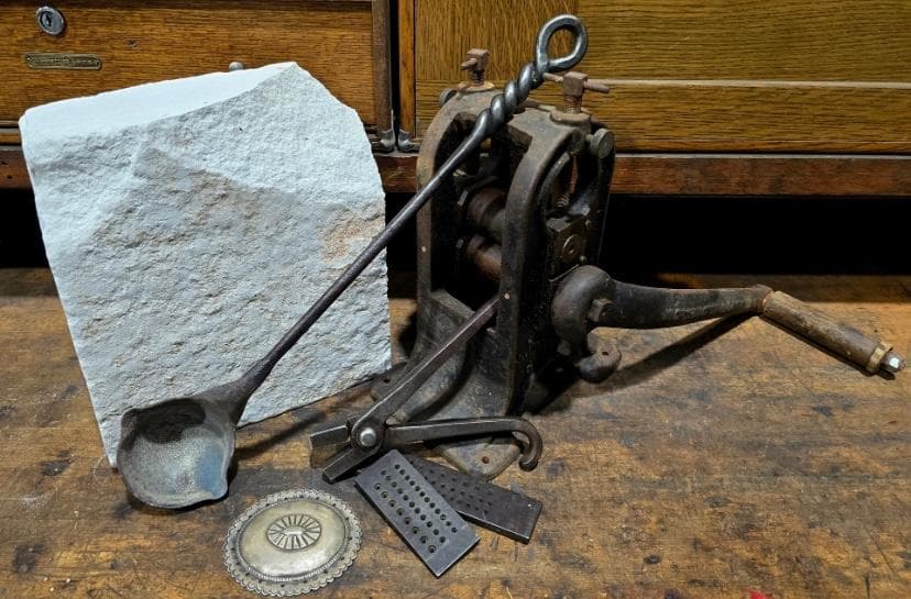 After it arrived, the first thing Aaron did was test its silver purity, which determined the concho was made of coin silver! Being a purist and insisting on being true to traditional Navajo silversmithing techniques, Aaron was set on the bar and post being made from coin silver and that it would be cast from a tufa mold. The following are photos from Aaron and the numerous steps and vintage equipment it took to convert this concho to a belt buckle.