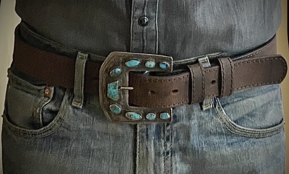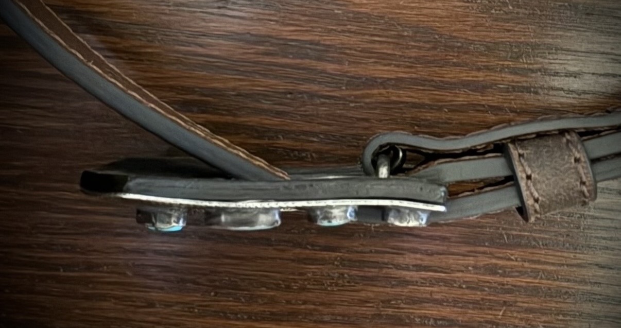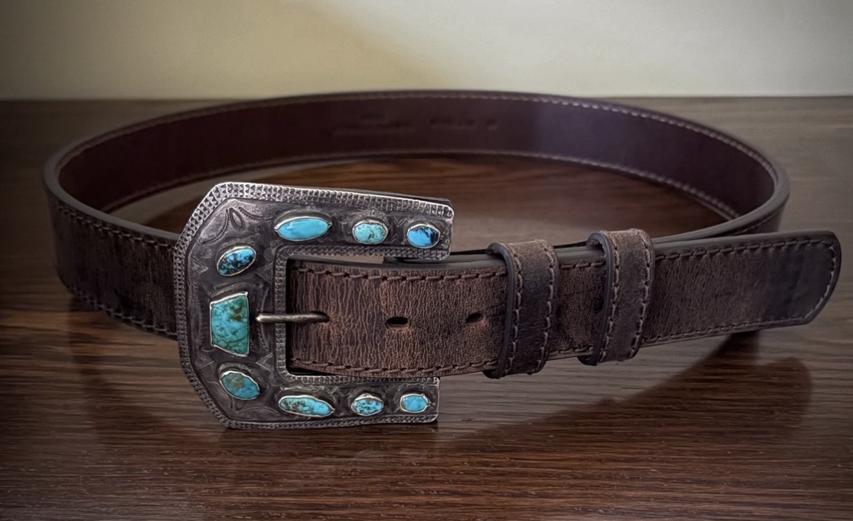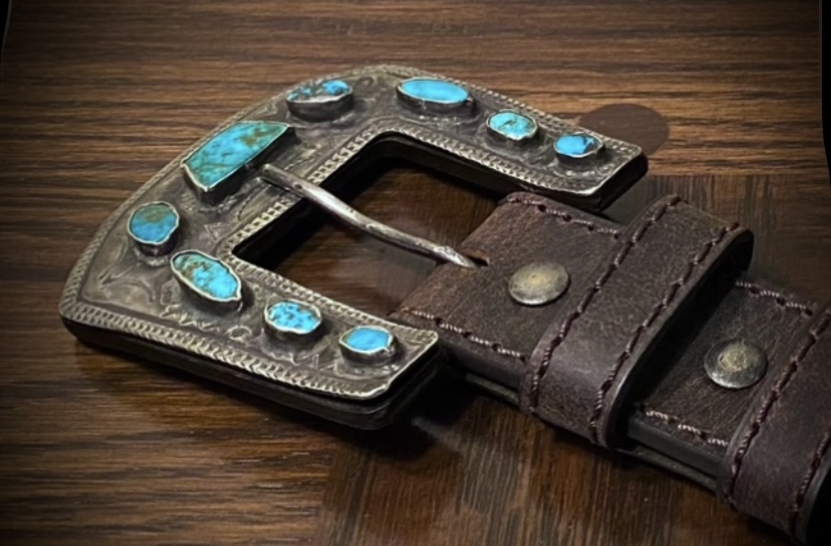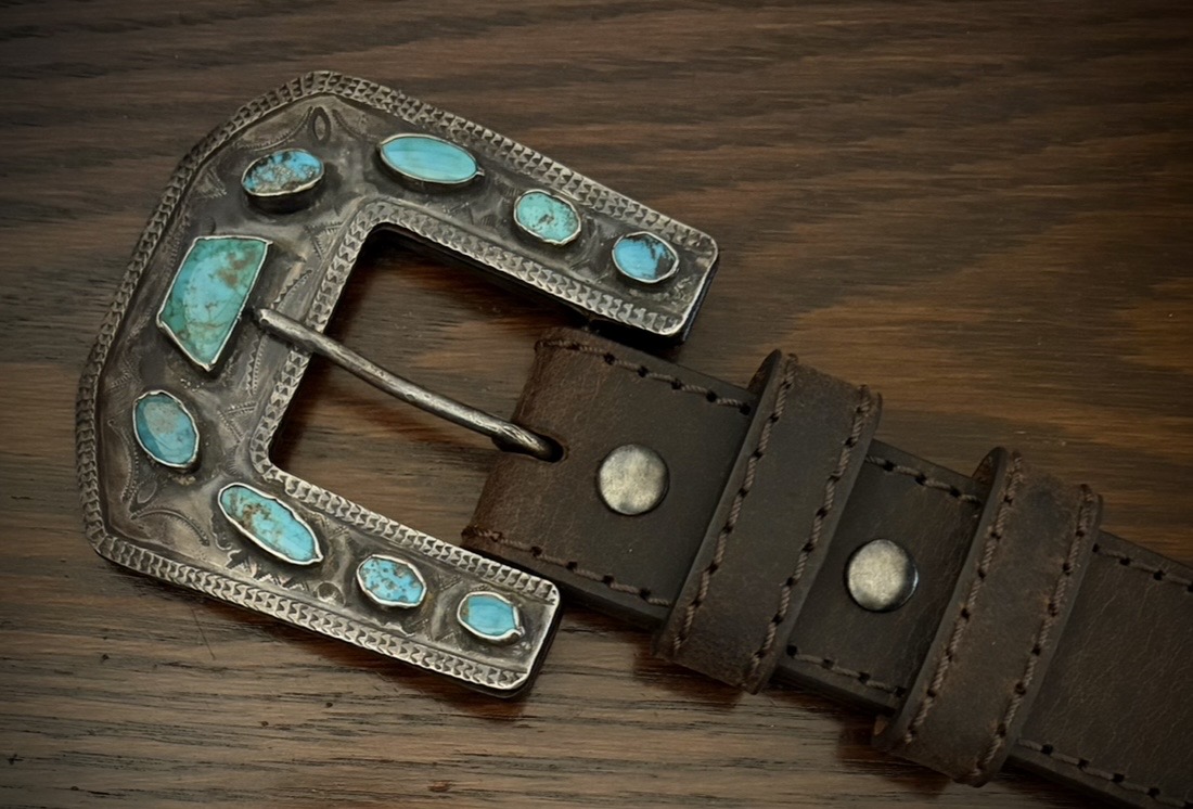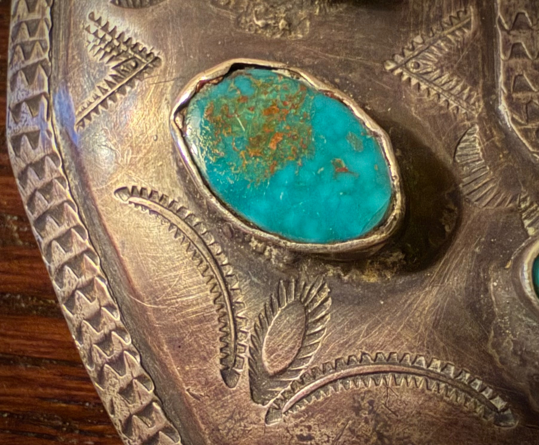 Congratulations again on pulling the trigger on this one, Tom! This buckle has many great attributes: the stones and bezels ranking high among them. The turquoise is jaw dropping and vibrant against the beautiful dark color of the silver, both of which are very impressive in person. The stamps are just lovely. Thanks to Tom sharing a close up photo, some stamp mis-strikes are evident and I just love that.