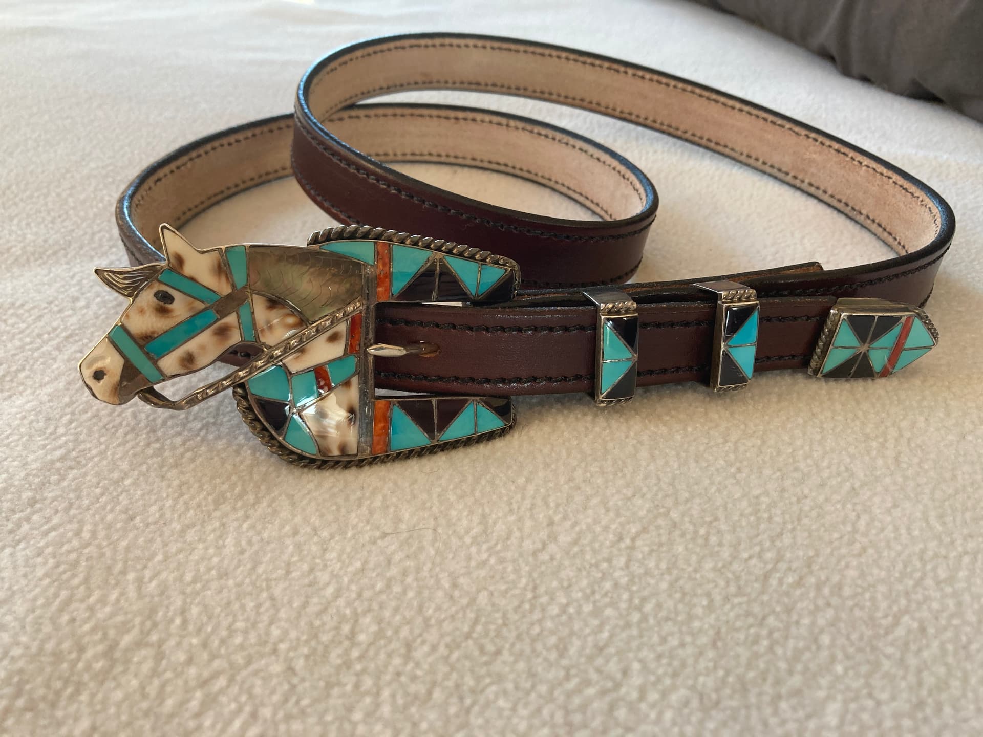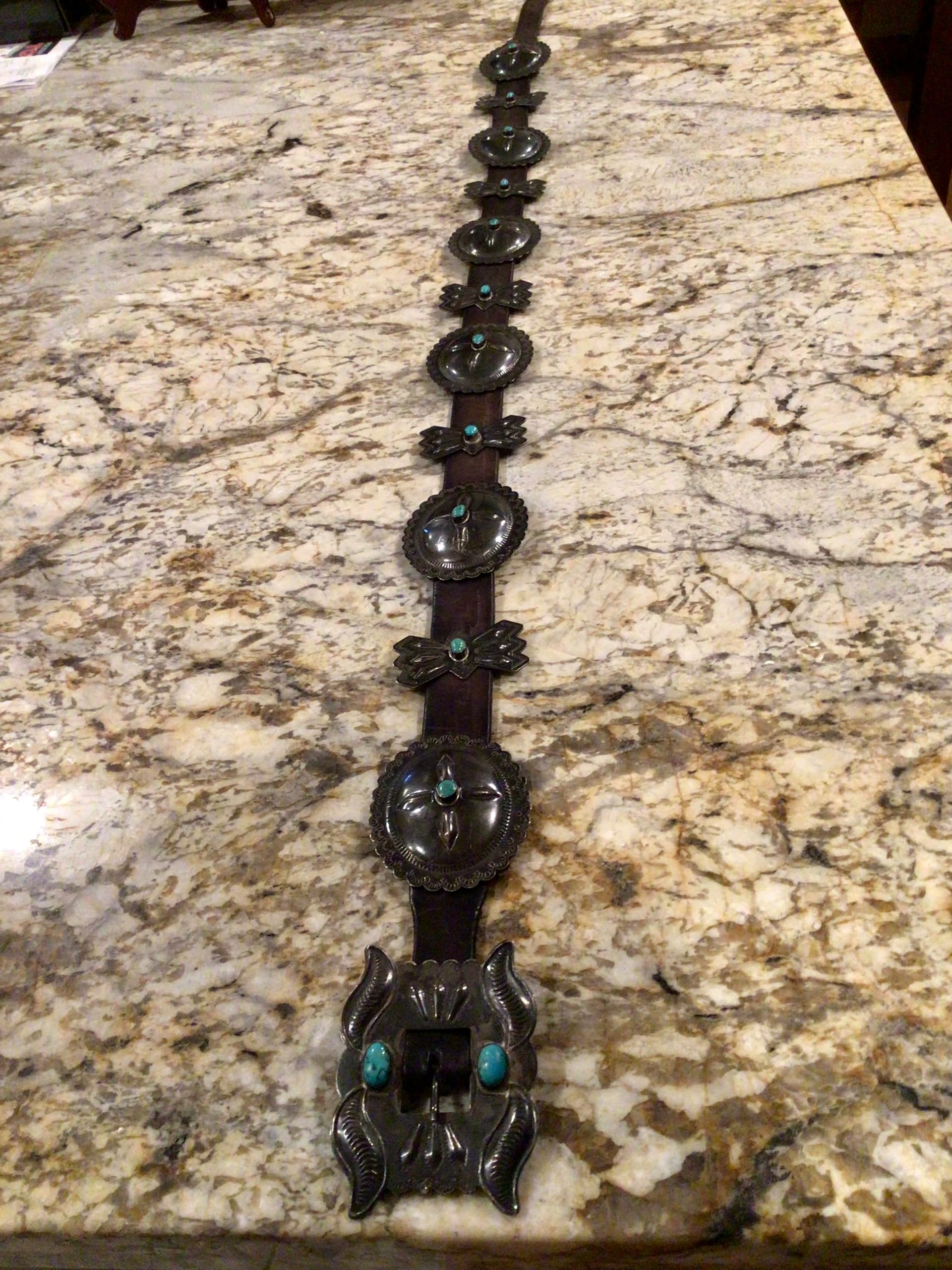 This is the belt that I was told was likely by Roger Skeets Sr. It’s very heavy and long. I removed one concho and one butterfly to wear it. When I was in Scottsdale for the Heard Show, I was talking concho belts with some nice folks at Dennis June gallery. One of the elderly men there said it certainly could be Roger Skeets Sr. So that all I know😊: