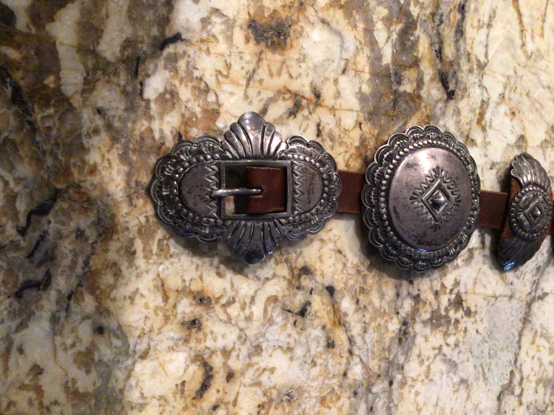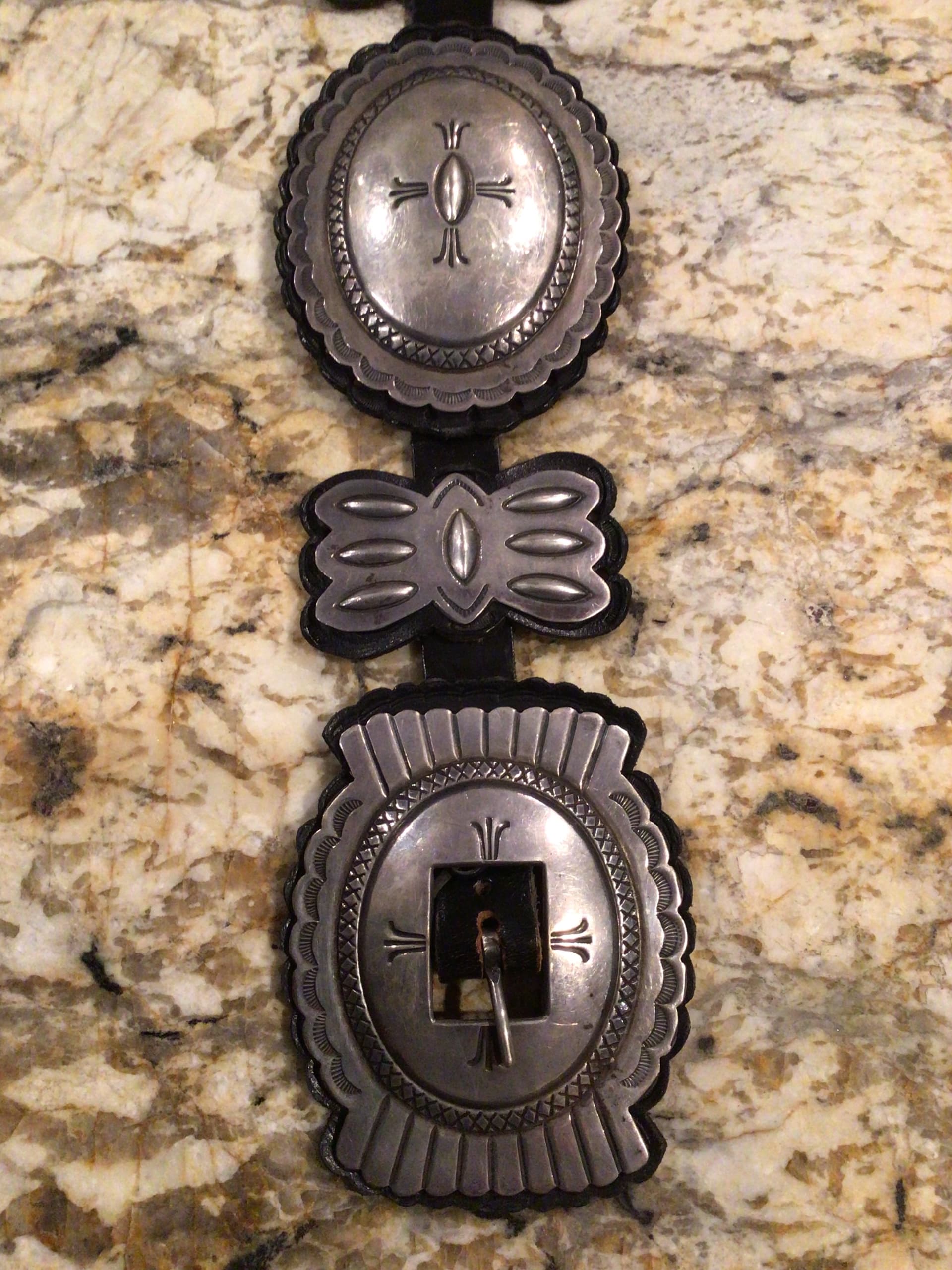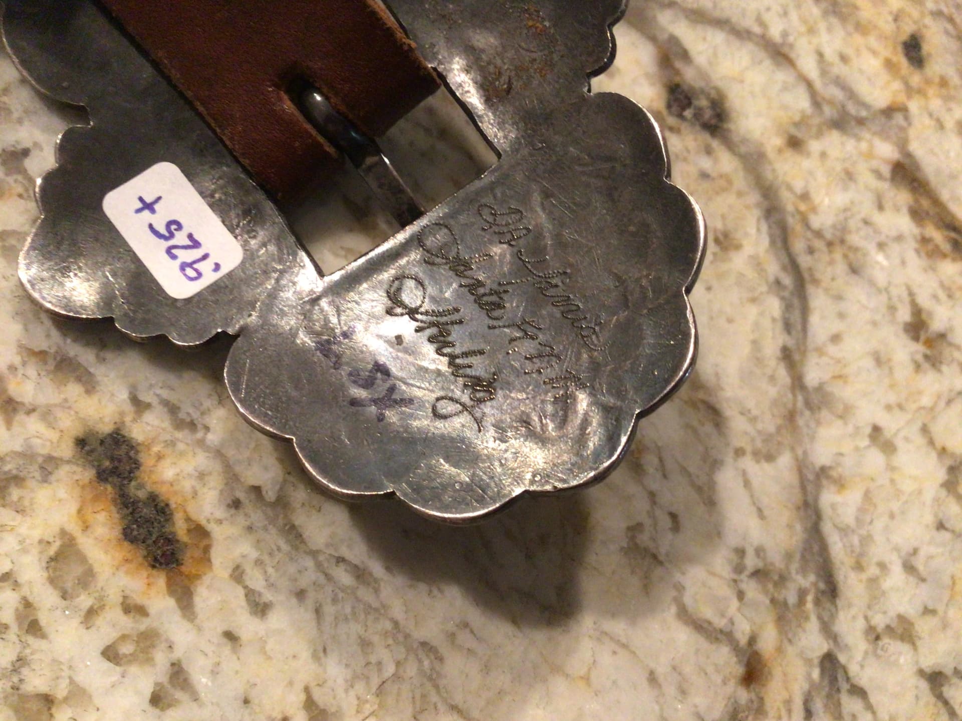 @TAH, etc. As I was going through some boxes of Native American items I came across a couple concho belts I had forgotten about. This one is unusual in my opinion. It tests sterling and has information, I’m assuming the original owner, on the back of the buckle. No hallmark. It was in a grouping of estate items I purchased years ago. Have you come across anything like this in your research on concho belts. Not my favorite belt, but I’d love to know a bit about this style of belt. Thanks!