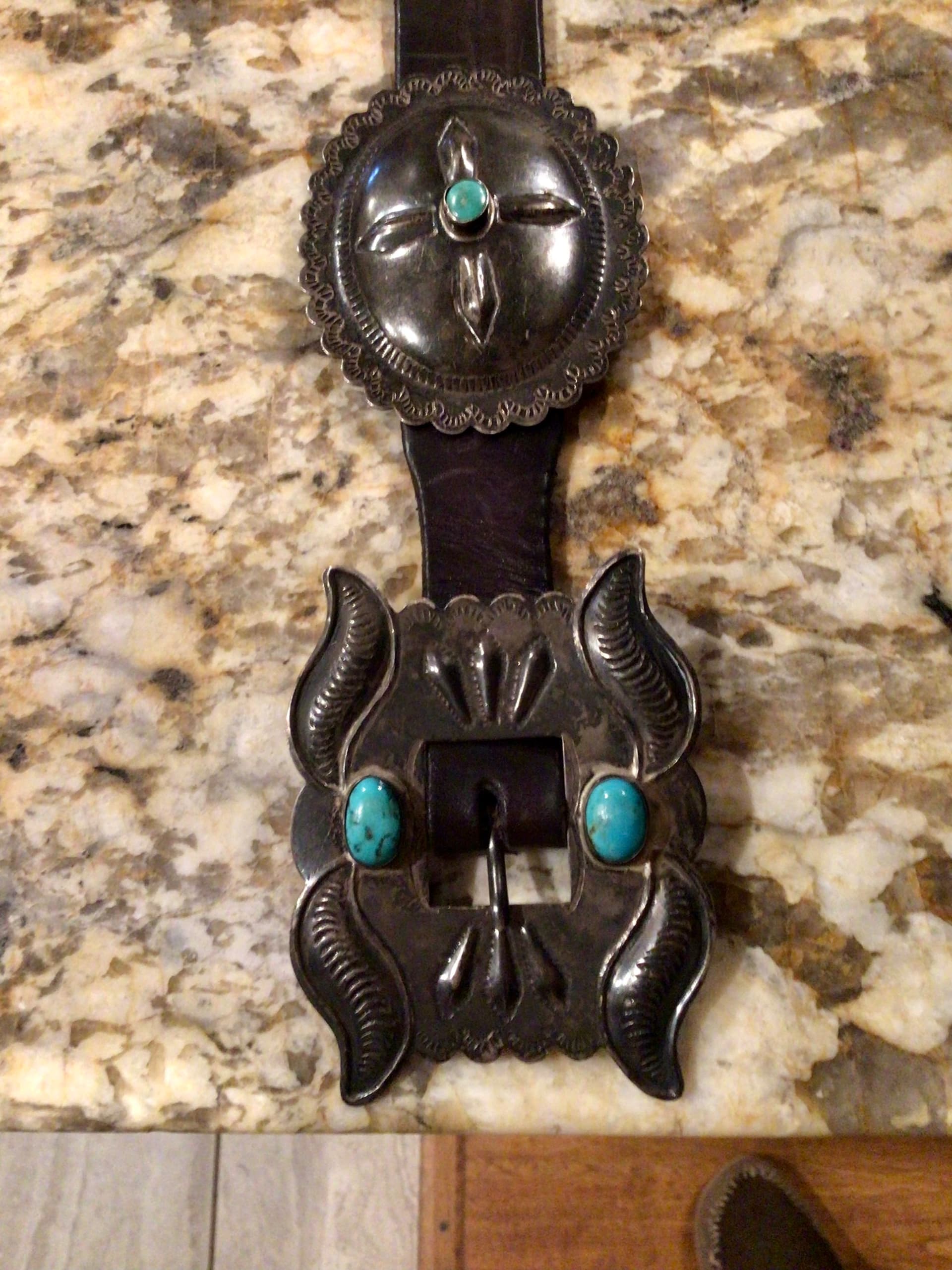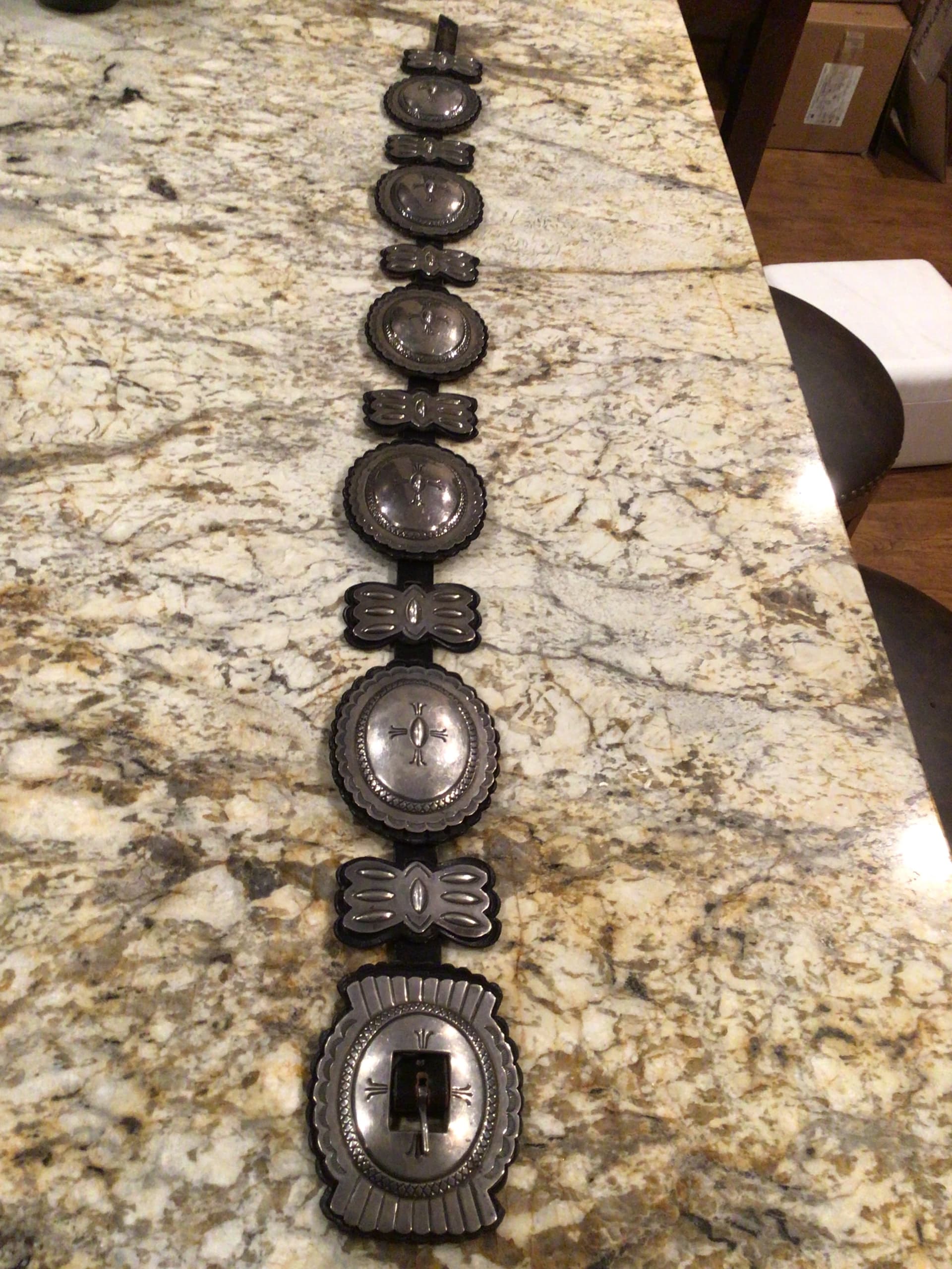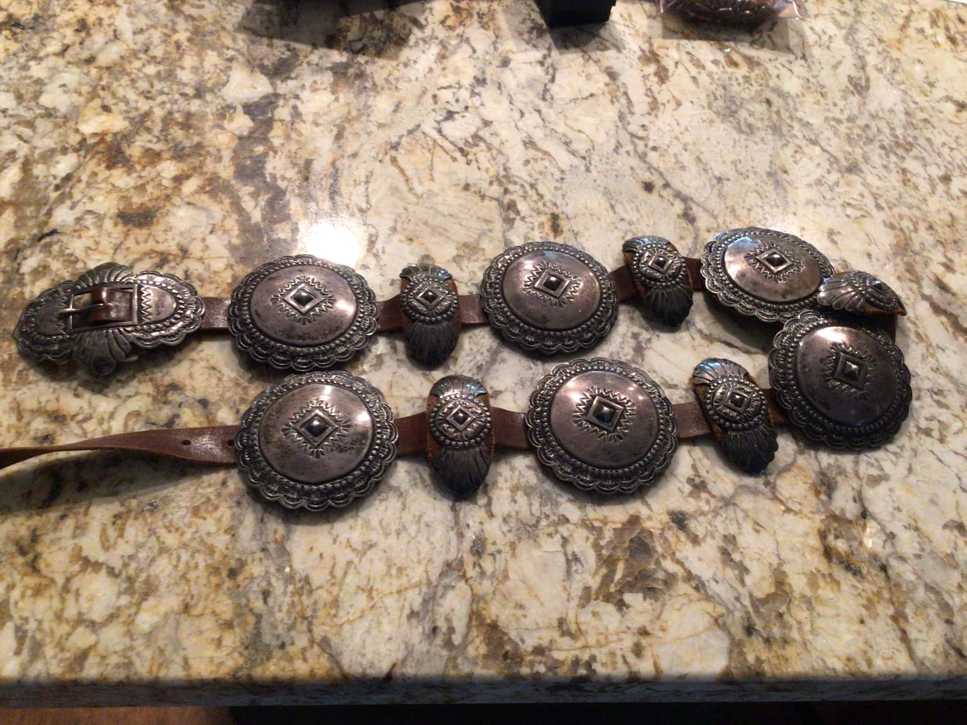 @TAH, etc. As I was going through some boxes of Native American items I came across a couple concho belts I had forgotten about. This one is unusual in my opinion. It tests sterling and has information, I’m assuming the original owner, on the back of the buckle. No hallmark. It was in a grouping of estate items I purchased years ago. Have you come across anything like this in your research on concho belts. Not my favorite belt, but I’d love to know a bit about this style of belt. Thanks!