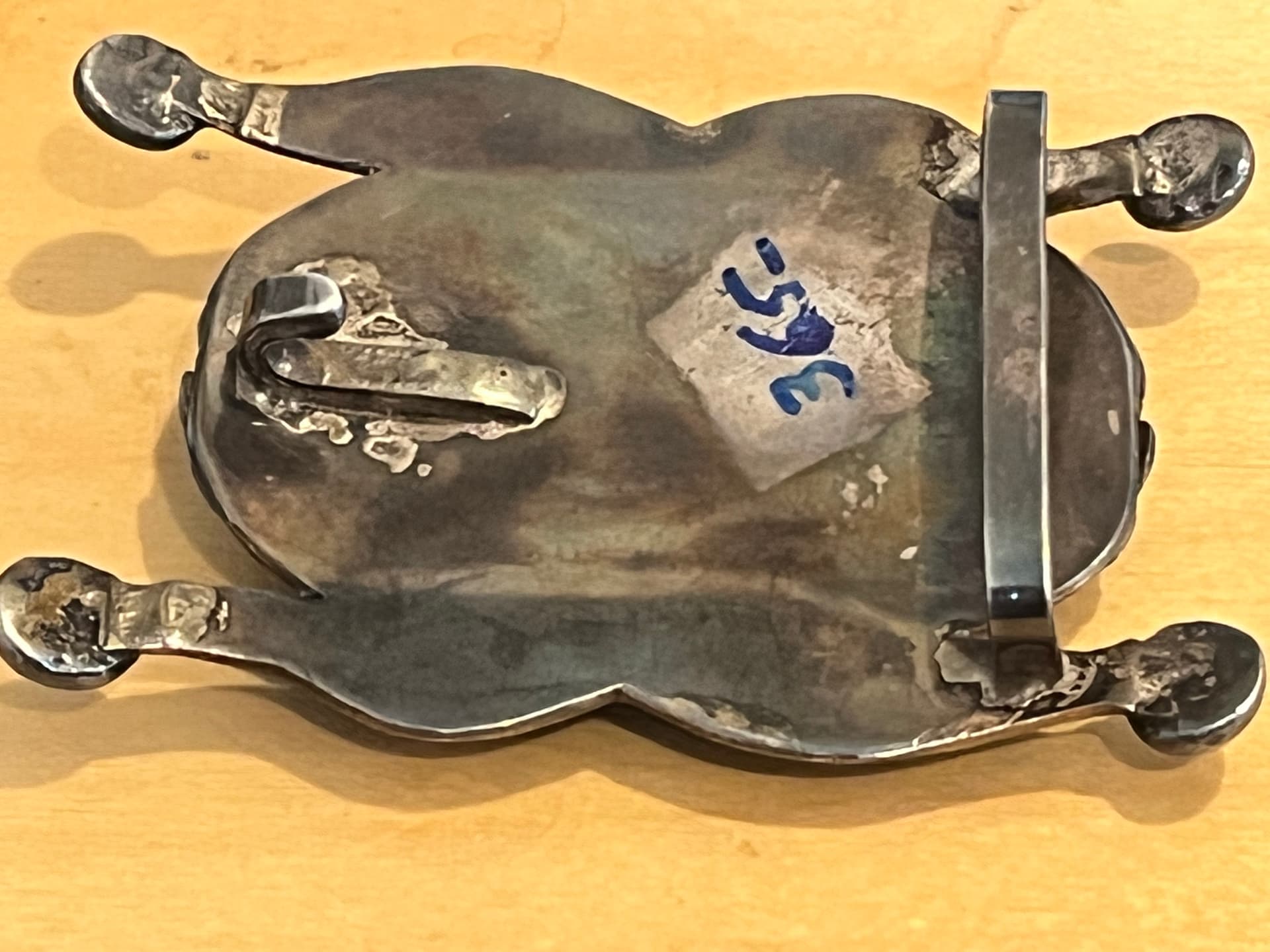 Just picked up these 2 guys. The 1st buckle is approximately 3” by 2” and weighs 82 grams. Some sloppy soldering work on back. It is unsigned. The shiny silver buckle is smaller, it is marked J Wright and sterling. I looked in Hougart’s 3rd edition but did not see name. Anyone know the name?