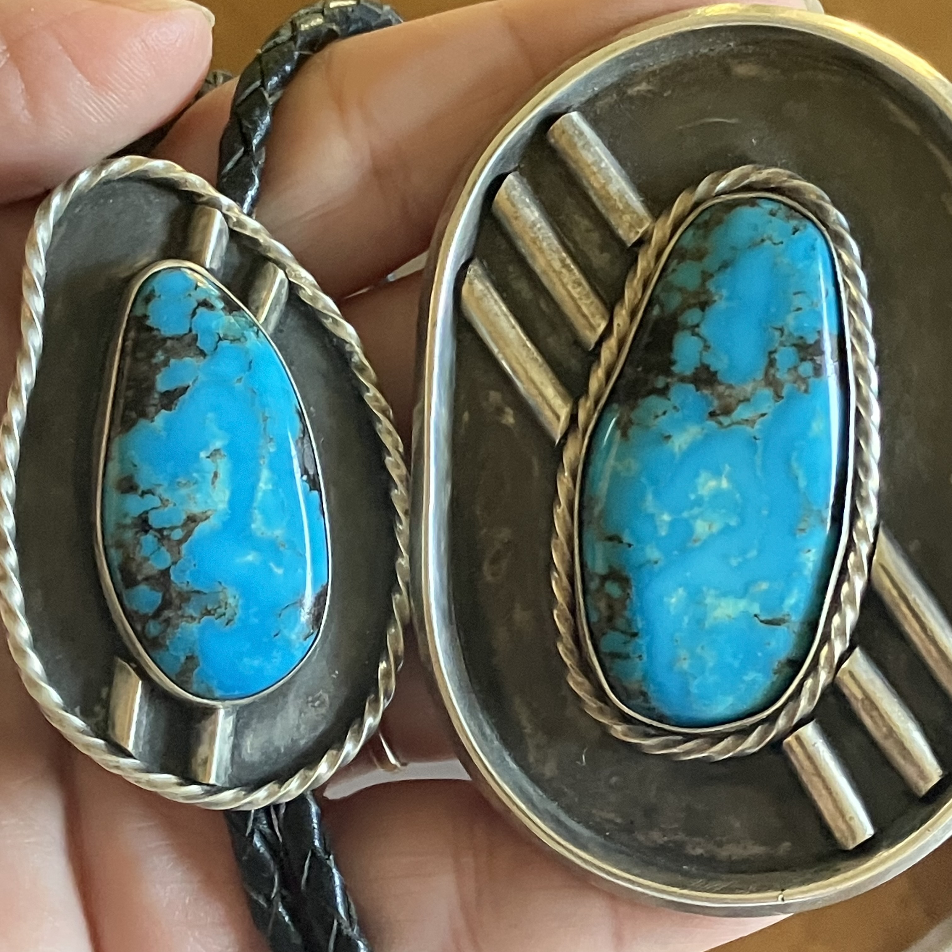 I recently acquired these two pieces of turquoise jewelry; one is a bolo and the other is a buckle. Both pieces seem to have been made by the same person. My question is about the turquoise. I’ve read there are different varieties of Bisbee turquoise such as green, polychrome, in quartz, Smokey , Lavender Pit , etc.