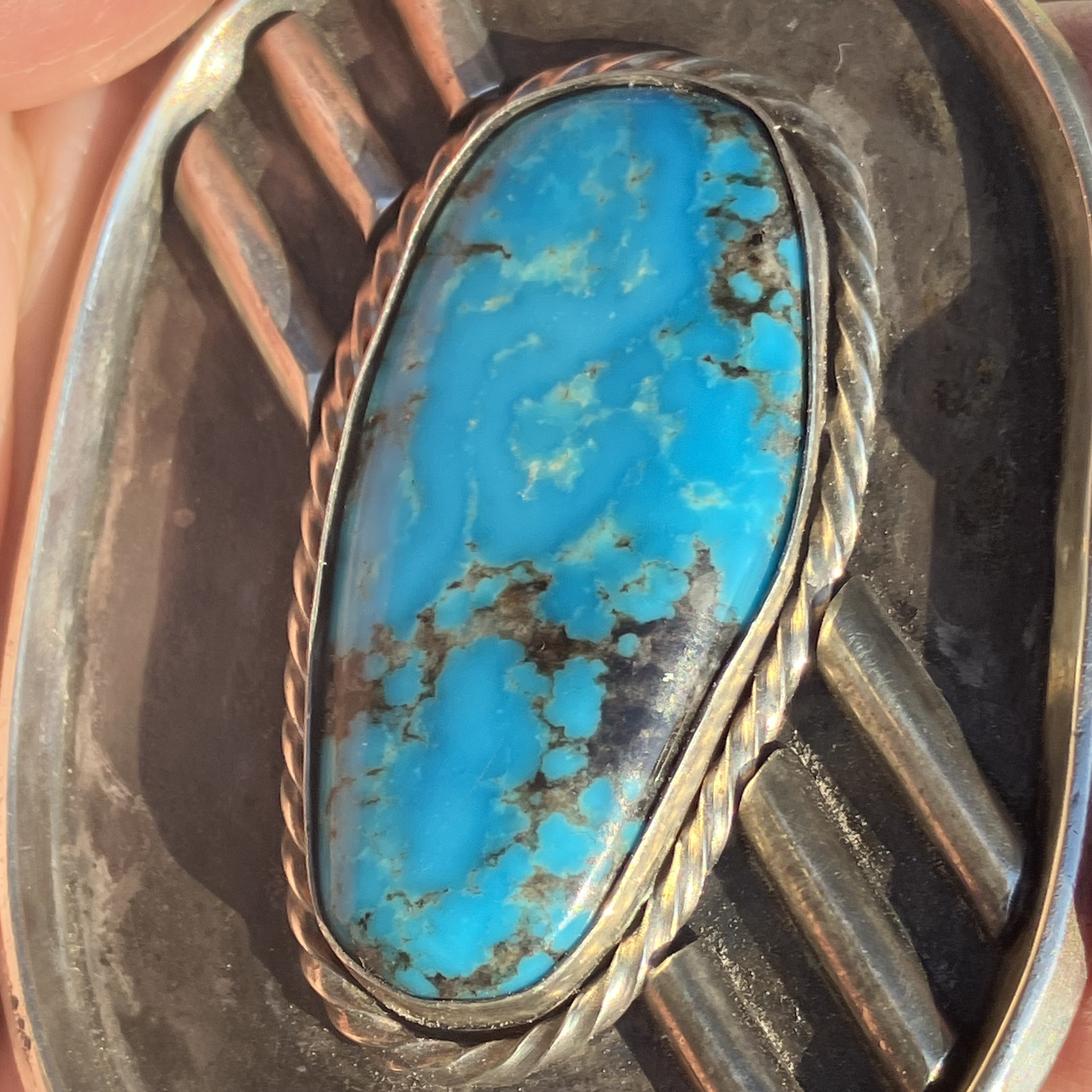 Respectfully disagree. Morenci AND Kingman both can have pyrite, although I don’t see pyrite in these pictures anyway. I have Kingman with darker matrix (although the matrix in this buckle’s stone isn’t overly dark). Bisbee is not particularly known for having pyrite, and not sure what exactly you mean by “silver matrix for the pyrite.” Morenci is less common than Kingman, so it’s more likely that this is stabilized Kingman.