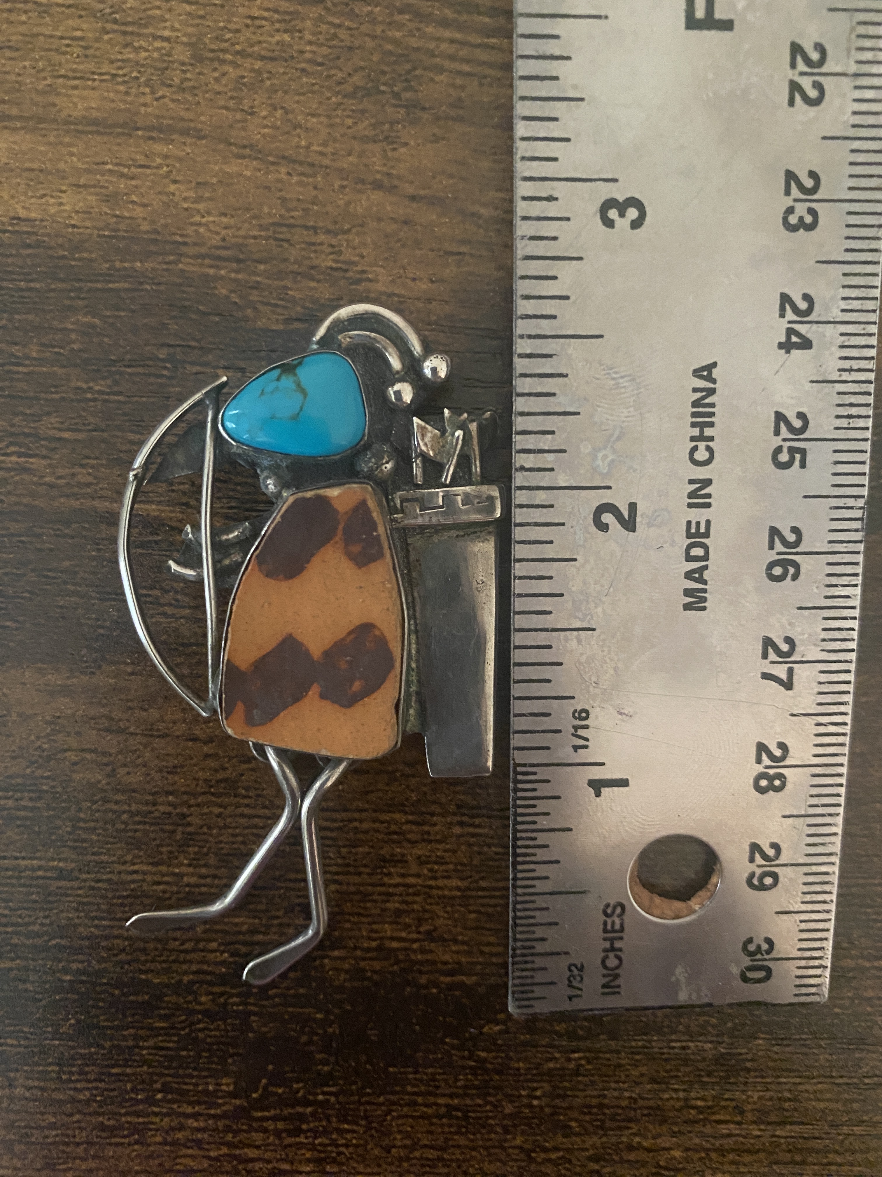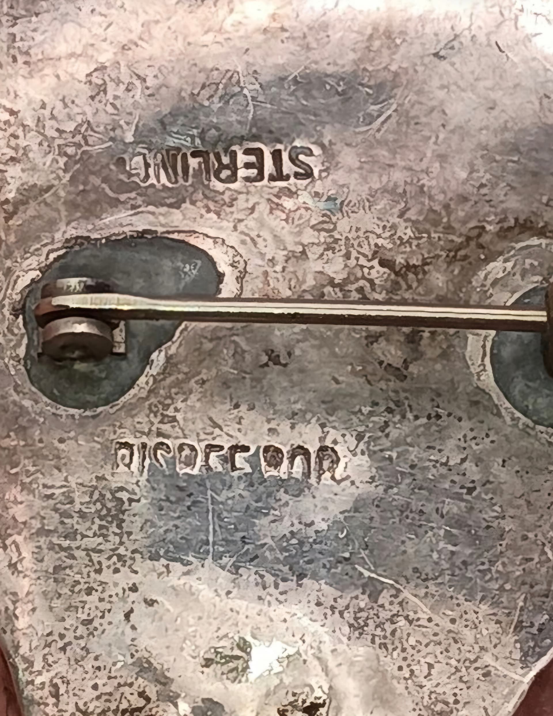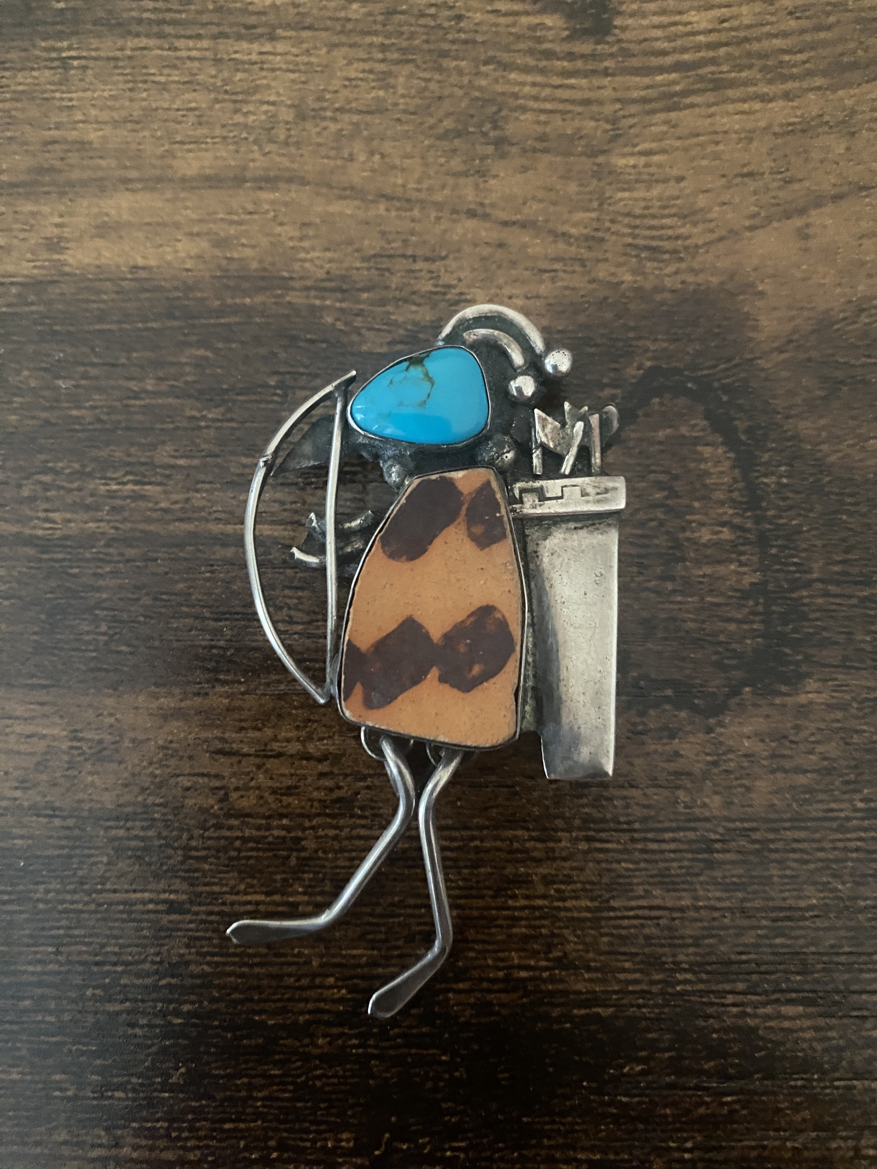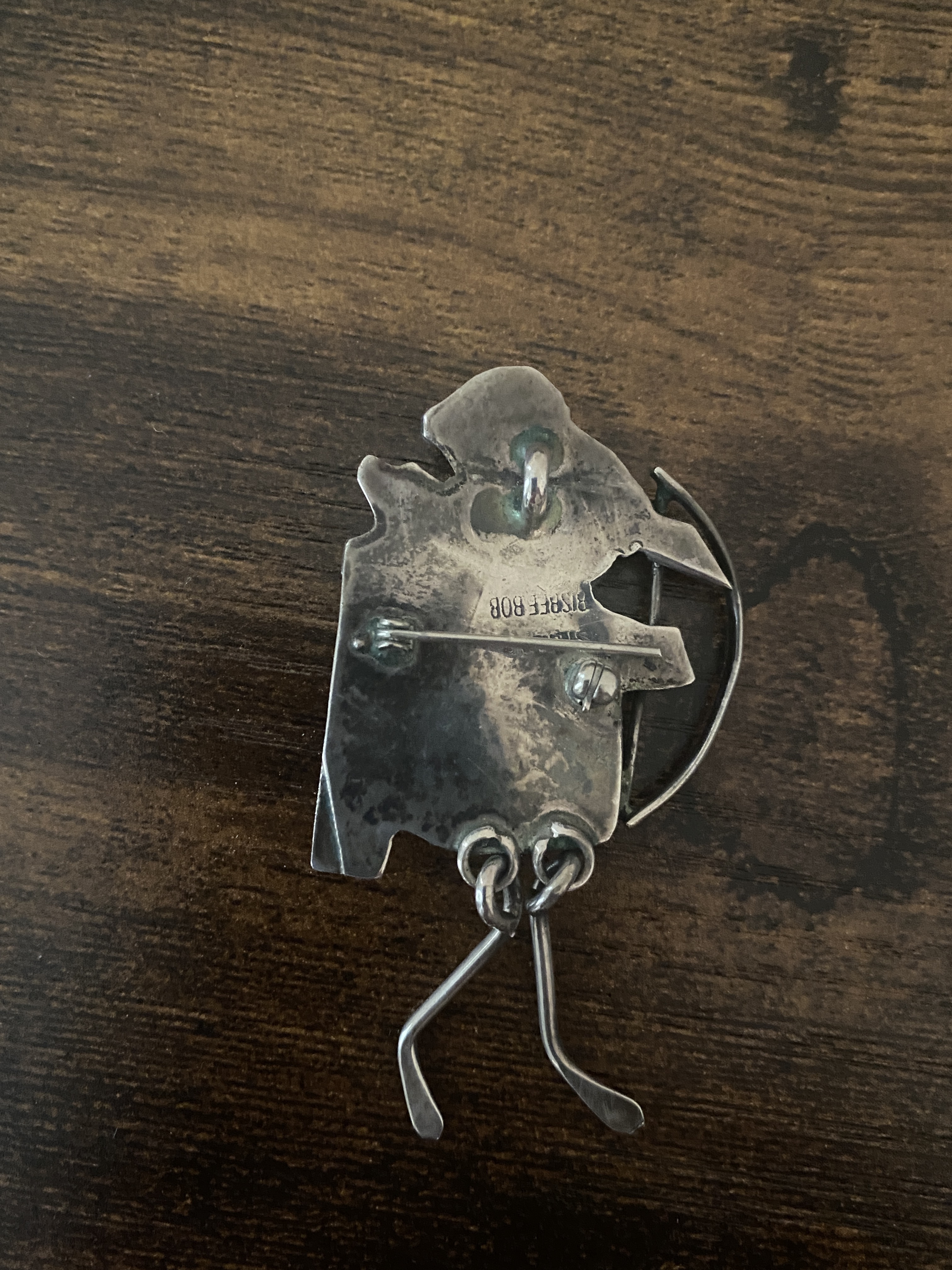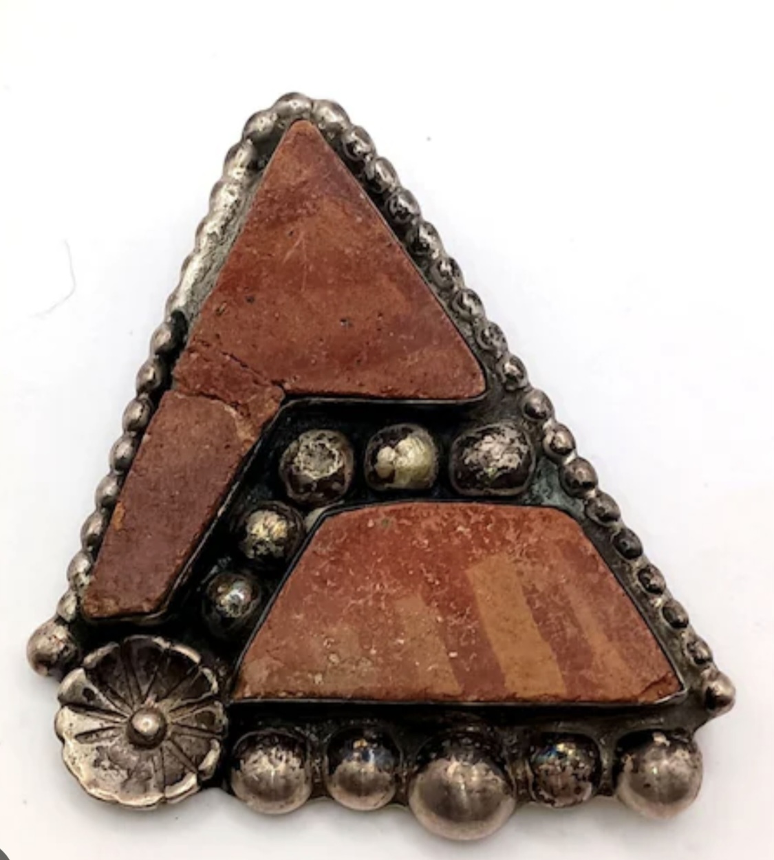 The body appears to be a pottery shard. Similar to the pendant turned pin below, also made by Bisbee Bob.