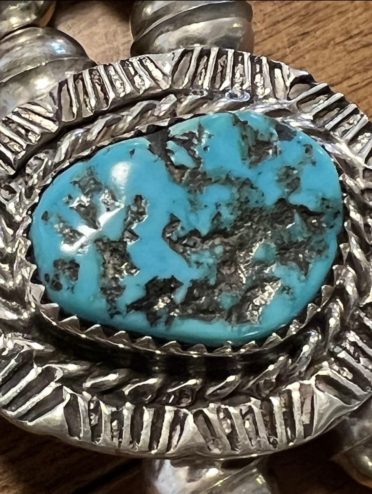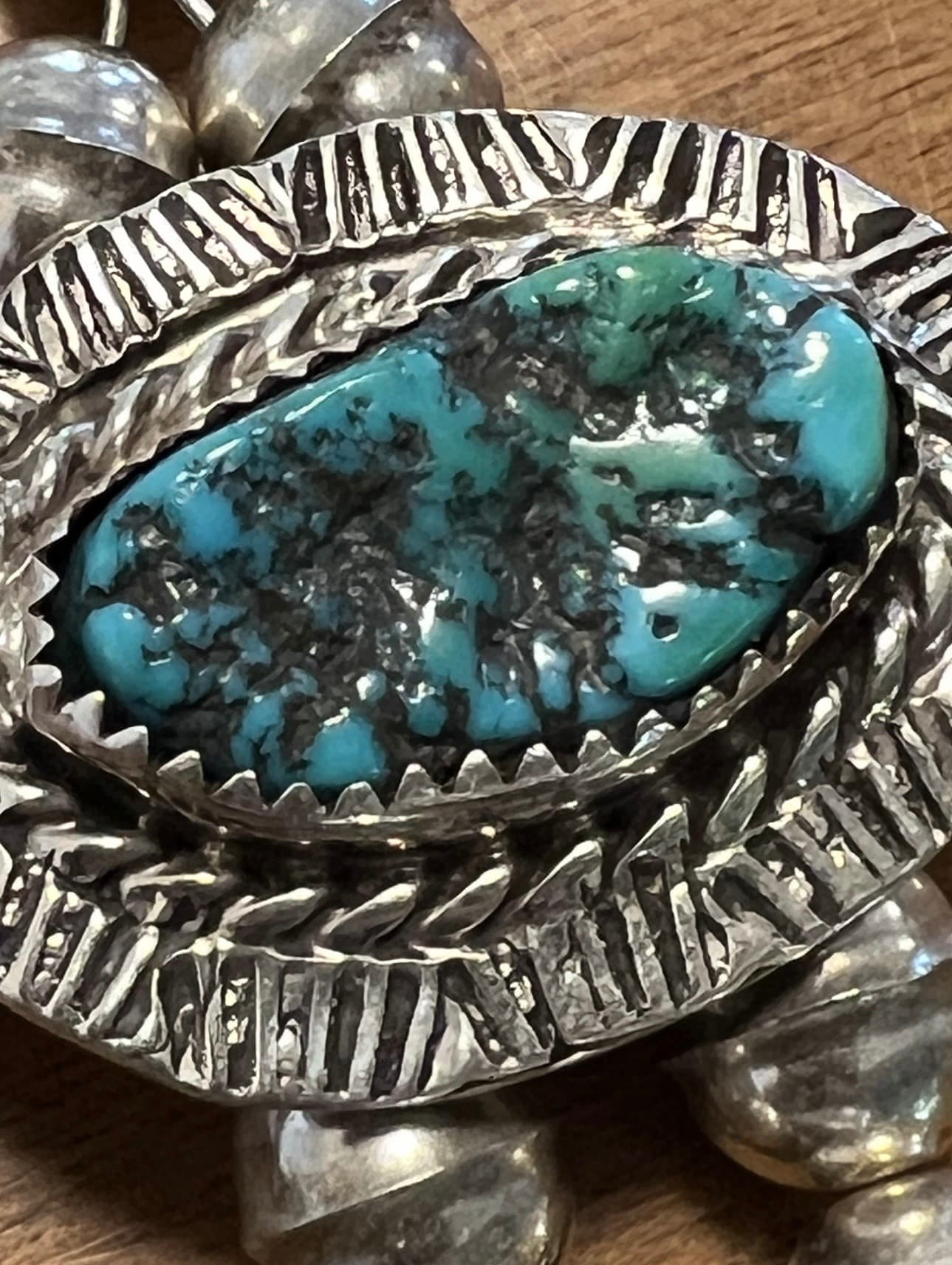 The owner of the piece says it weighs 180g, that it isn’t magnetic, and they believe the stones are genuine. They say they’ve been told by experts that it’s genuine Kingman turquoise.