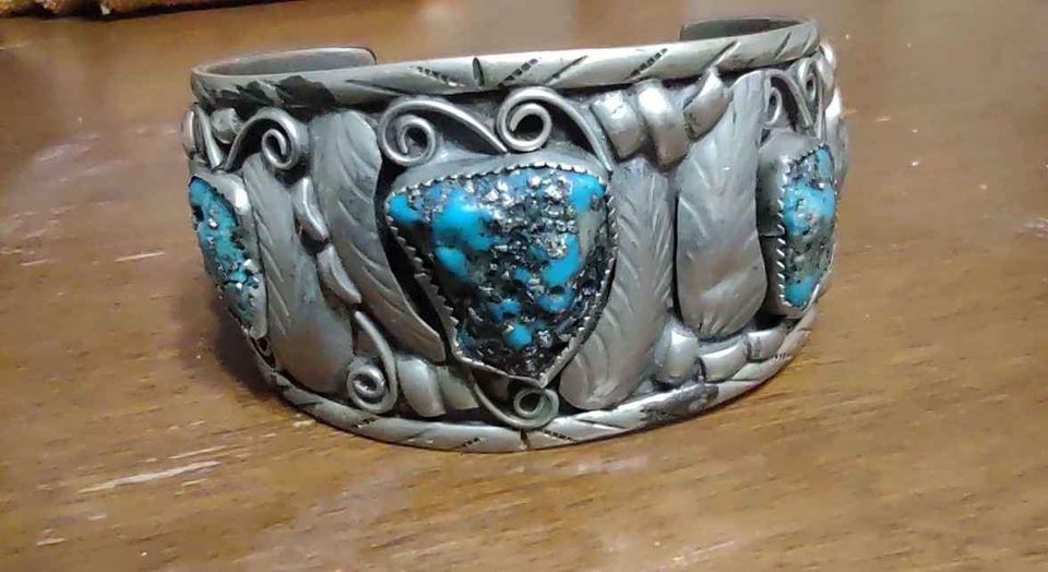 This cuff is listed here on FB. Signed LT MEXICO $300. I DON’T think so. Looks more like pewter and no sterling mark. Nice stones. Comments?