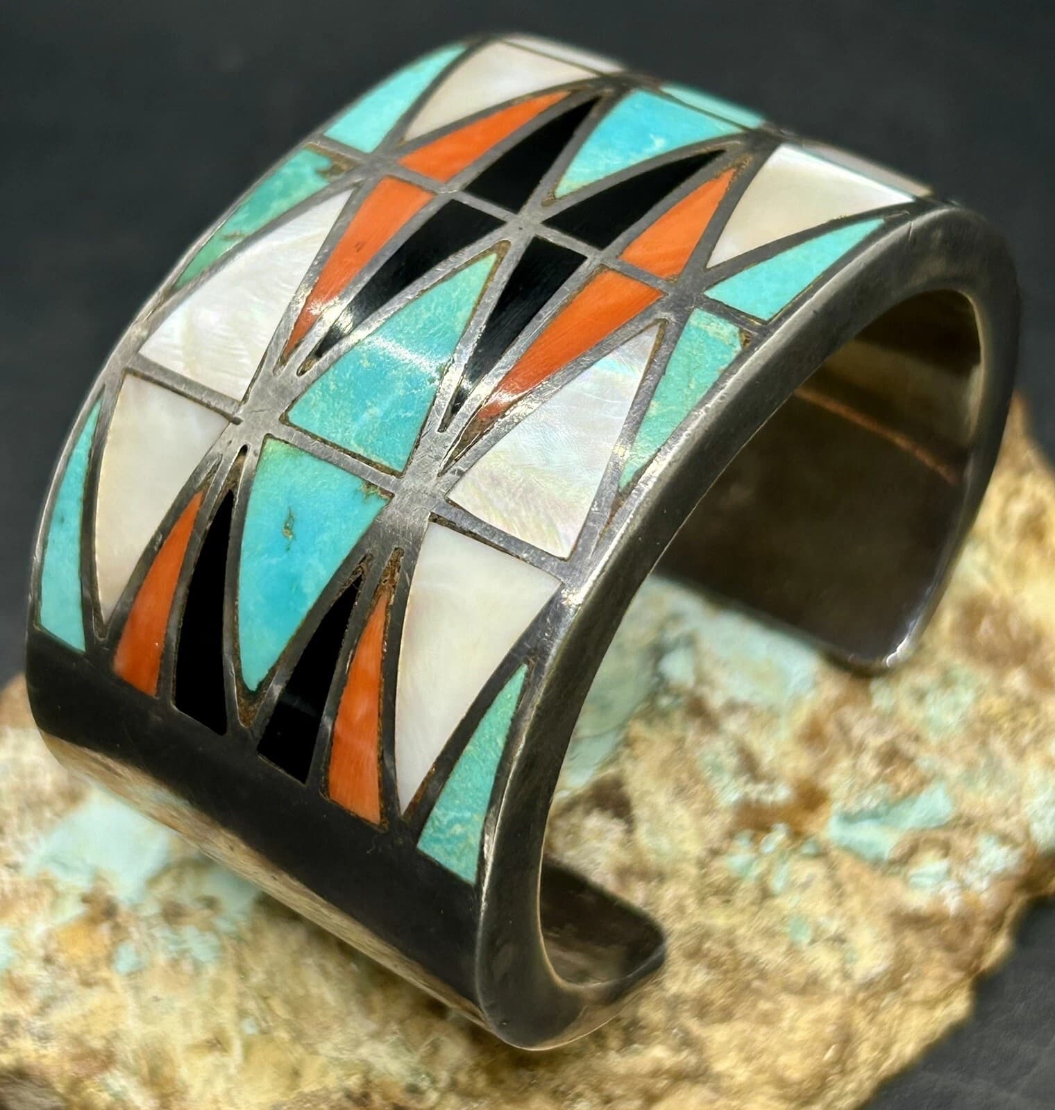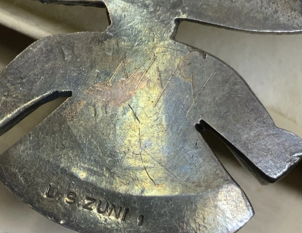 This stunning Knifewing bears “MYY” as well as the “US ZUNI 1” stamp, which was assigned to C.G. Wallace by the Indian Arts and Crafts Board. The IACB stamp definitively dates this beauty between 1938-1943, and the scribed code provides an avenue of further research.
