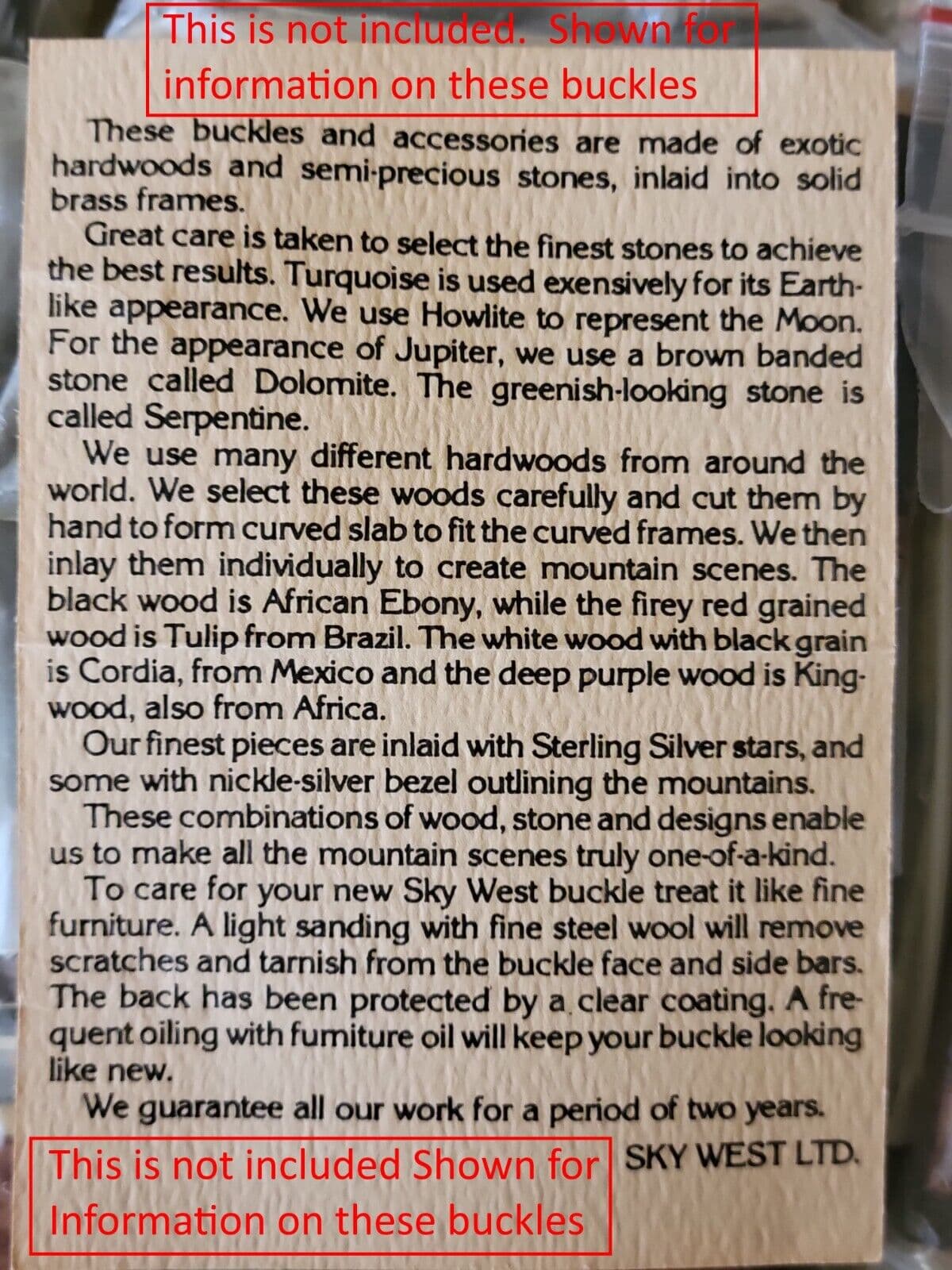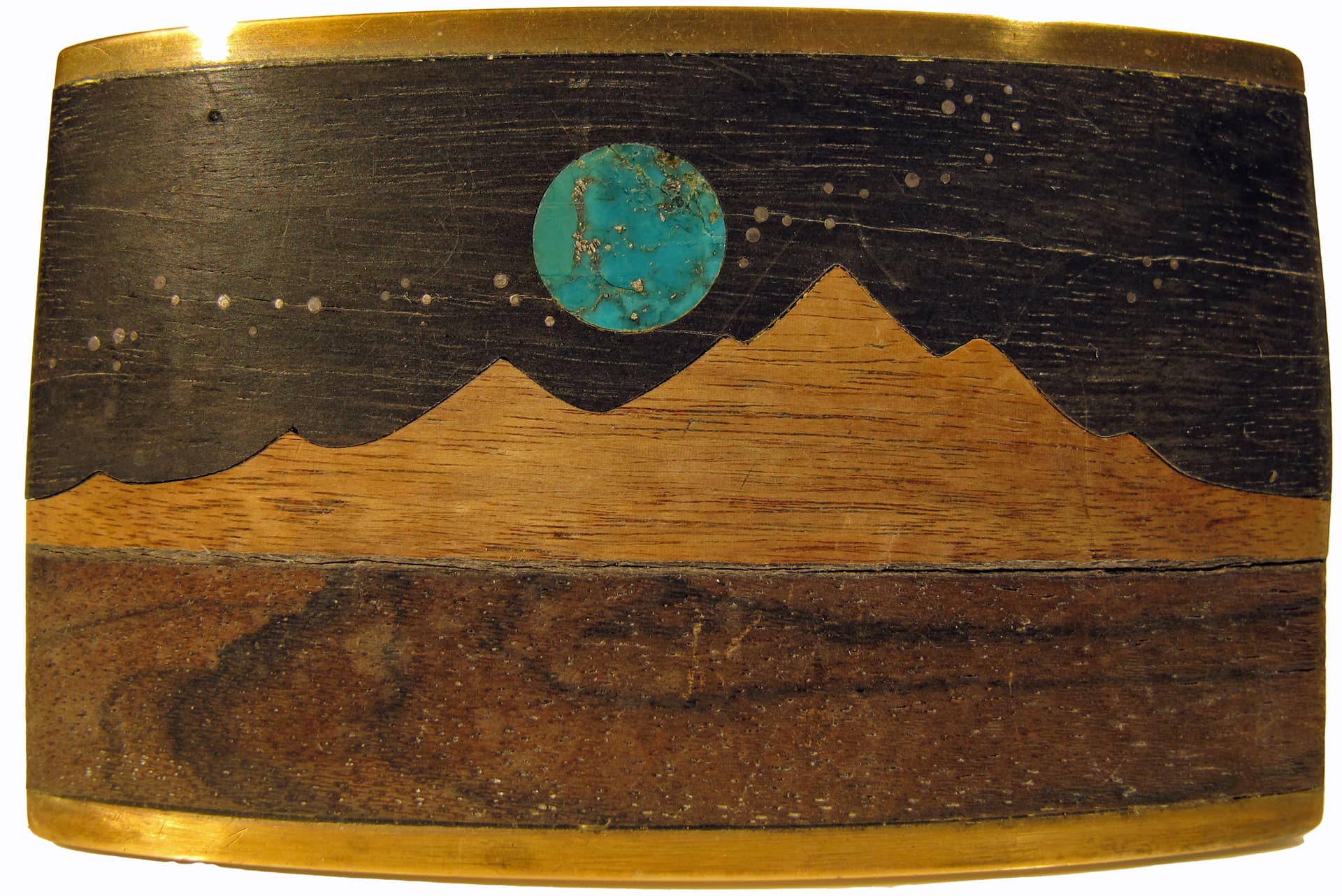 on this buckle 3 different types of wood was used and stained to get the desired effect along with the turquoise disk as well as silver dots inlayed for the night sky on the brass buckle base