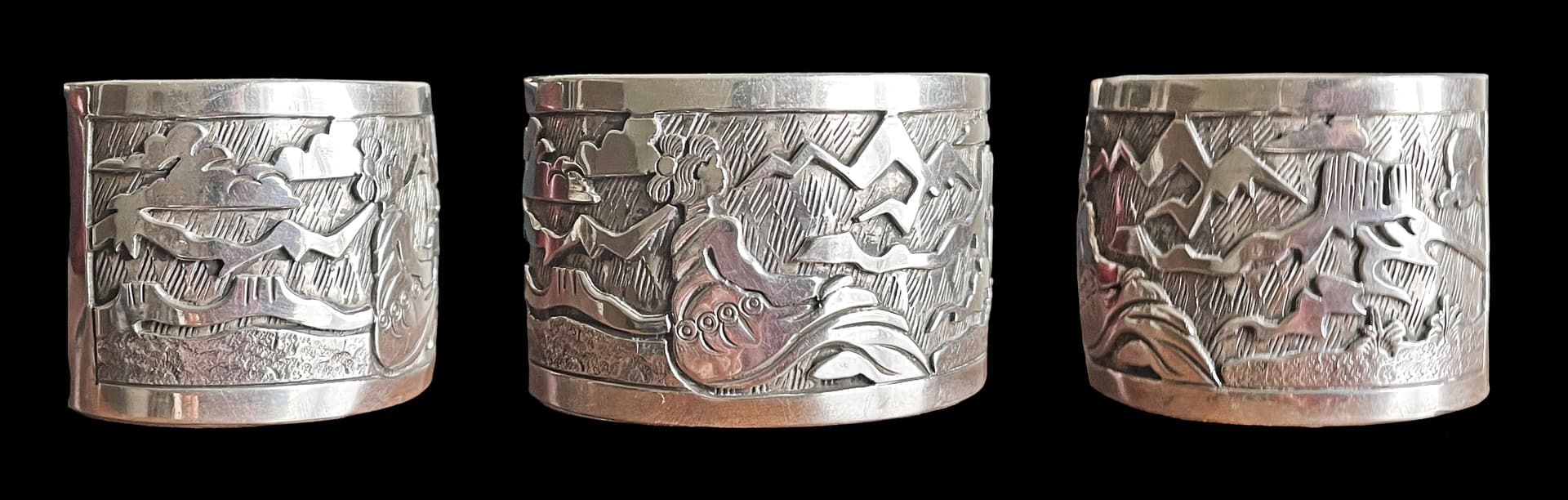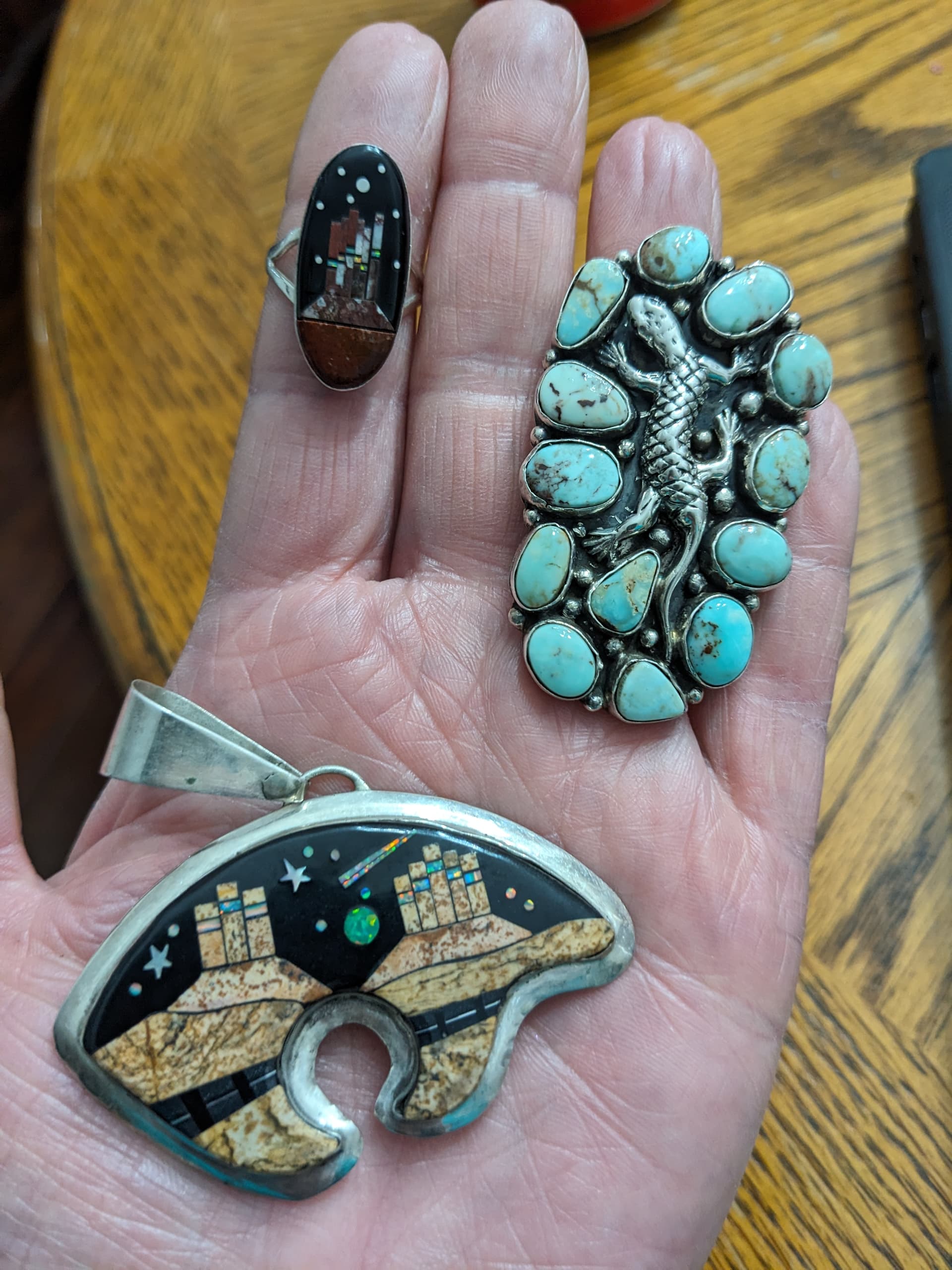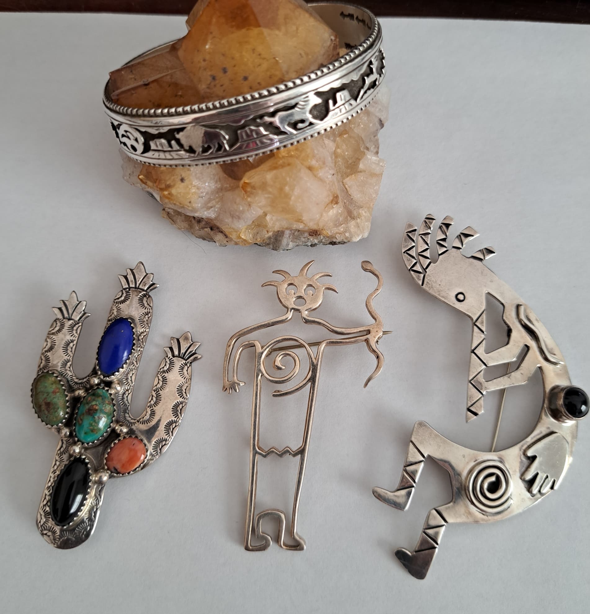 This pin/pendant is my only piece of cactus jewelry, and it has no hallmarks. Perhaps we’d see a shaman snake dancer or flute player petroglyph on the canyon walls. The sterling cuff is hallmarked “CP” by Curtis Platero, Navajo. I bought this cuff directly from him on our first visit to New Mexico. He was so kind and patient. He explained in detail his overlay process to me, and also showed me how to properly put on & remove a cuff from my wrist. If I remember correctly, the imagery represents Monument Valley. It’s one of my favorite cuffs that I wear often.